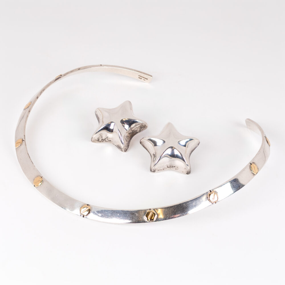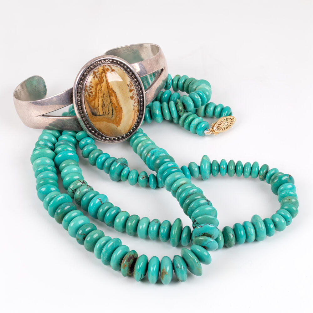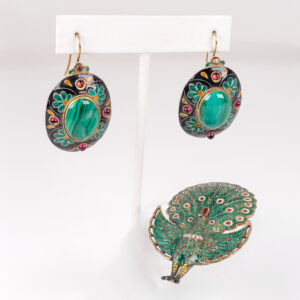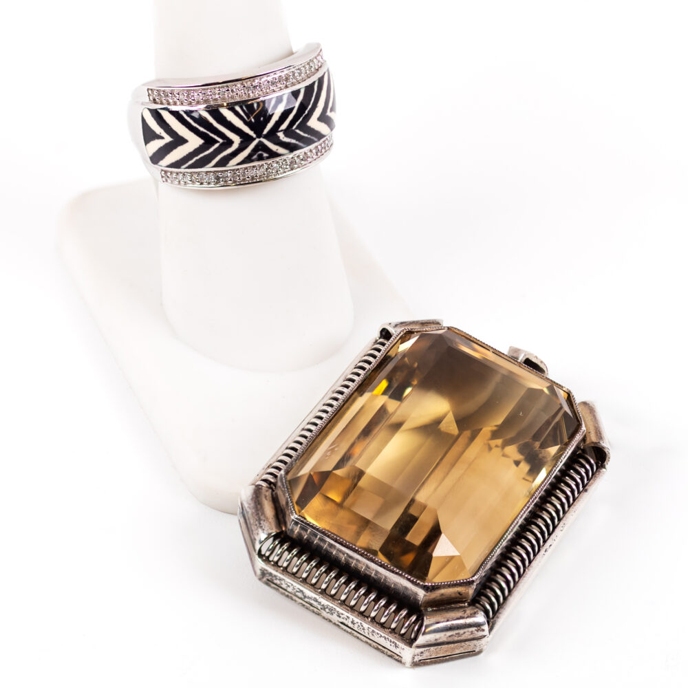 Sterling Silver & Designer: We have a lovely selection of vintage jewelry, starting with an opal cigar band ring, a huge sterling silver citrine pendant, 14k gilt silver Malachite enamel earrings, Michael Valitutti sleeping beauty turquoise neon apatite ring, vintage peacock articulated brooch from Siam, big bold star earring signed Bayanihan, sleeping beauty turquoise cross pendant, moonstone necklace, sterling silver enamel zebra striped ring, we have a selection of jasper to include; a sterling silver jasper cabochon cuff bracelet, Weiss lucite rhinestone bracelet, Swarovski crystal teddy bear brooch and a delightful vintage gold tone rose collar necklace.