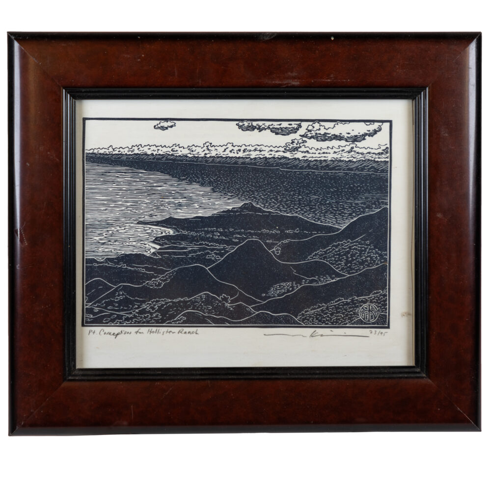 Art: This showroom sale we have a great selection of new pieces including an etching signed J.W. titled “Figure #2”, Bendal antique 22K gold leaf mirror, painting by John Winslow (Born 1949) signed JT Winslow, two lovely Ocean view oil paintings by Susan Schneider Williams, Jose Trujillo (Born 1982) oil on canvas titled, “Rolling Hillside”, print titled “Trogon Variegatus” by John Gould W. Hart, poster of The Mounted Sheriff's Posse of Marin County, a volunteer organization dedicated to search and rescue and community service, set of three advertising posters of Marcel Pagnol's "Marseille Trilogy" films at the Pacific Film Archive in 1973, print by Henry Evans, realist painting by Laura Kradjan, landscape painting by Merangino, Ruby Sterling Morris mixed media "Cult Dancers" 1974, woodblock print by Utagawa Hiroshige (1797-1858), painting by Ariel Parkinson, etching by Mabel C. Robinson (1875 - 1953) - St. Paul's, London, c. 1910, two abstract paintings by William Dole (1917-1983), "Geese and Eagles: Twelve Plates" by American wildlife artist Bruce Lattig (b. 1933), landscape oil painting by Michael Drury, lithograph by Pegge Hopper, signed R. C. Gorman lithograph, Gary Alan Bukovnik lithograph, landscape painting by John Iwerks, (40 year career as a landscape painter, graphic artist and sculptor; his grandfather, Ub Iwerks, was the creator of Mickey and Minnie Mouse), painting by Dudley S. Carpenter, abstract painting by GC Stevens, nautical print by Charles J.A. Wilson titled, “Flying Cloud”, Japanese woodblock print by Kitagawa Utamaro - Takashima Ohisa - Celebrated Beauty, drawing by Rowena Fischer Meeks Abdy (1887-1945), plus more!