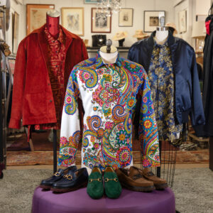 Fashion: We have a fantastic clothing sale coming up… new clothing and accessories include a collection of vintage Yves Saint Laurent including two Paisley sets, Roberto Cavalli animal print dresses, a beautiful collection of clothing new with tags including a Chloe cream and gold silk dress, clothing by Francis Valentine, Veronica Beard, Printfresh, Rixo, Kobi Halperin, See by Chloe, Robert Graham, Chan Luu, a beautiful Max Mara navy wool jacket. Other items include a Carolina Herrera floral dress, a super cool Made Worn rhinestone Rolling Stone mouth logo T-shirt, vintage black fringe jackets by Winlet and Wilson, an H&M Versace black leather stud jacket, fur coats including Saga Mink, a floor length fur vest and a collection of fun vintage clothing. Accessories include colorful summer hats, a new pair of floral espadrilles by Veronica Beard with box, a pink See by Chloe handbag, Betsy Johnson backpacks and handbags and a collection of designer sunglasses. For the men a pair of green suede Gucci loafers, Ferragamo loafers, organic cashmere sweaters and vests by N Peele and two Burberry quilted coats. Other designers include Salvatore Piccolo, Kardo, Tellason, Golden Bear, Paul Stuart, Robert Graham, Johnson leathers, Bather and Paul Smith. And much more!