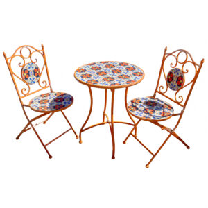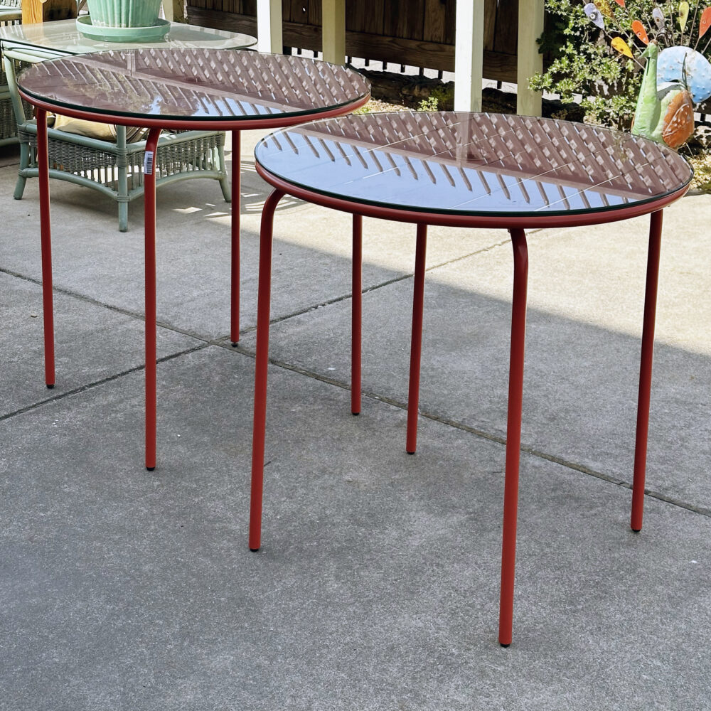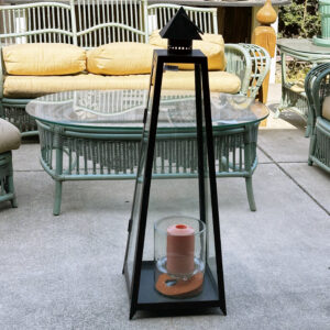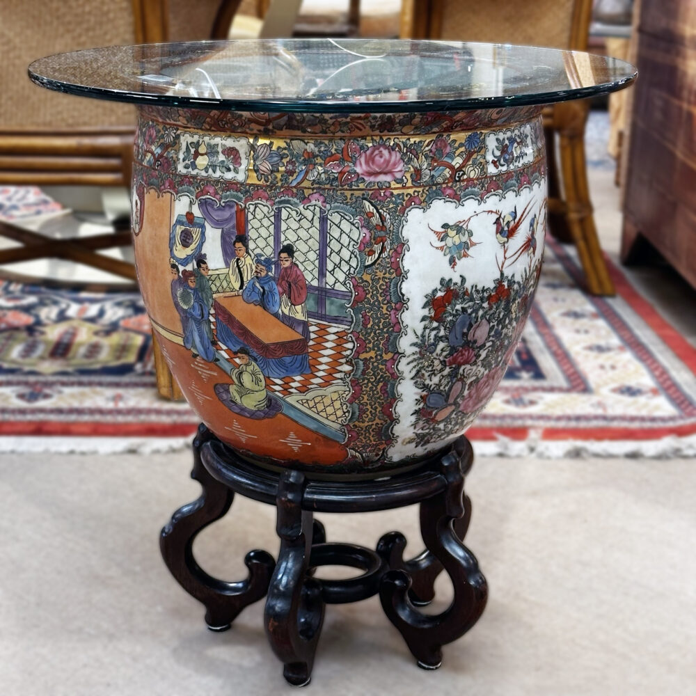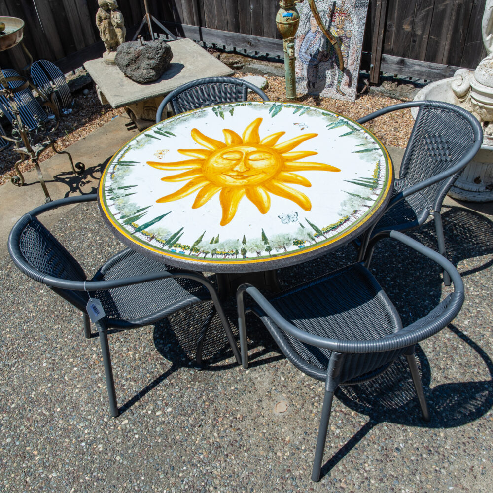 Patio: Summer is in full swing so why not enjoy it seated at your hand-painted Italian glazed stone table! Other patio pieces include a St. Petersburg mosaic bistro set, pair of orange metal patio tables with glass tops, a larger than life candle lantern, floral painted can for garden cuttings or whatever you like, a pair of teak benches with cushions and assorted pots and urn.