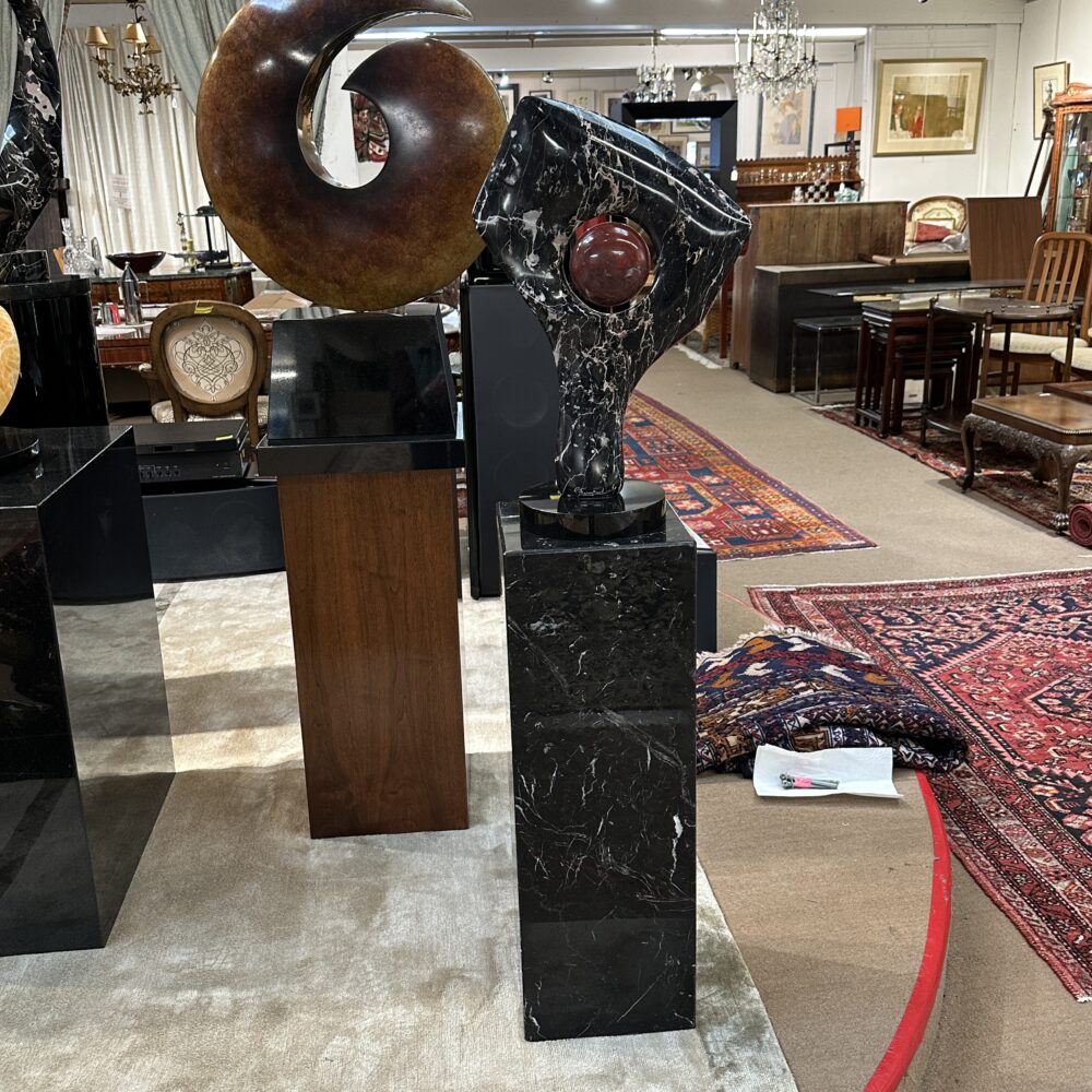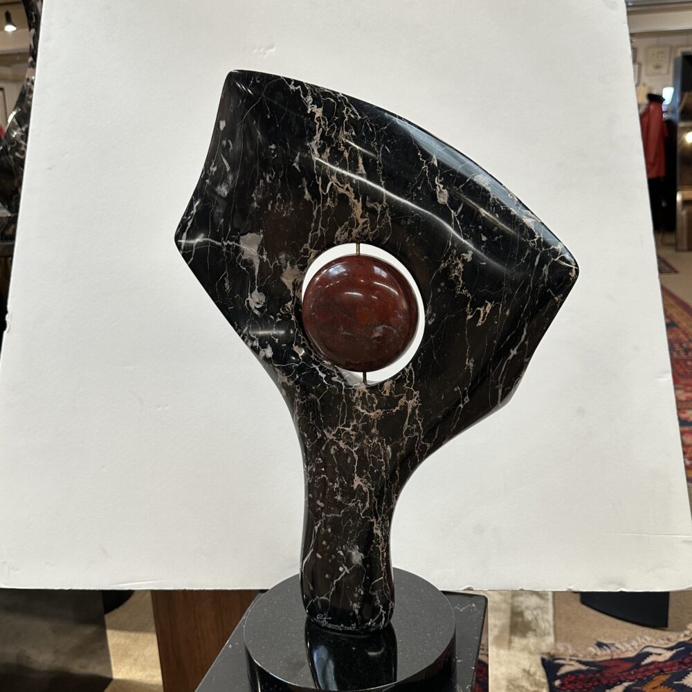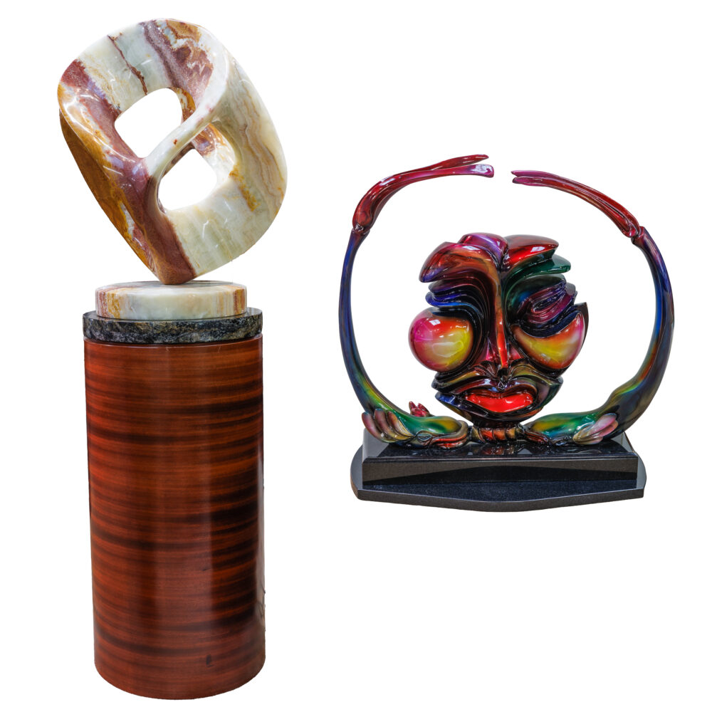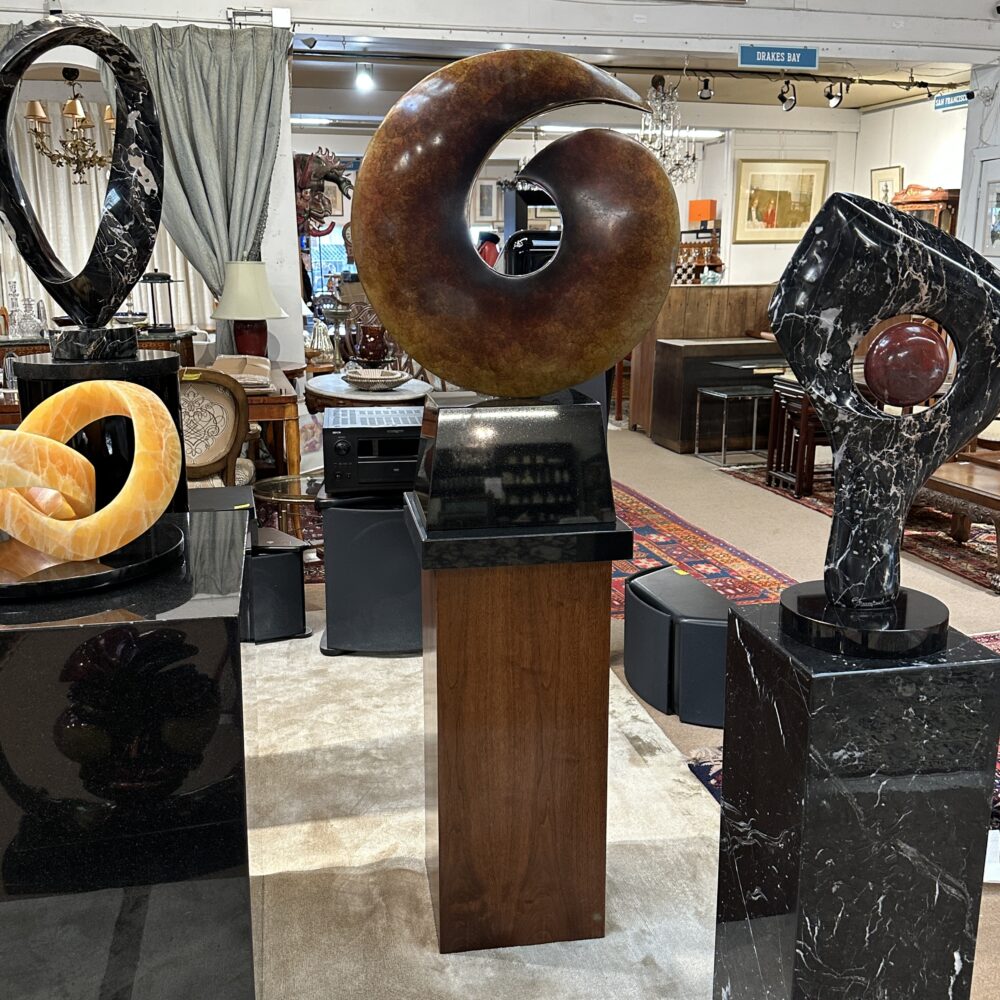 A stunning collection of artistry for the home — stone sculptures by Healdsburg artist T. Barny, bronze “Archer” by Thomas Holland (1967), Turnwood bowl by Jerry KermodeBaccarat stemware, and Arthur Court serving pieces.
