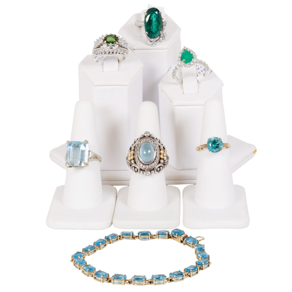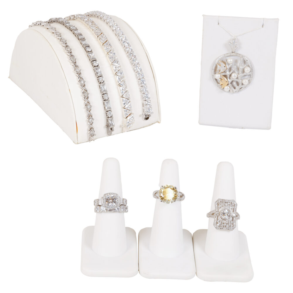 The selection also includes sterling silver amethyst tennis bracelets, Polish amber cuffs, vermeil emerald necklaces, and yellow diamond simulant solitaires — radiant designs to mix, match, and collect.