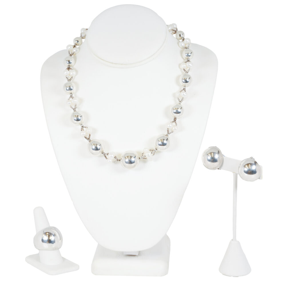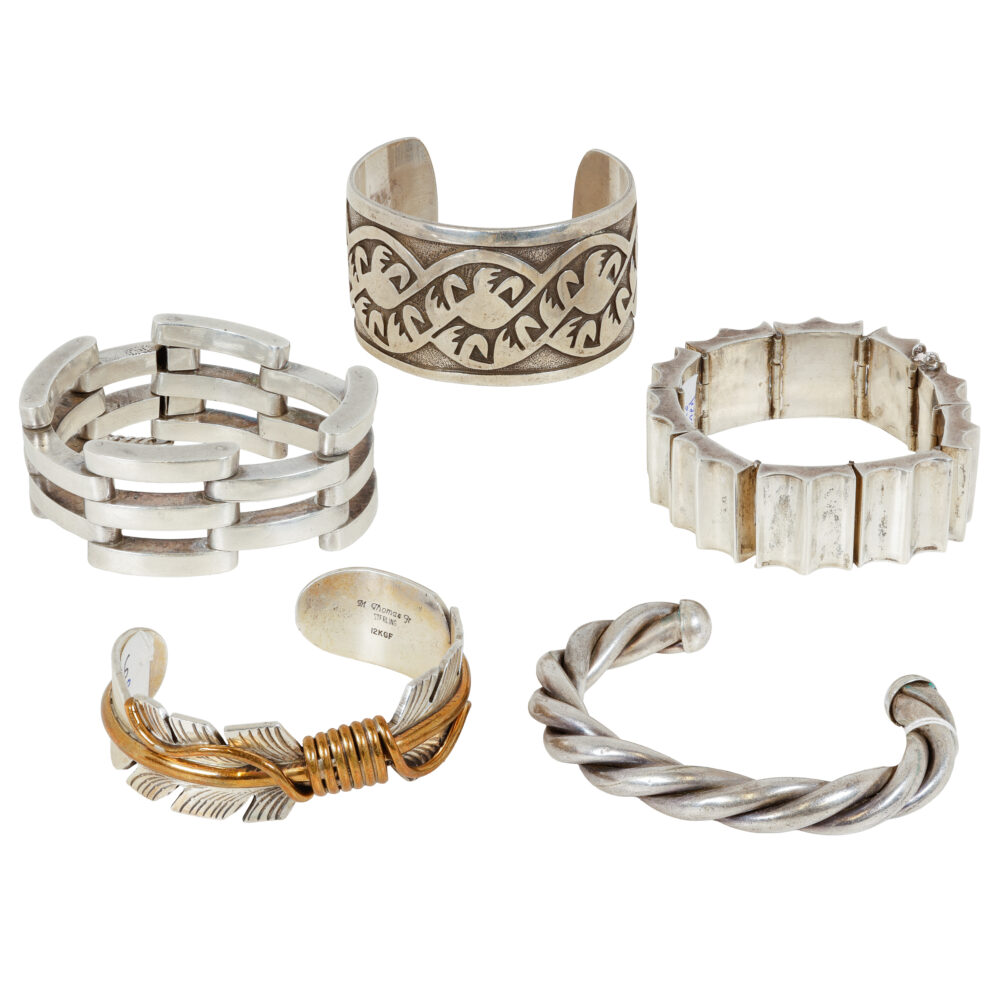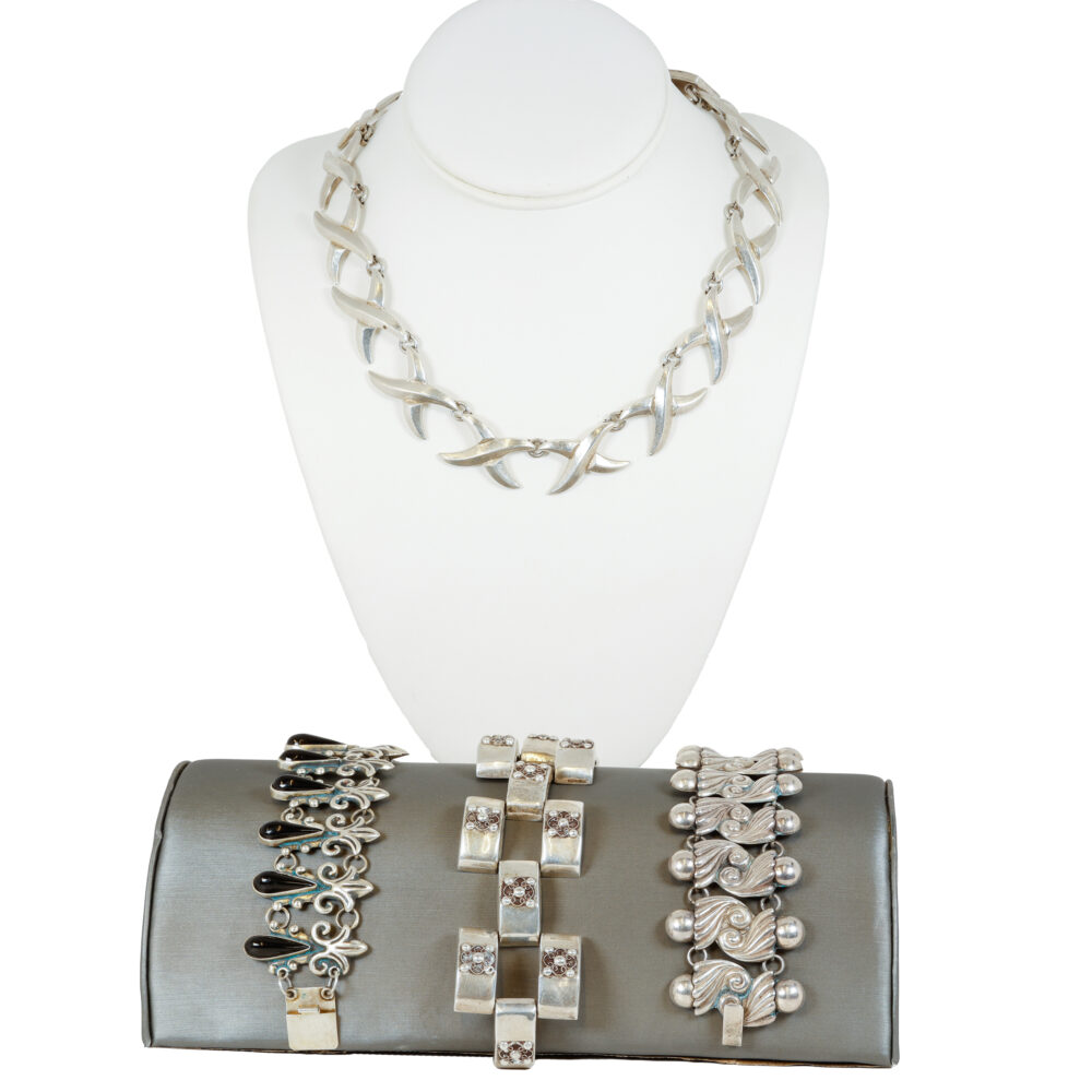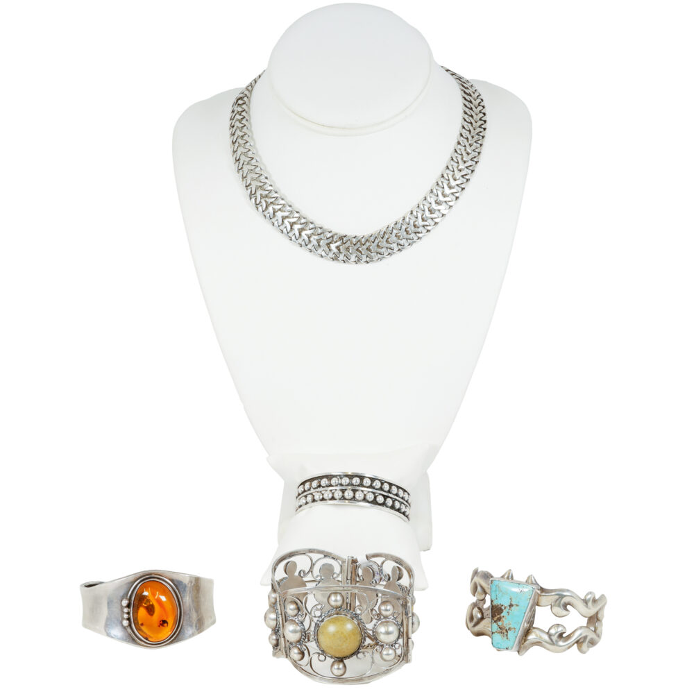 Sterling Silver & Designer Jewelry: Indulge in statement-making style with striking sterling silver and designer pieces. Discover a vintage Navajo sand-cast cuff with turquoise, Hopi etched cuff bracelet, and Zuni turquoise cuff. Elevate your look with Christian Dior dome earrings, vintage Mexico “X” link choker, and an array of chunky vintage bracelets.