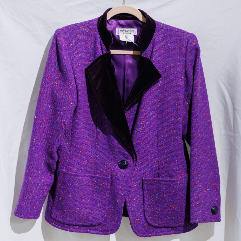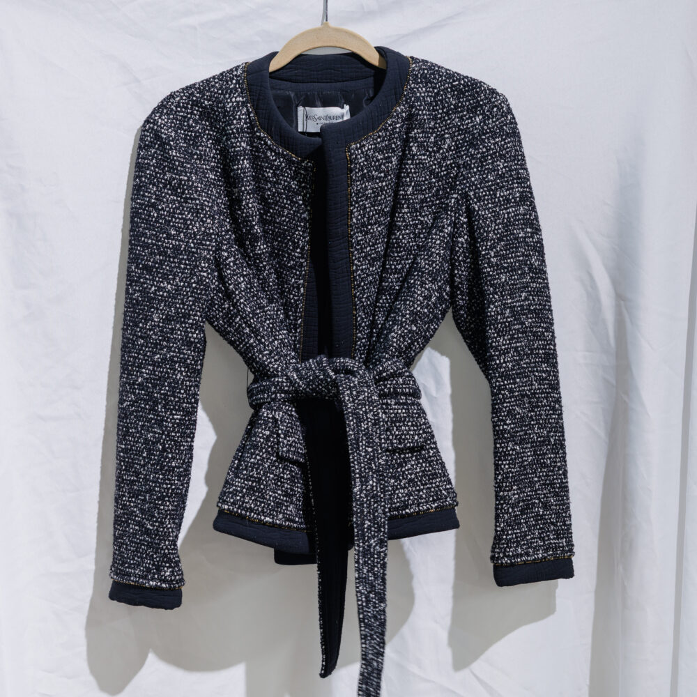Step into timeless elegance with a curated fall fashion collection. Featured pieces include Yves Saint Laurent jackets and coats — from a black satin trench to a vintage fur-trimmed raincoat — plus a long red leather coat by St. John.