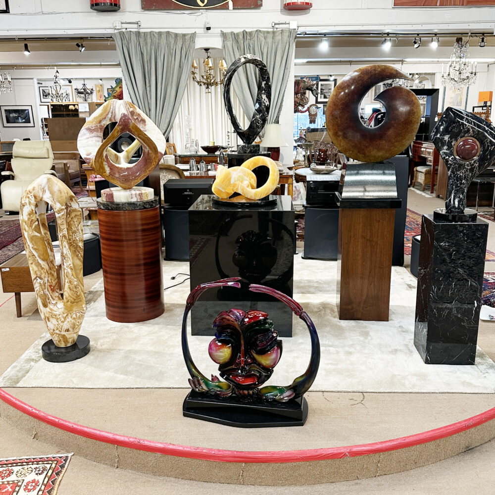 Don’t miss Murano glass sculpture by Donald RiggsNeil & Vivian Blanck painted spheres, Shearwater pottery baseball figures by James “Mac” Anderson, and Armand Leveel bronze Renaissance soldiers. Add character with antique looms, ticket booths, and African granary doors — each with its own story.