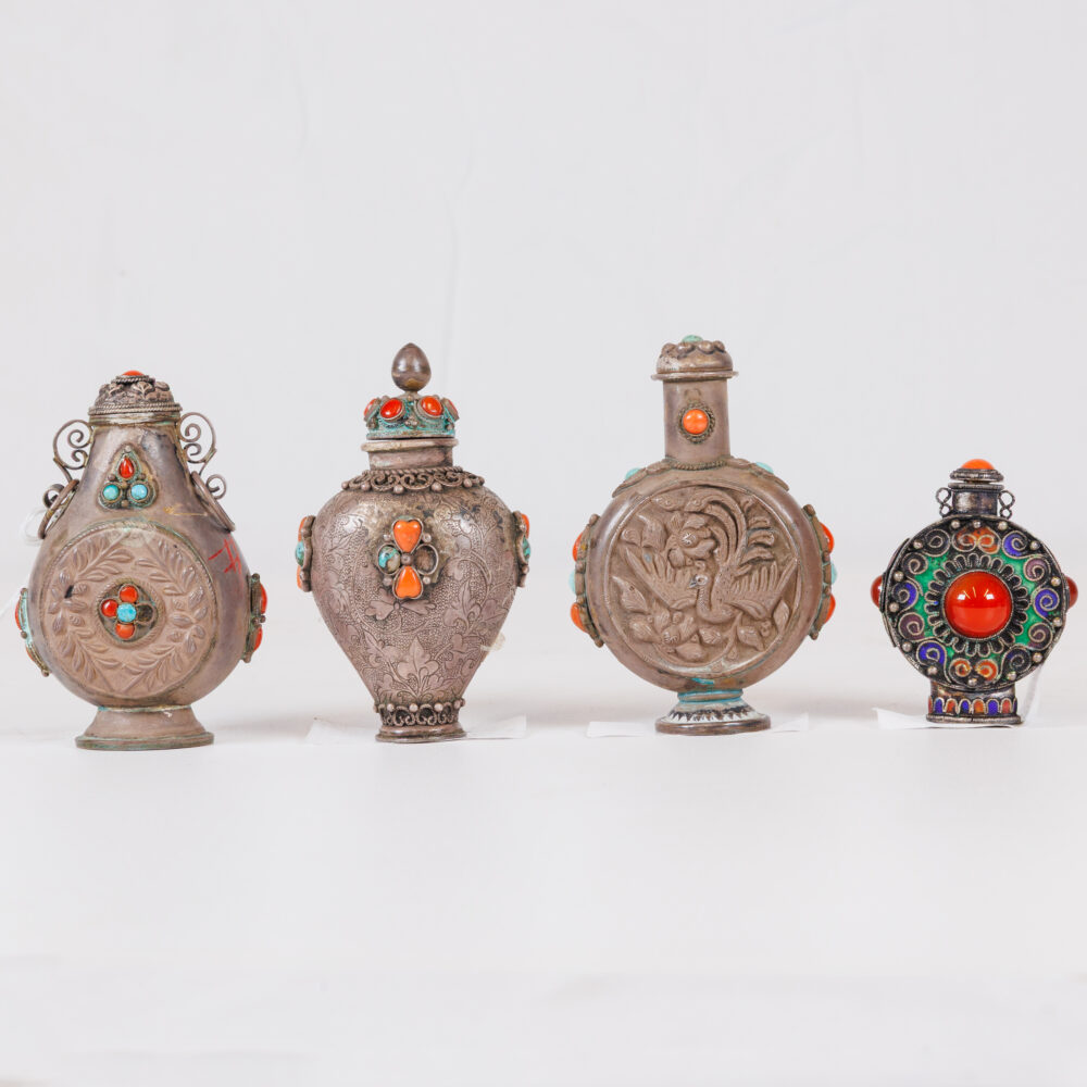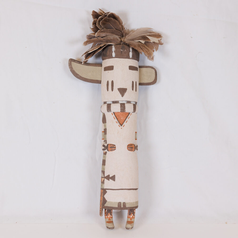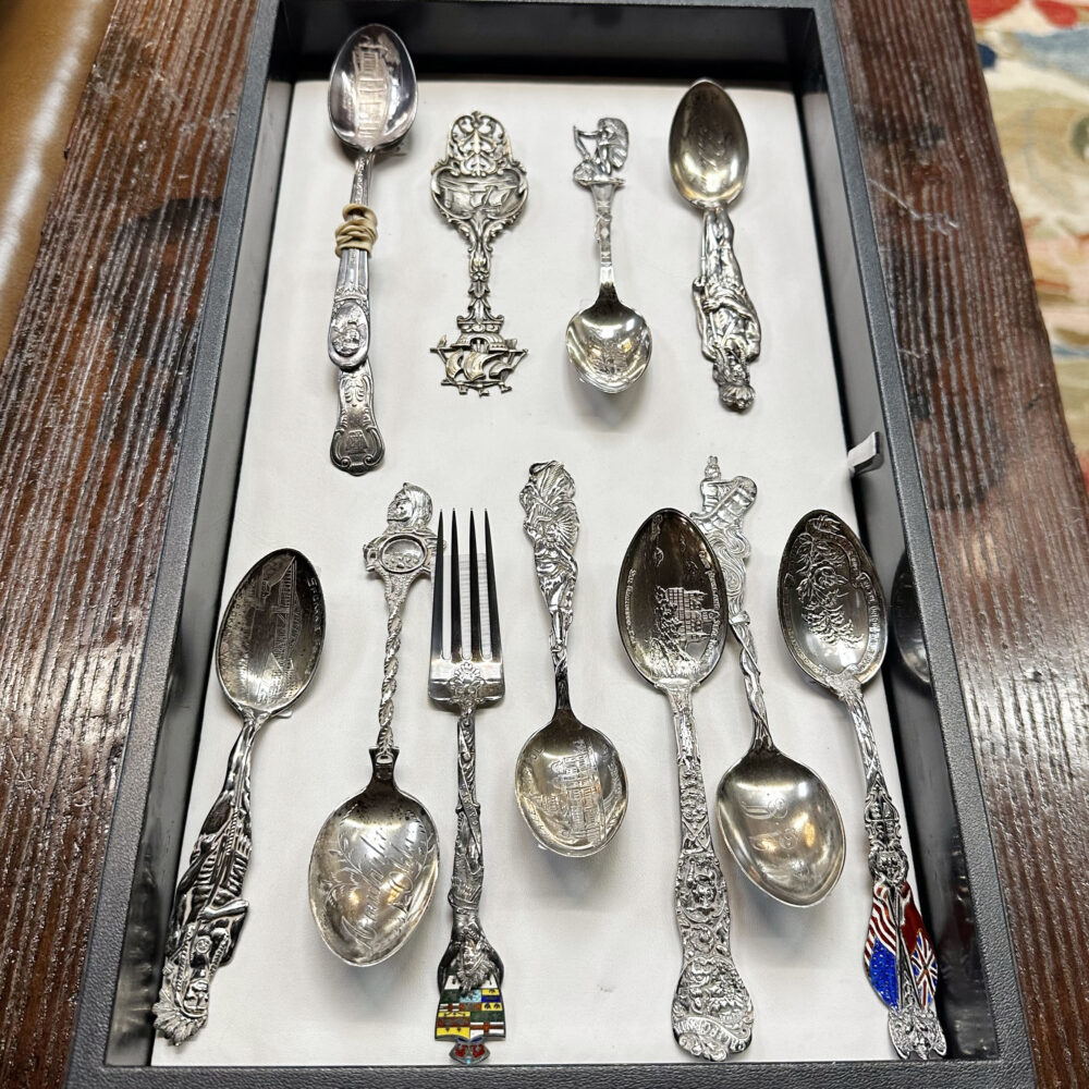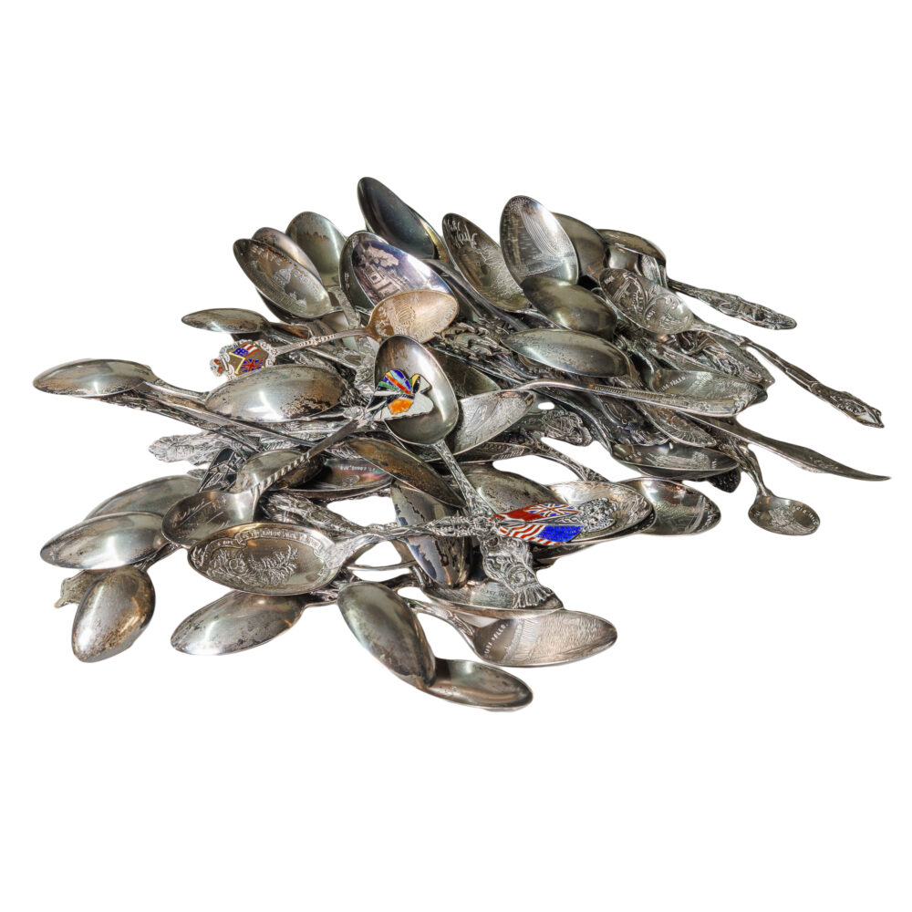 Sterling souvenirs: Large lot of souvenir spoons, some with vibrant enamel. - Cultural treasures: Northwest Coast totem, large Kachina doll by Hopi artist Manfred Susunkewa, pottery pieces, Asian snuff bottles, and soft stone carvings.