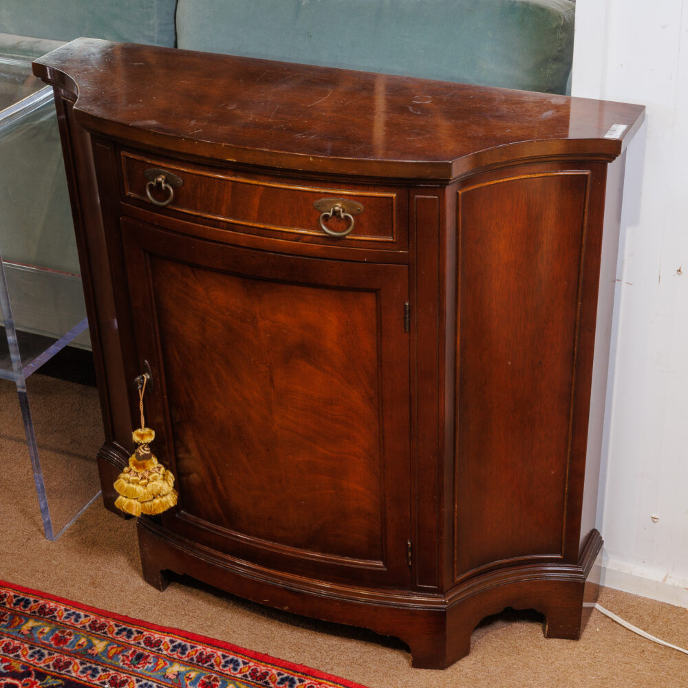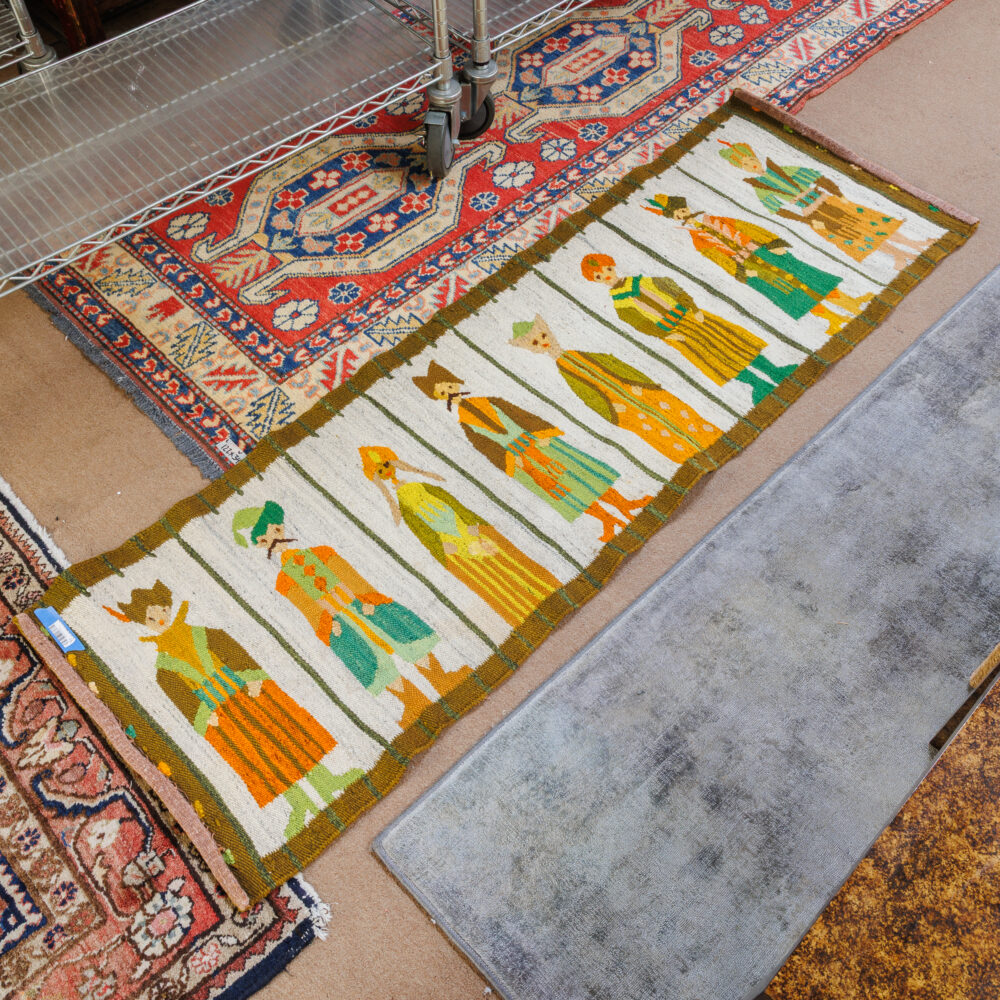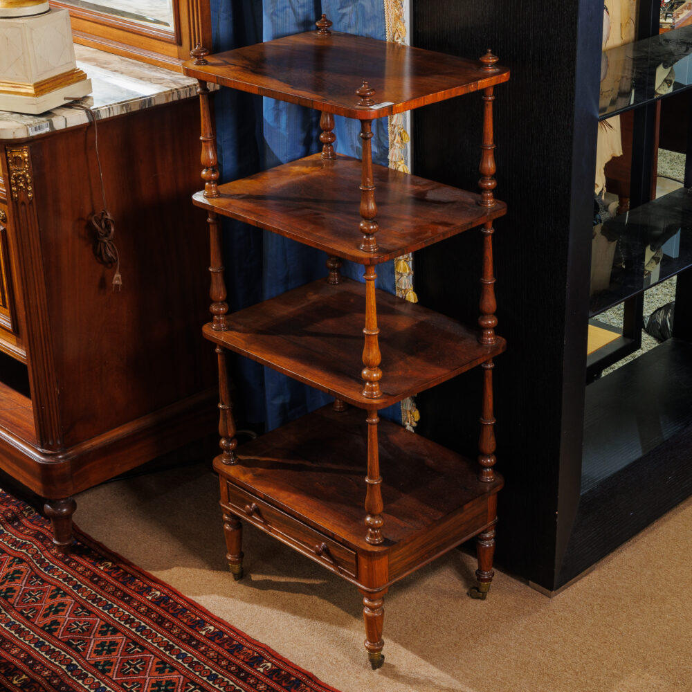 - Antique treasures: Hepplewhite embroidered chair, Victorian Eastlake marble parlor table, Eastlake settee, English mahogany bachelor’s chest, carved Mayan rocking chair, walnut four-tier whatnot.