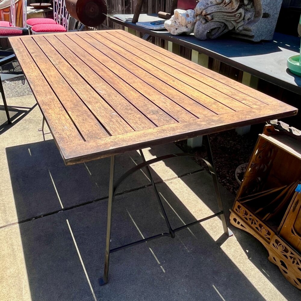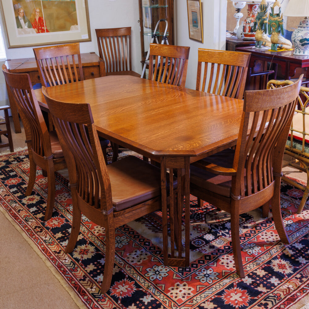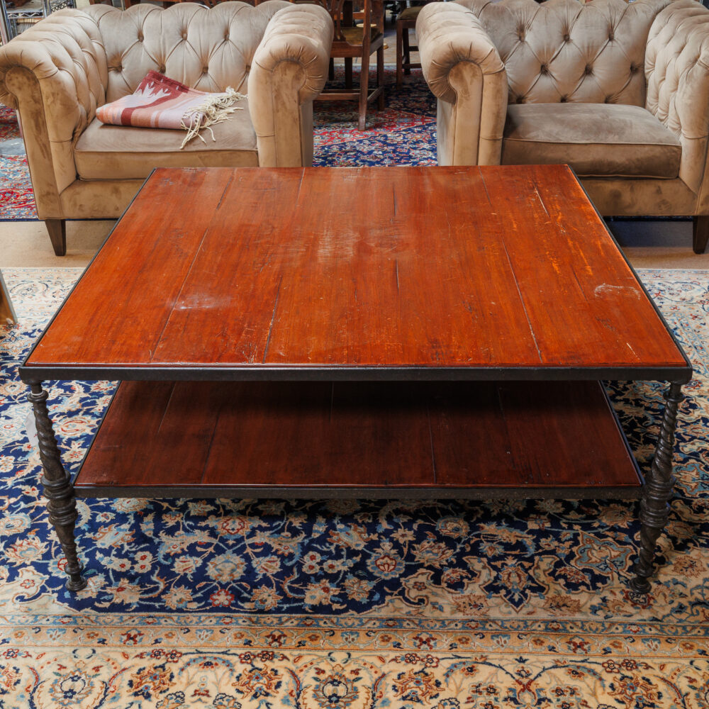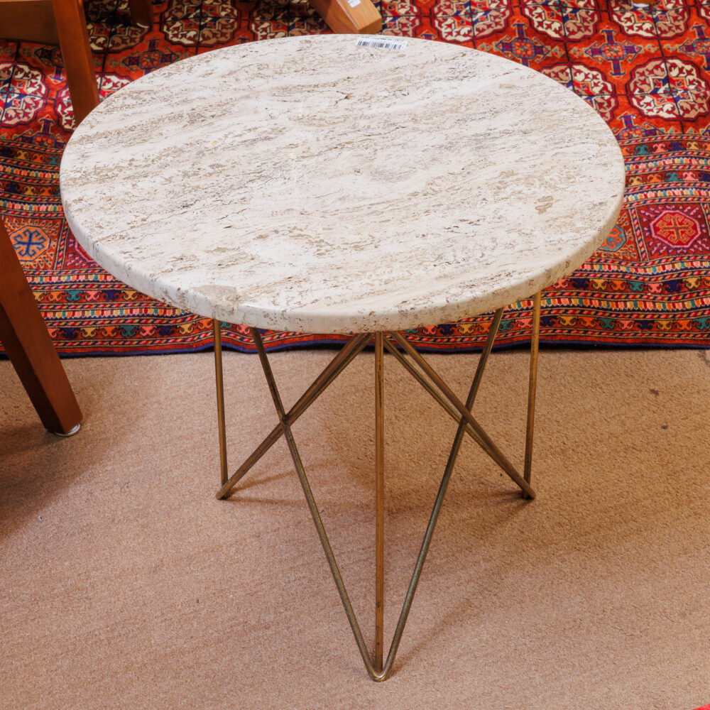 - Unique finds: Travertine side table by Martin Perfit for Rene Brancusi, lucite shelf unit, butcher block cart, lectern book stand, Mission-style table set, Asian-style coffee table, vintage Danish teak stools, antique flour bin table.