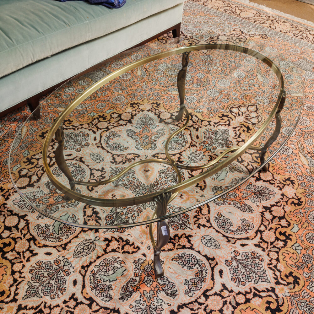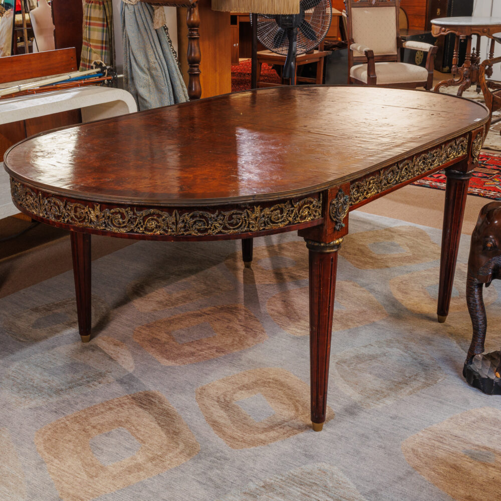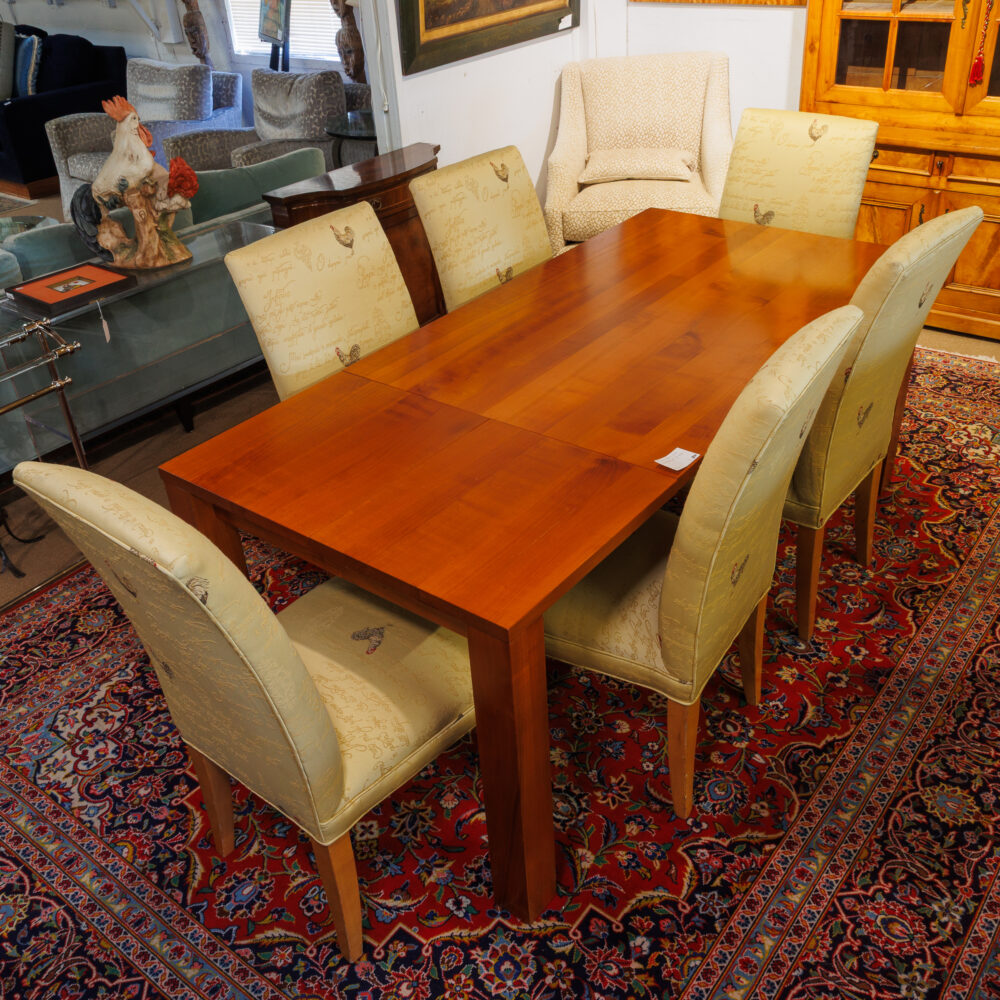- Statement seating: Forest-green mohair sofa, Ethan Allen leather sofa, French Ormolu dining table, Chippendale dining chairs, rooster-upholstered dining chairs, rattan side chairs.