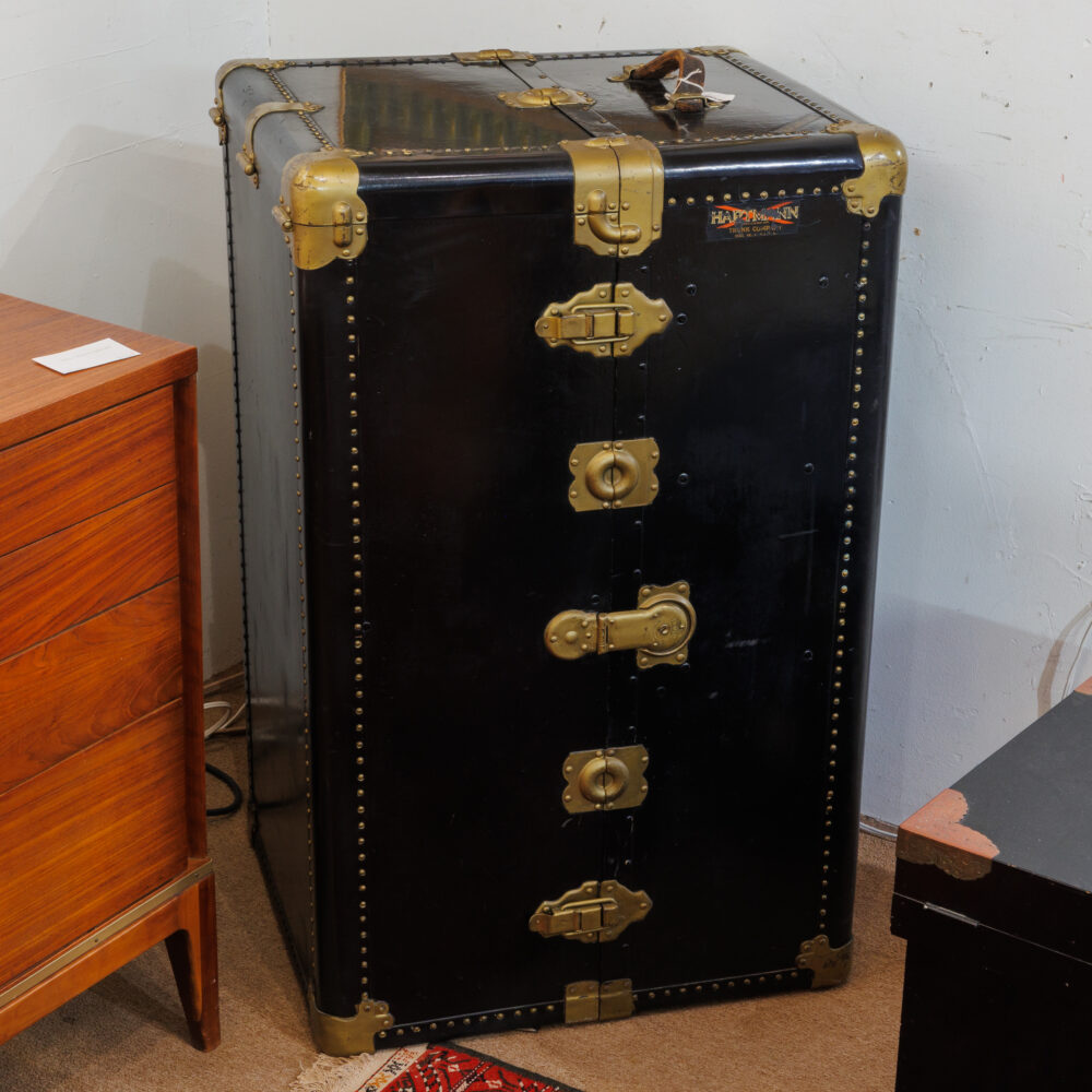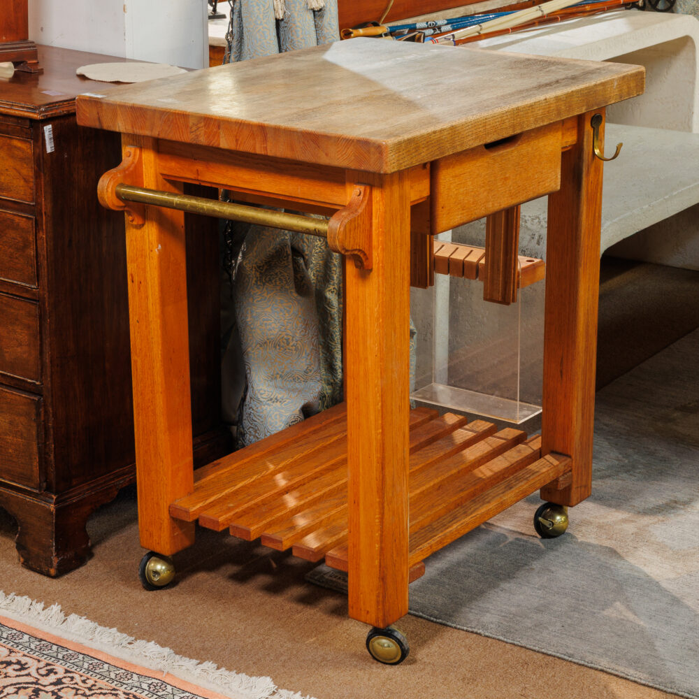 - Practical treasures: Antique flour bin table, butcher block kitchen cart, Salton-style hot table, lucite shelving unit, Hartman trunk & suitcase, Waterworks towel stand, railroad wall clock, Pendleton blankets.
