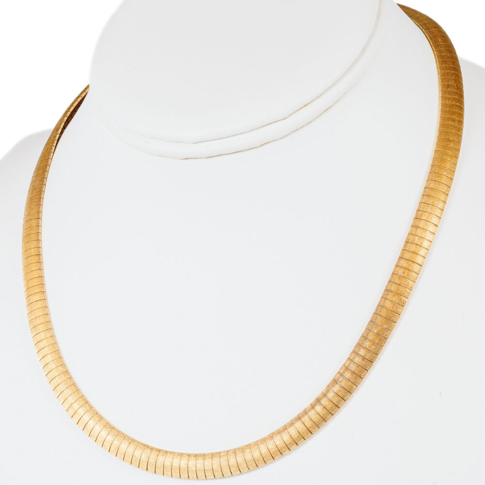 - Golden statement pieces: 18k solid gold omega choker necklace with matching 18k leaf post omega earrings.
