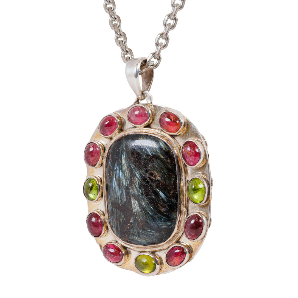 - Showstopper pendant: A one-of-a-kind Hawk’s Eye quartz surrounded by pink and green cabochon tourmalines.