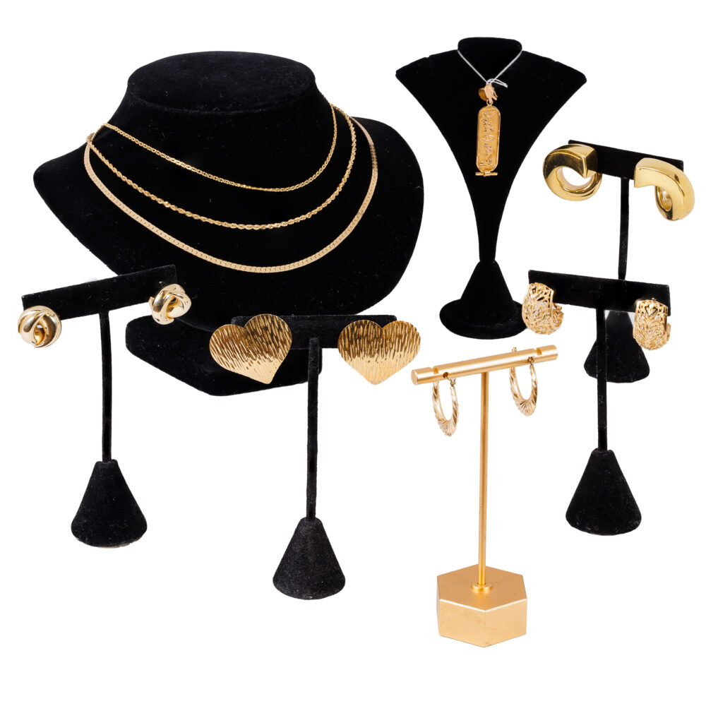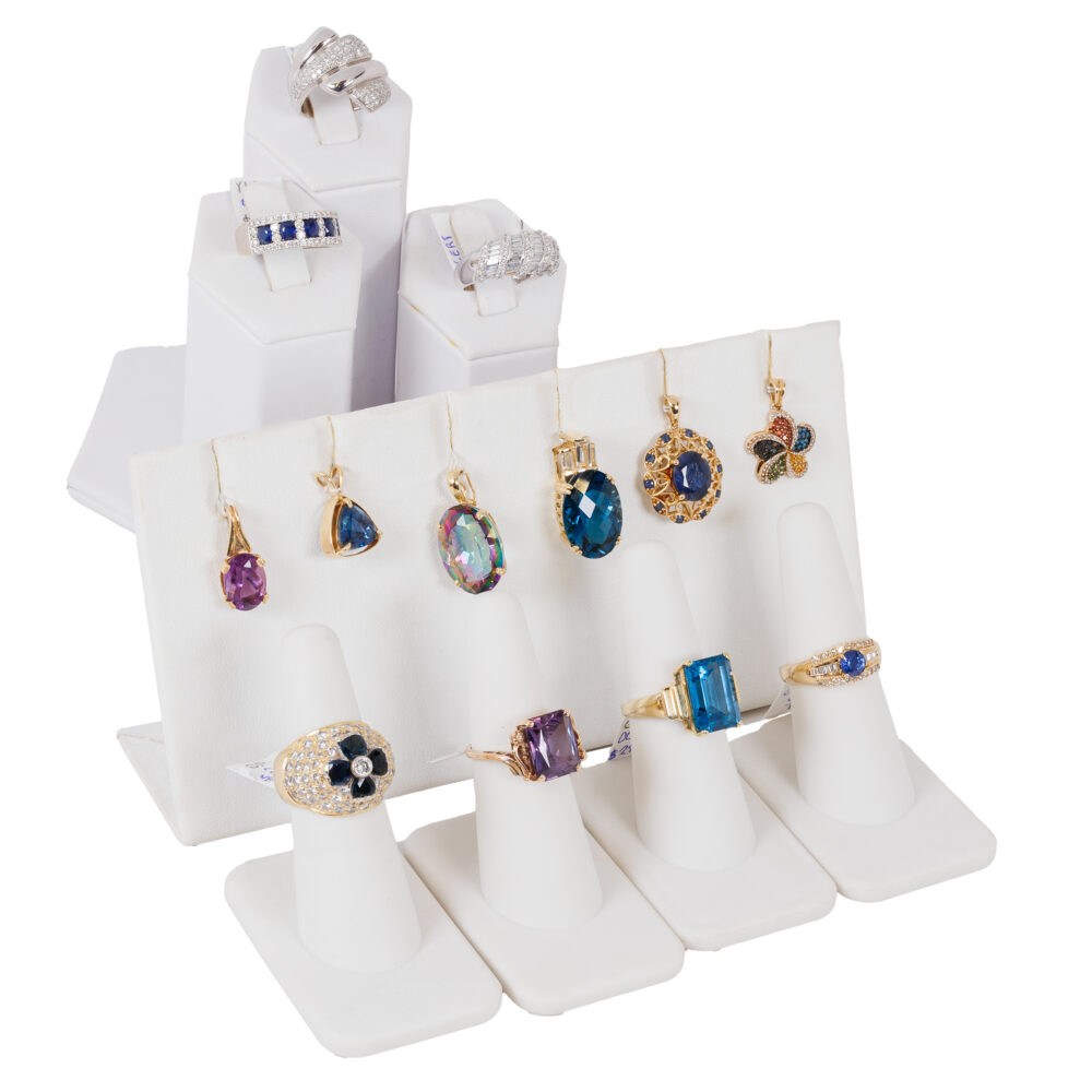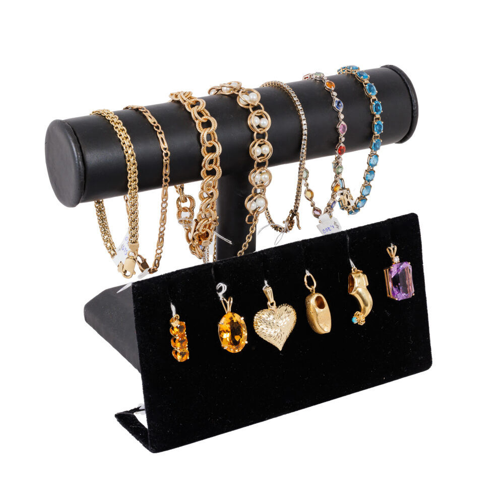 - Collector’s favorites: 10k synthetic alexandrite ring and a delightful assortment of colorful gemstone pendants and fancy-link 14k bracelets.