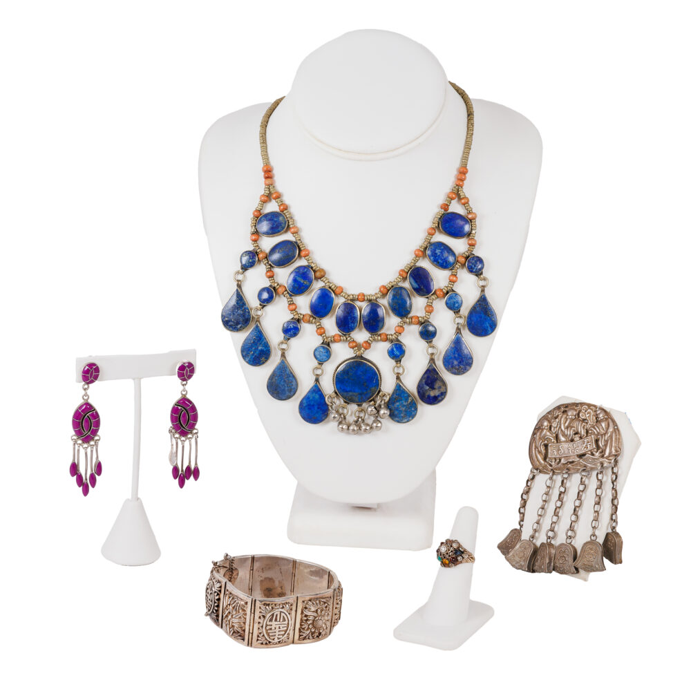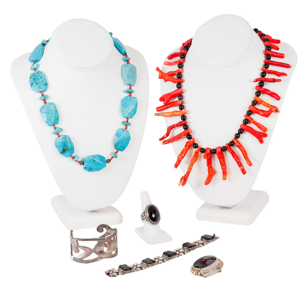 - Artisan and global flair: Joseph Esposito mesh CZ choker necklace, graduated rope chain, bold teardrop sterling earrings, Navajo onyx ring by Orville Tsinnie, branch coral necklace, Taxco Mexico onyx pendant/pin, turquoise bead necklace, and a vintage Afghan lapis lazuli necklace.