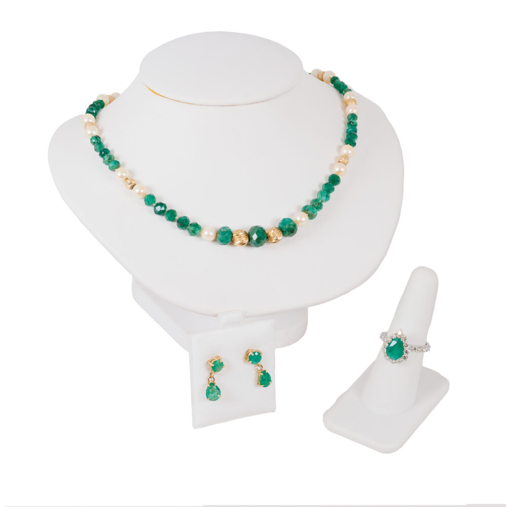- Emerald elegance: 14k faceted emerald & pearl beaded necklace, 14k white gold emerald & diamond ring.