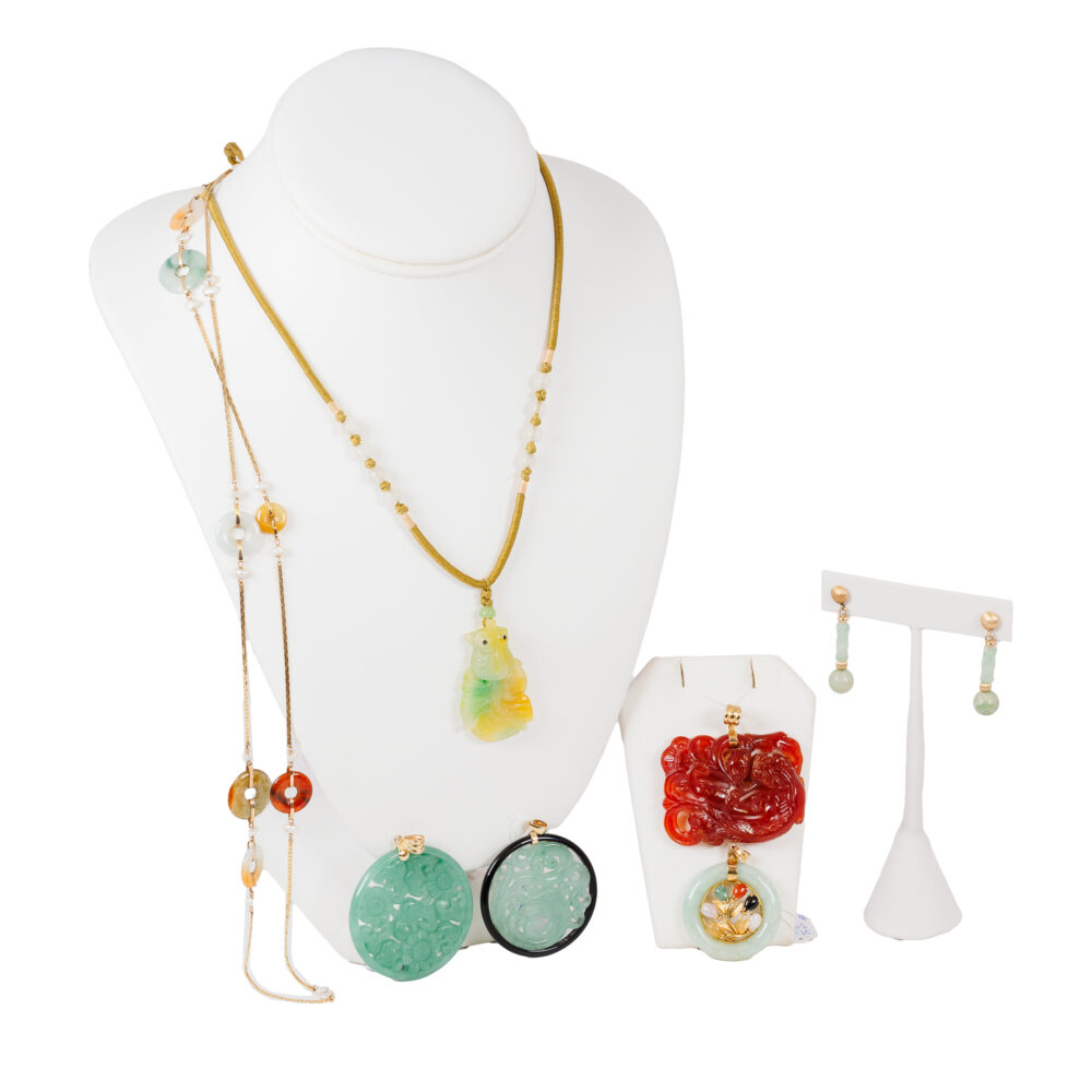 - Unique jade creations: 14k carved red jade pendant, jade Buddha pendant, and a multi-color jade circle pendant.