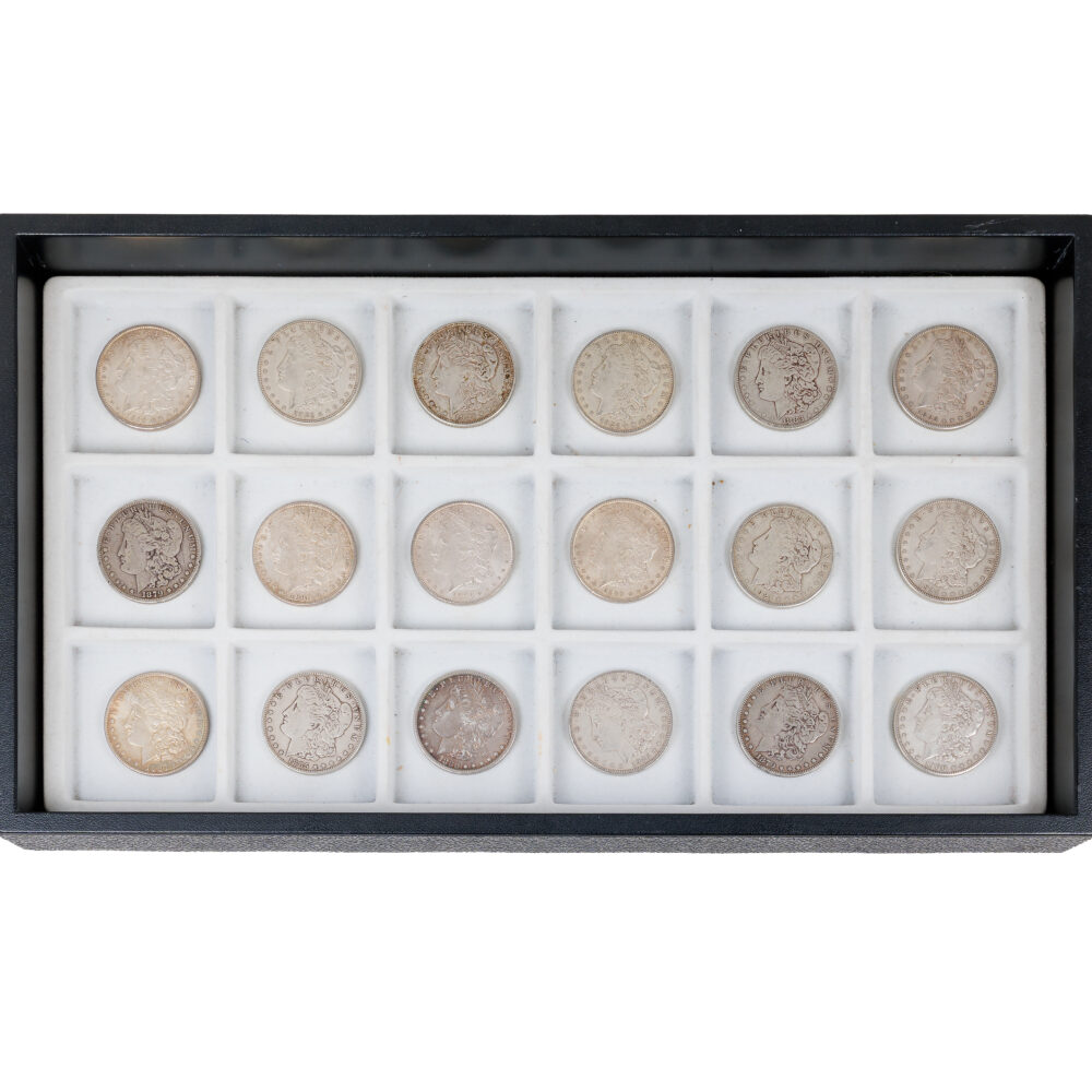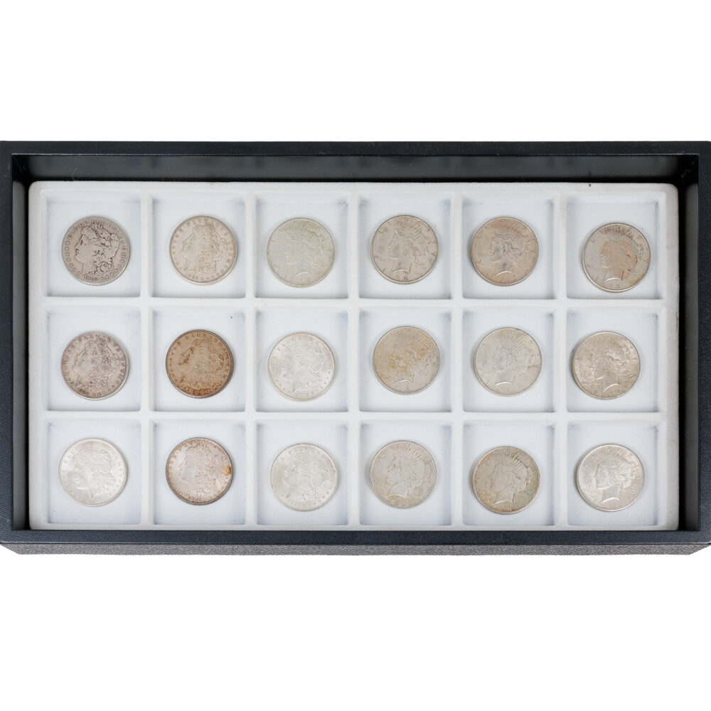 - Coins & currency: U.S. 90% and 40% silver coins, Morgan & Peace dollars, Walking Liberty, Franklin & Kennedy half dollars, first-year 1986 Silver Eagle 1oz round, plus world coins, medallions, and tokens.