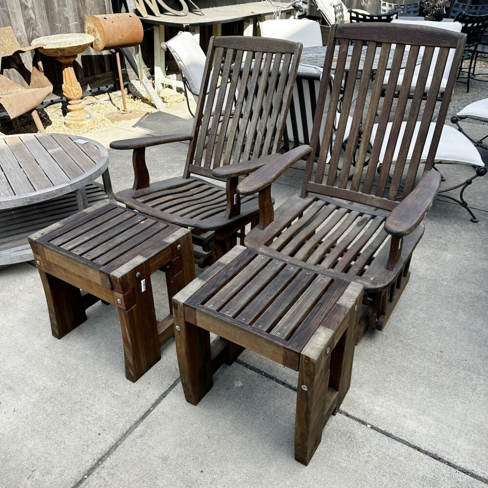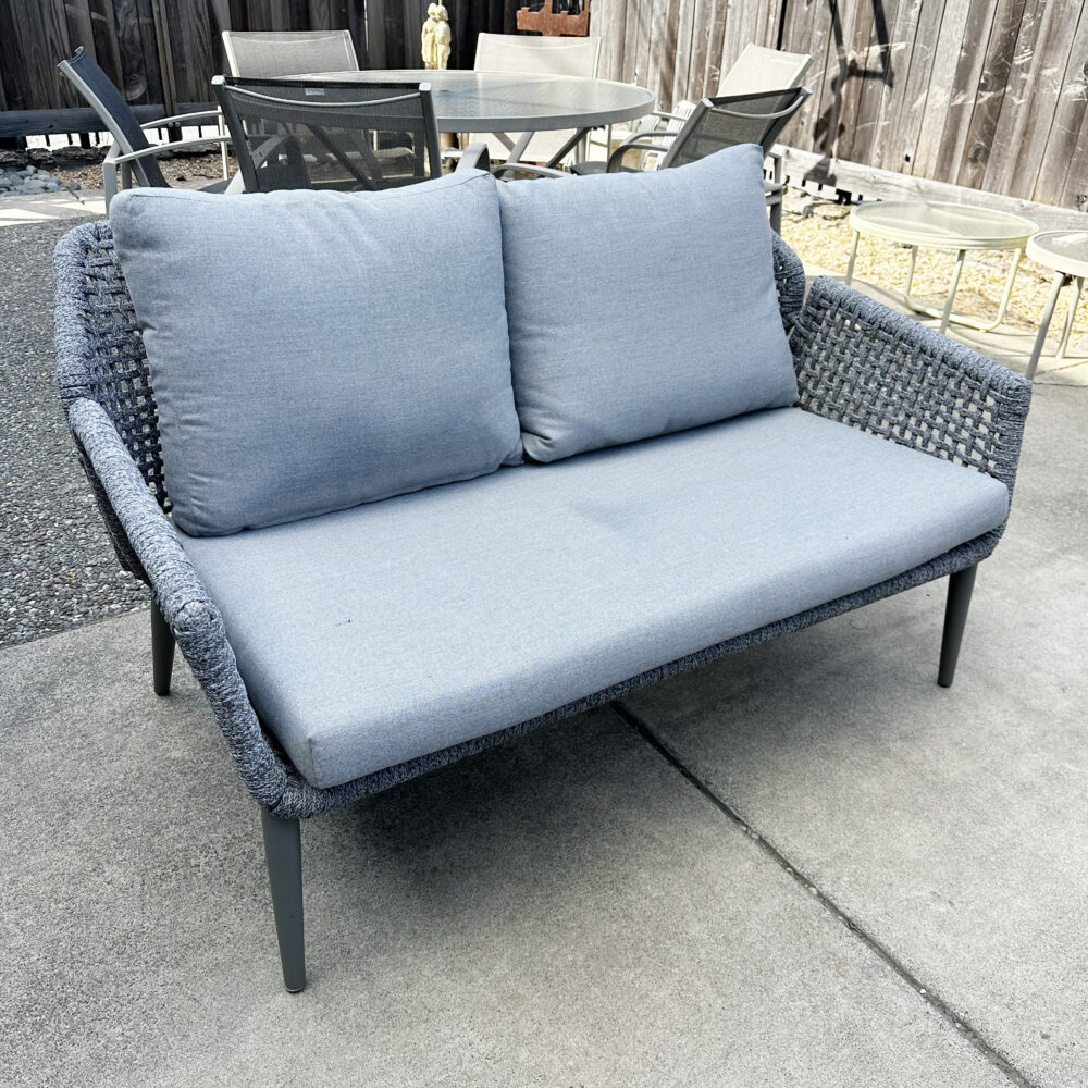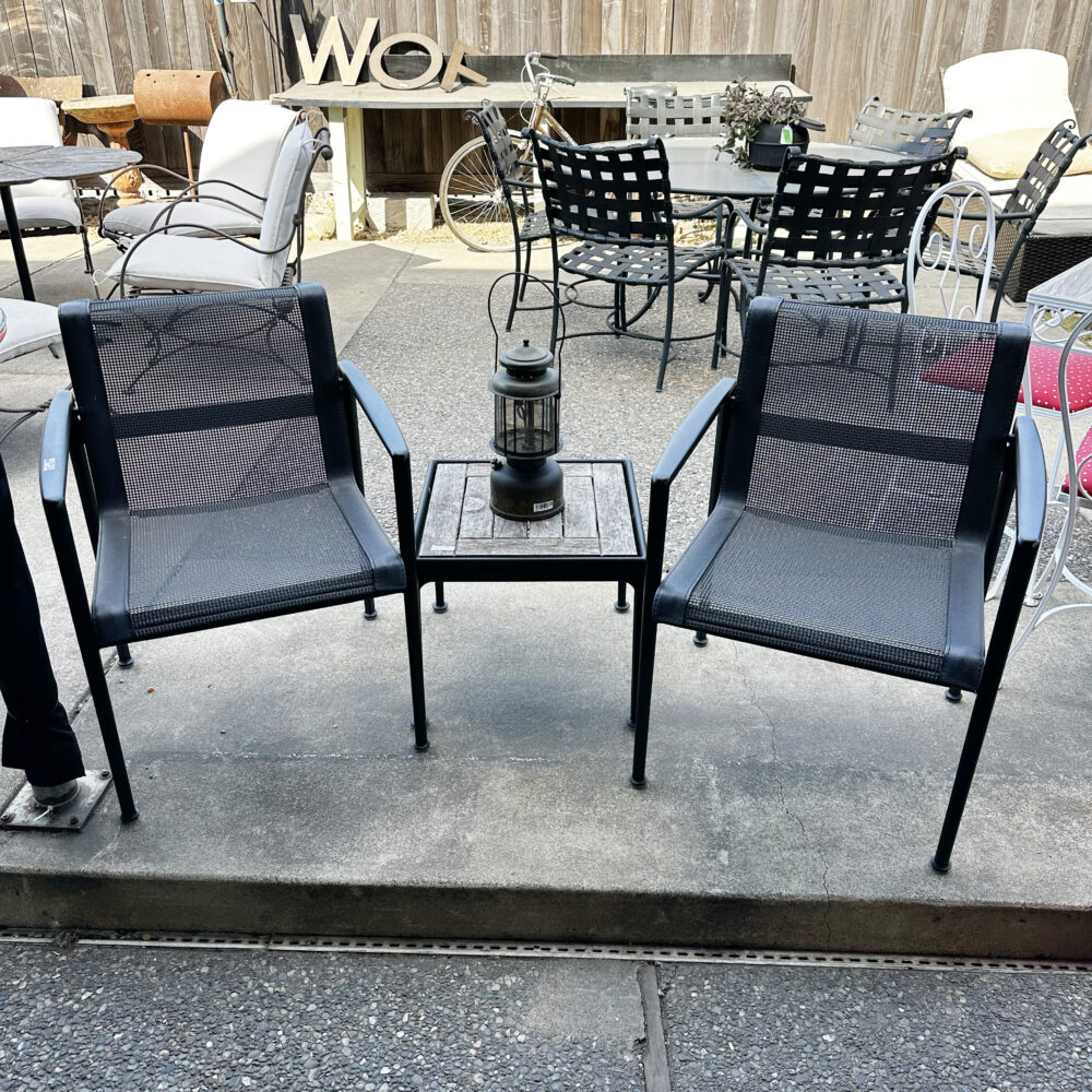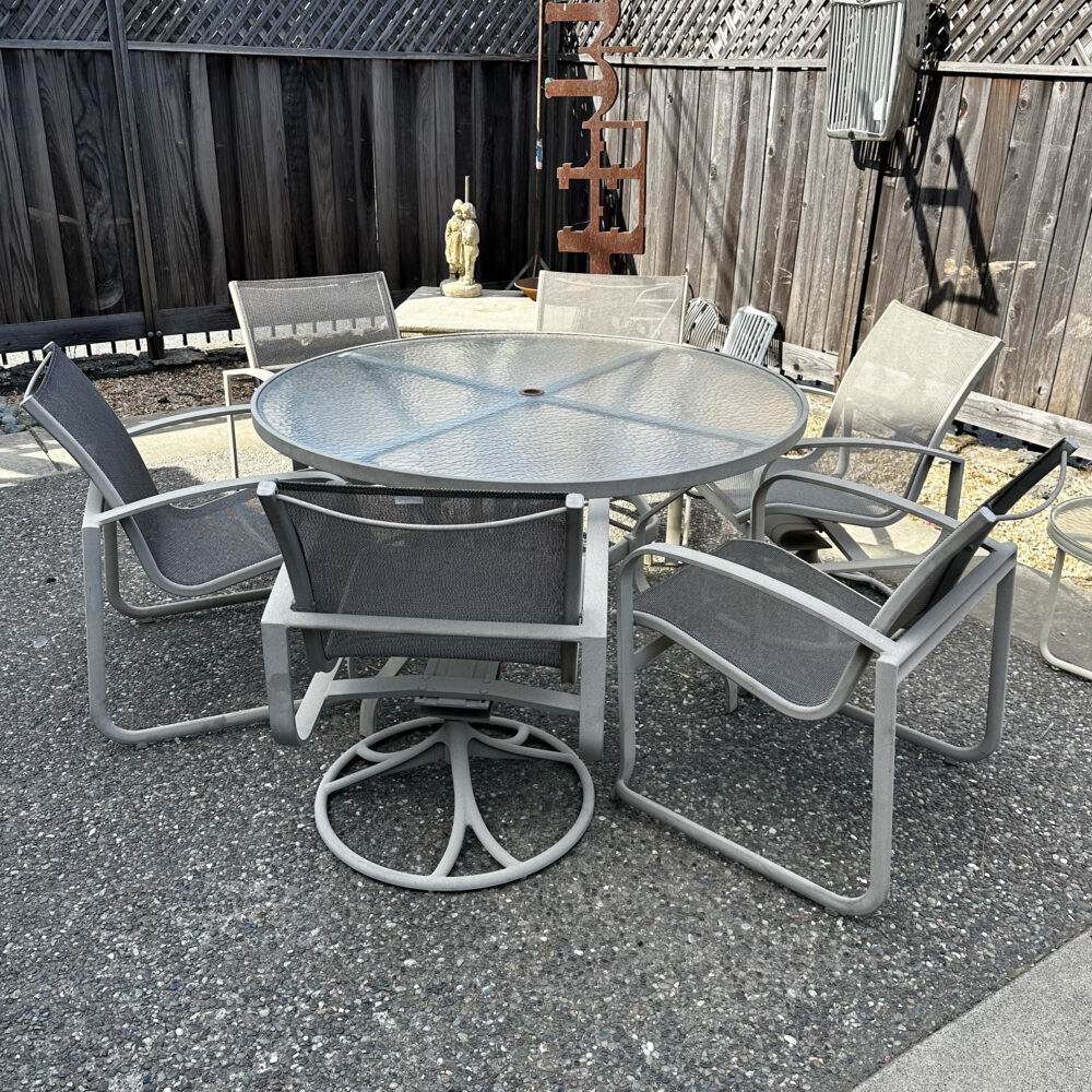 - Seating & dining: Redwood chairs with ottomans, Tropitone sling dining set, patio loveseat.