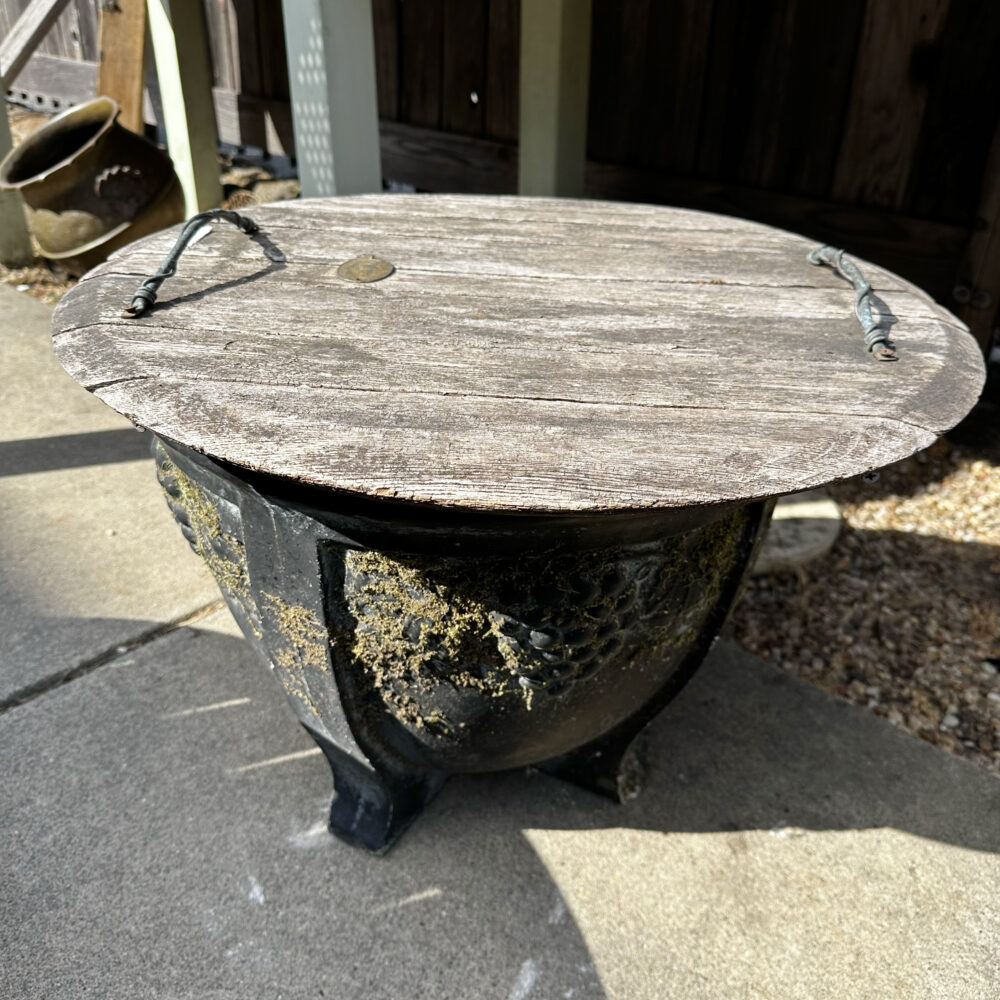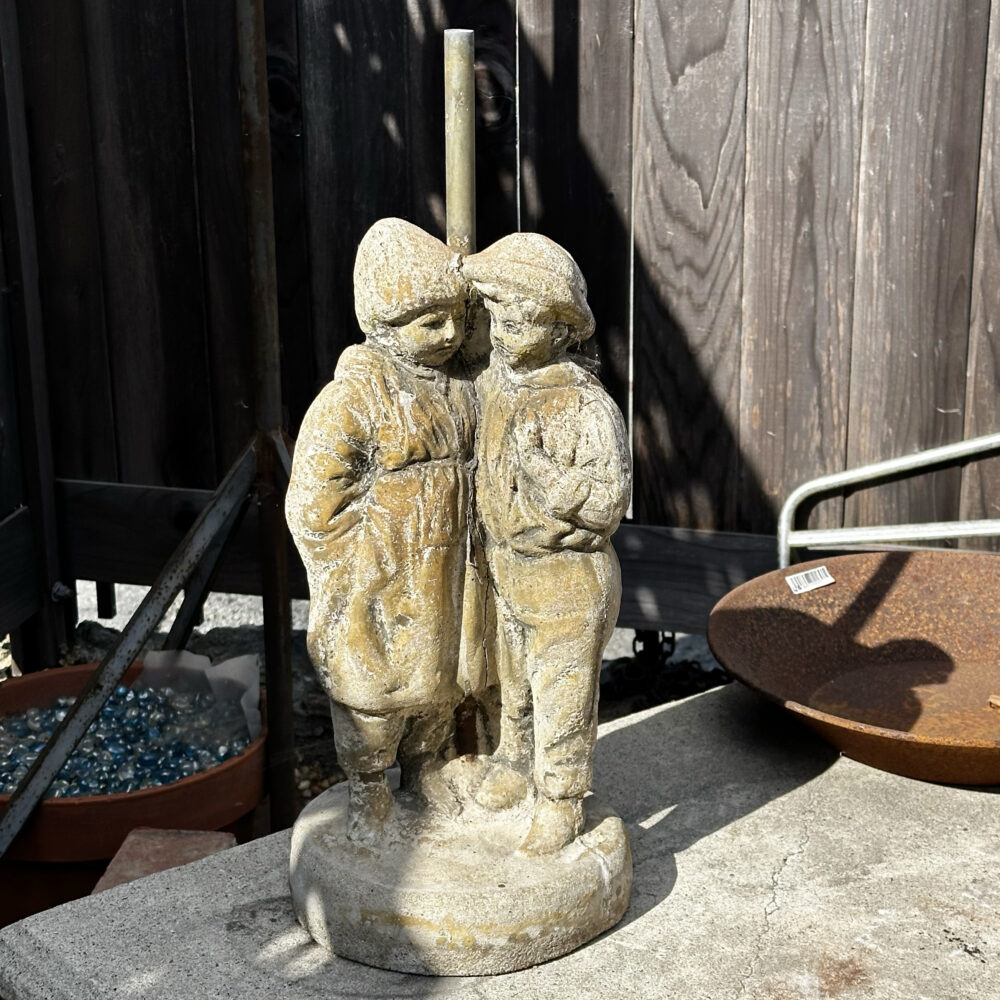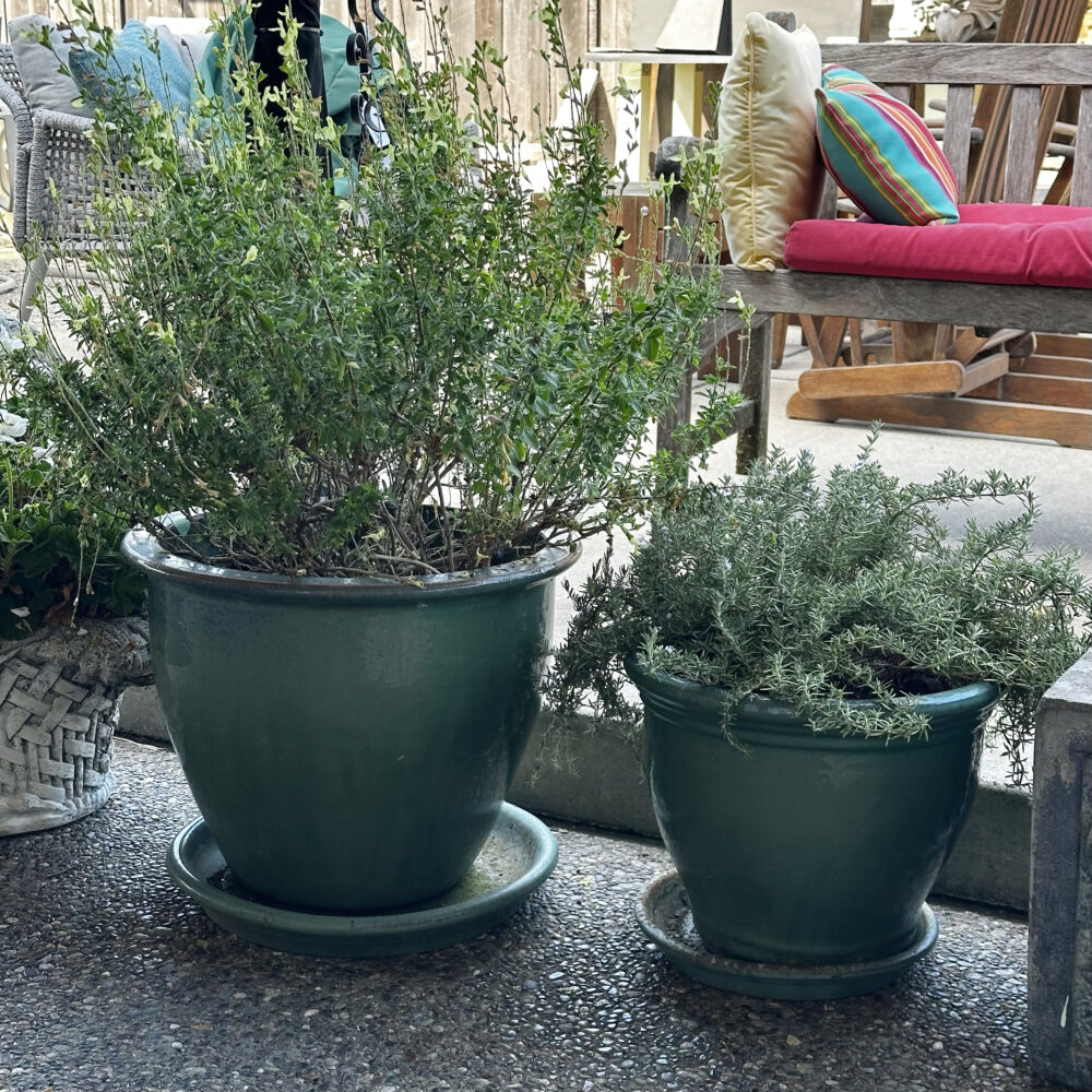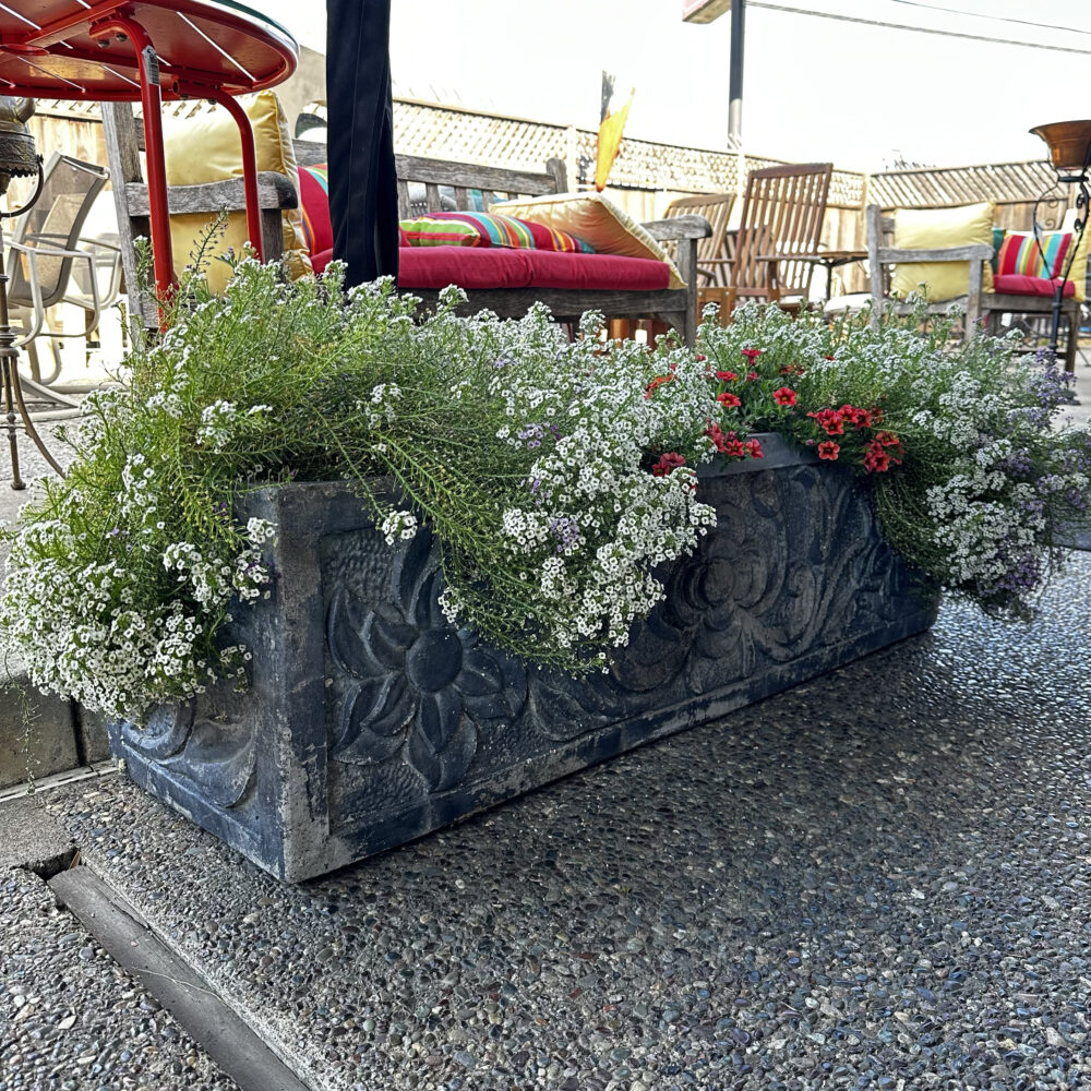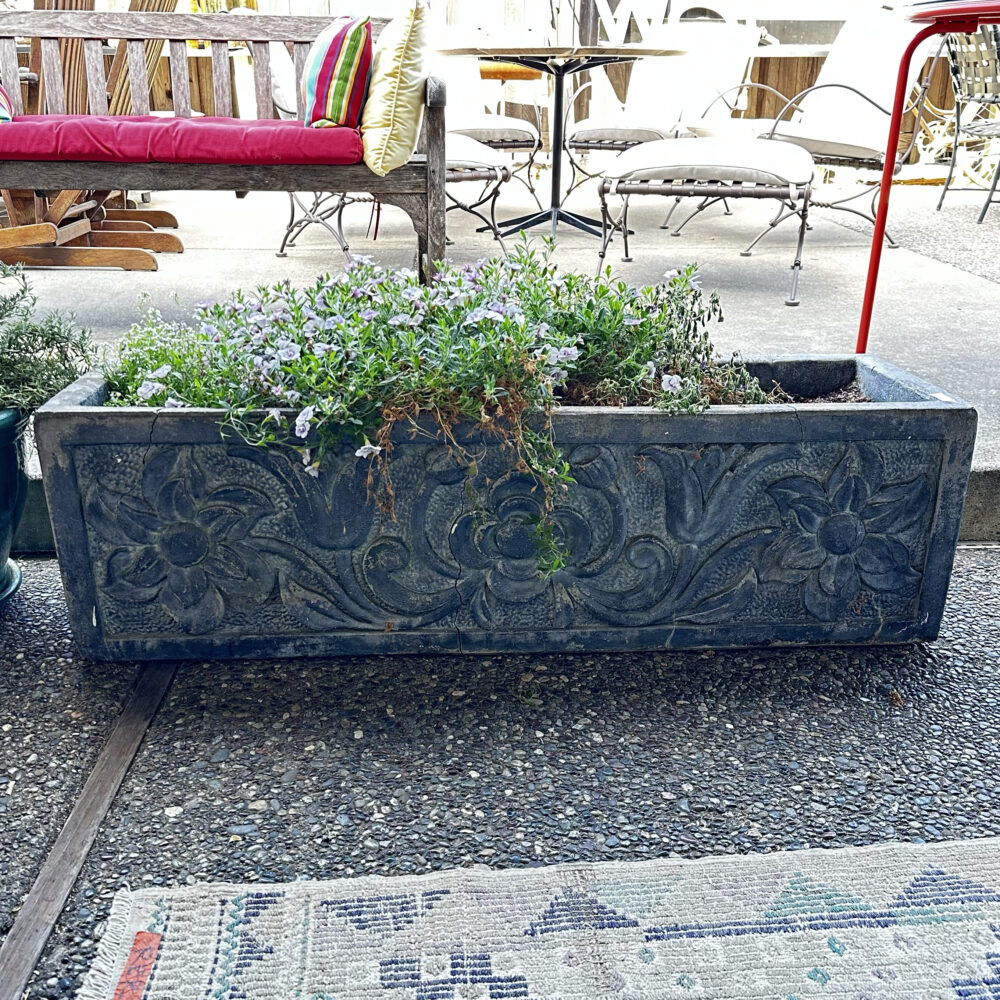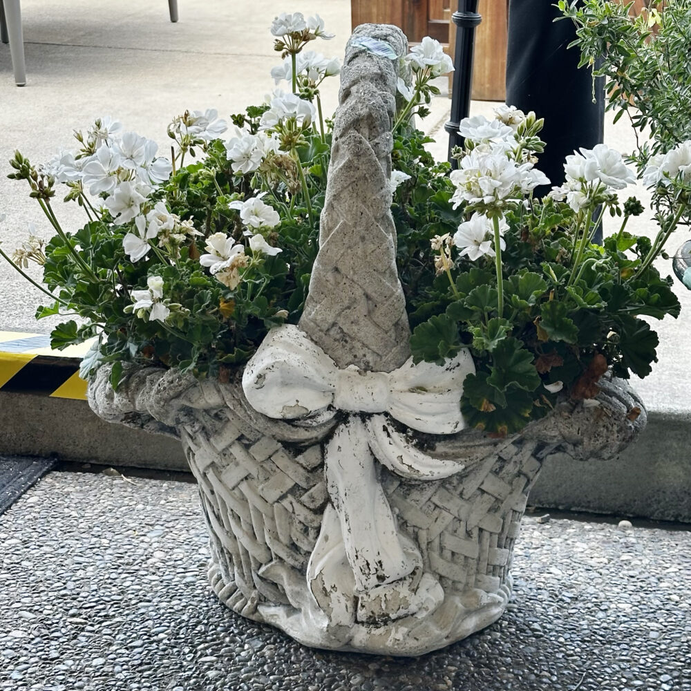 - Garden artistry: Concrete planters, ceramic pots with plants, and a sculptural handled garden basket.