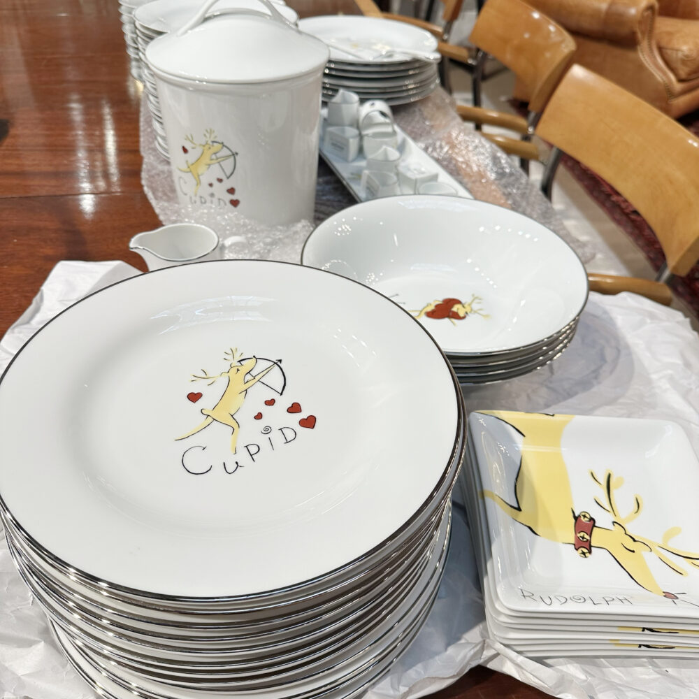 Entertain in style with a service for 20 from the fabulously festive Pottery Barn Christmas Reindeer Collection dinnerware, a Hobart Model 410 meat slicer, dishware by Noritake and Lenox, Lalique Olonne holly leaf pattern compote, an extensive array of copper cookware, a large hand-painted Mexican Talavera ginger jar, collections of duck decoys (including a brass set), an antique 19th-century mahogany wheel barometer, stemware by Lenox, Baccarat, and Waterford, Heath plates, a silver-plated high chair tray engraved by Reed and Barton, collectible Disney Bambi figures, official 2023 Mickey Mouse Fan Club collector figures, a vintage leather doctor’s bag, a vintage Rosenthal Aida Moss Rose porcelain pitcher, hand-carved African tribal fertility statues, an Indian Head beer and ale tray, a vintage Remington Noiseless portable typewriter, a Rosenthal box-set Pine Needles cheese dish with server, a pair of Lenox “Aquarius Collection” porcelain oval compote bowls, a stunning Murano vase by Givliano Tosi, an enclosed Schooner boat model, a bronze centaur statue titled “Chiron” by California artist Dave Chapple, Kabuto, an exciting collection of lightning rod balls, Whites Proscan metal detector, a Chinese Ming-style bronze censer, a collectible vase by Satian Lekrisiwat, and a pair of Magic Chef brand-new mini refrigerators.