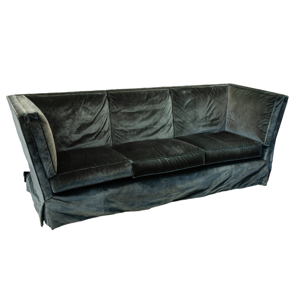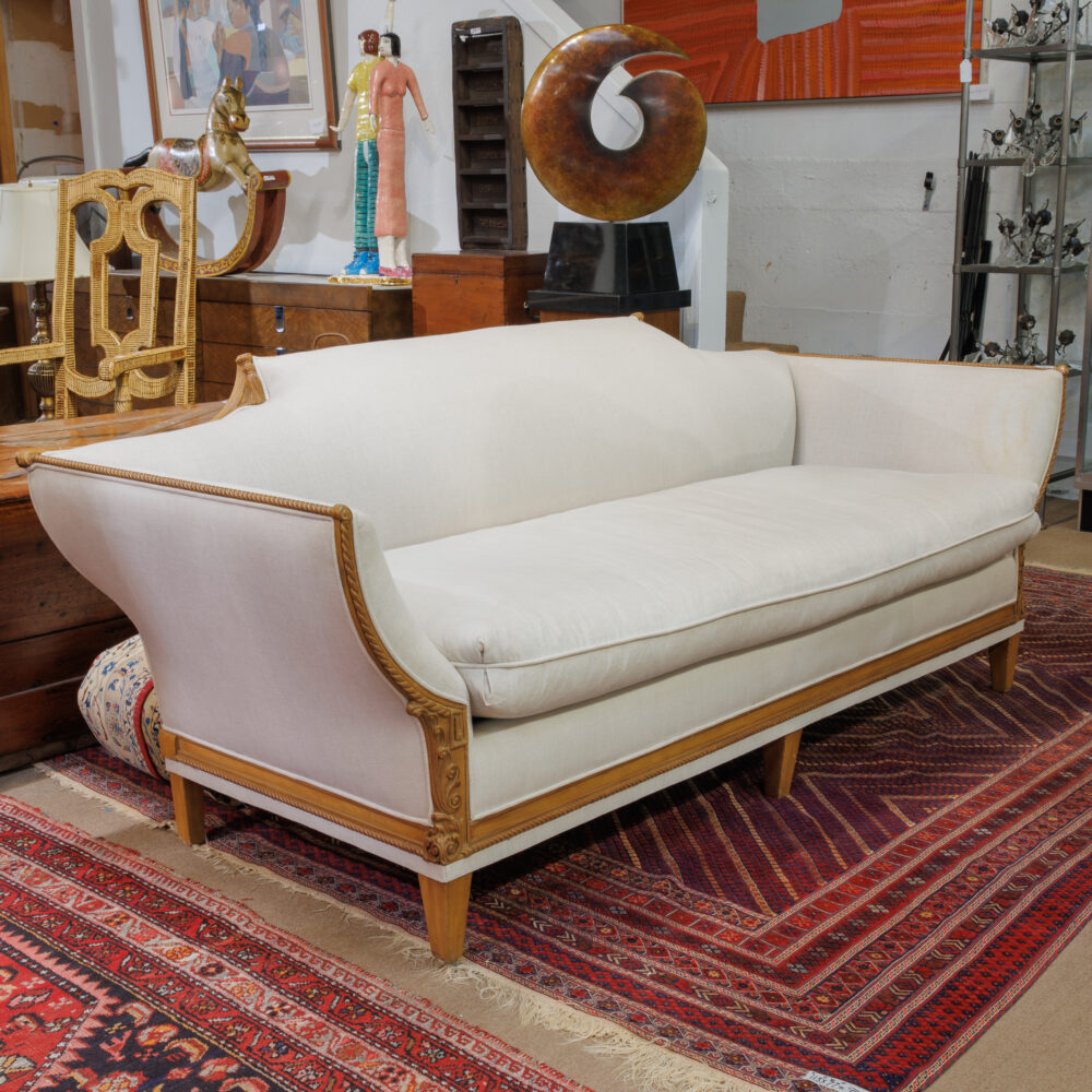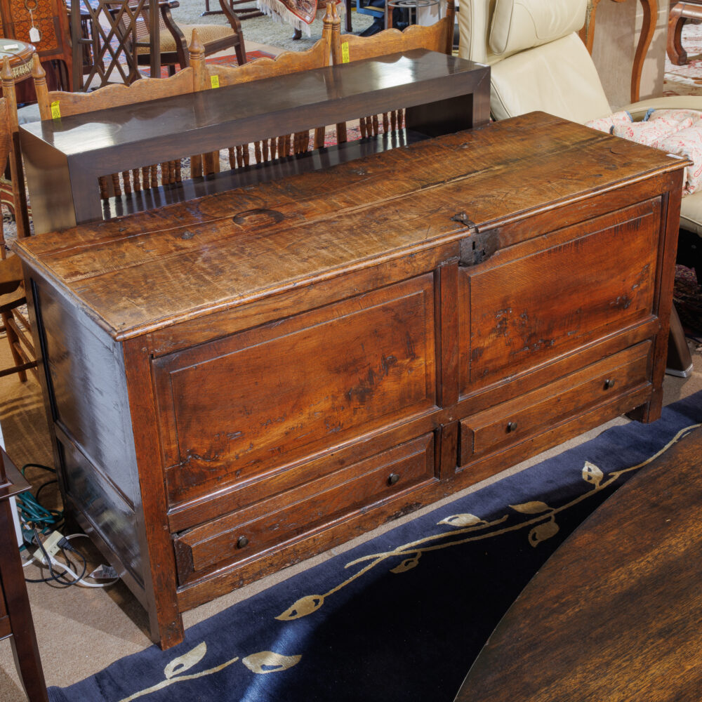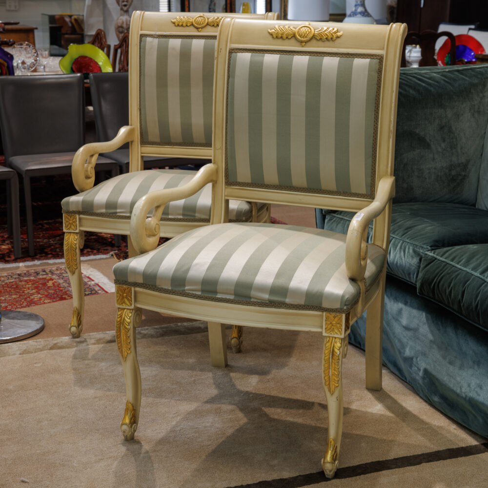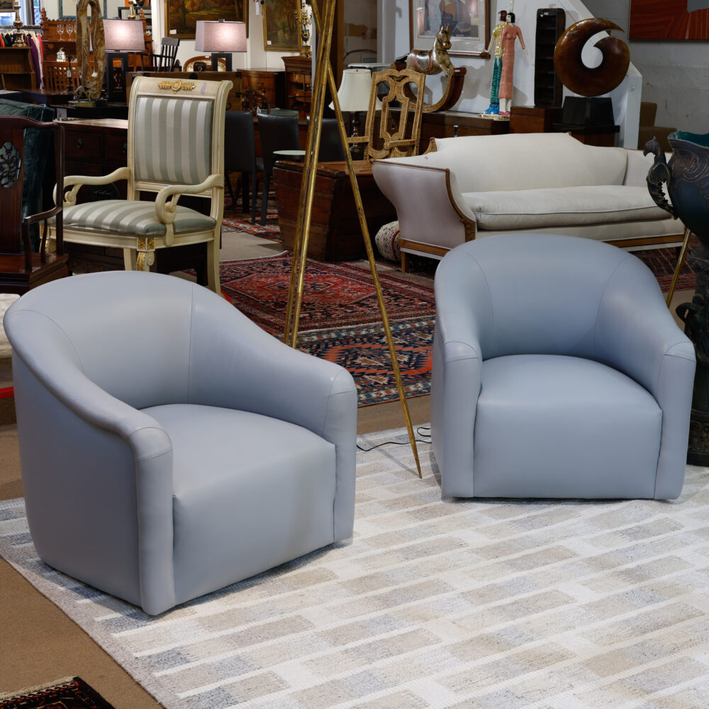 This refined selection includes a pair of A. Rudin no. 419 pale blue leather swivel barrel chairs, a green velvet Donghia sofa (John Hutton design), a sculptural John Lyle bronze ARTIS table with smoked crystal top, an antique French country dining table with two extension leaves, an antique Asian bench, and a French provincial Louis XV style vintage chest by Baker. Additional highlights include a pair of Dessin Fournir ribbon back chairs, a set of four oak pressed back chairs with cane seating, wine storage racks, a French country provincial buffet, a Mattaliano leather and fabric lounge chair, a Louis XVI writing desk with tambour door and ormolu mounts, a directoire style sofa, an antique English oak coffer/blanket chest, an Italian antique walnut dresser, a speakeasy pub table, a pair of frosted glass and chrome end tables, tansu, a Mario Buatta for John Widdicomb Company chinoiserie console table, a rare antique Dutch folk art high-back chair decorated with carefully arranged twigs, a pair of Louis XVI style painted and parcel-gilt armchairs, an extremely large antique dough box, a pair of Antonio Citterio for Maxalto Ebe console tables with brown oak finish and chrome steel frame, and an Antonio Citterio and B&B Italia Apta coffee table.