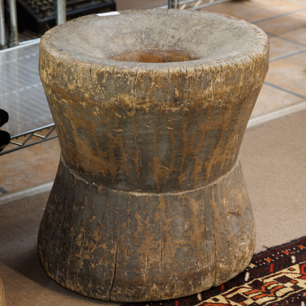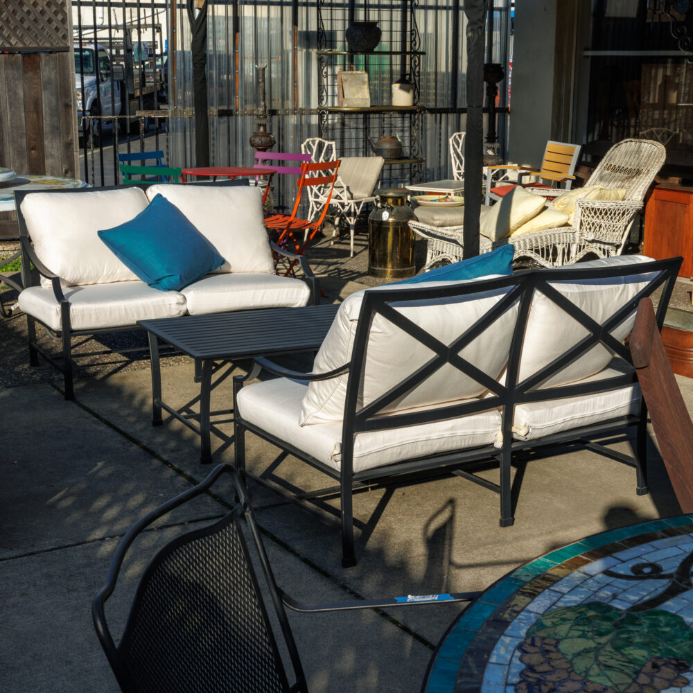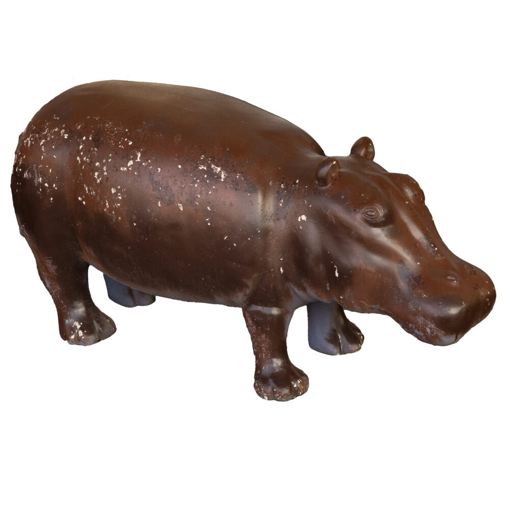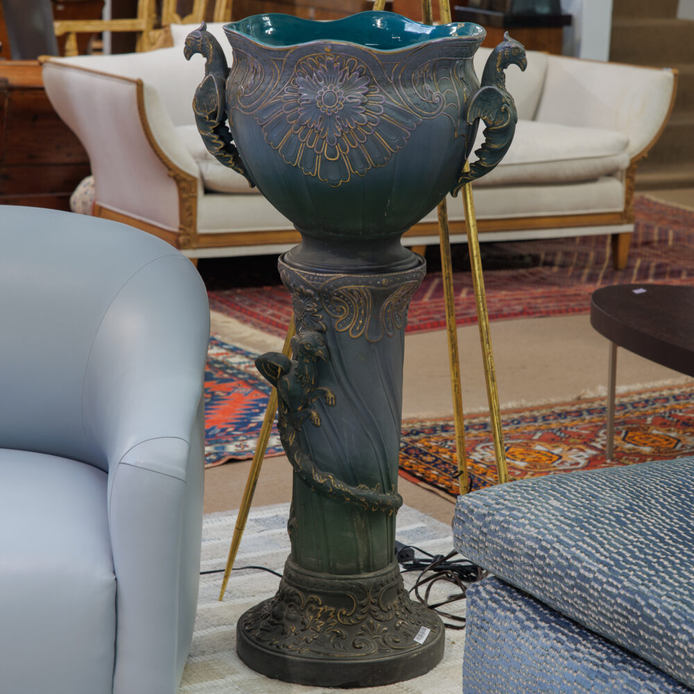 Create an inspired outdoor oasis with an adorable garden hippopotamus, a five-piece vibrantly colored bistro seating arrangement, a fiberglass scroll-legged console table, a large planter by Michael Taylor Designs, an antique wrought iron multi-tiered plant stand, 1920s wicker shades, decorative urns and pots, new outdoor seating collections, an antique autoclave, and a magnificent Thai Rattanakosin garden doors jardiniere on pedestal.