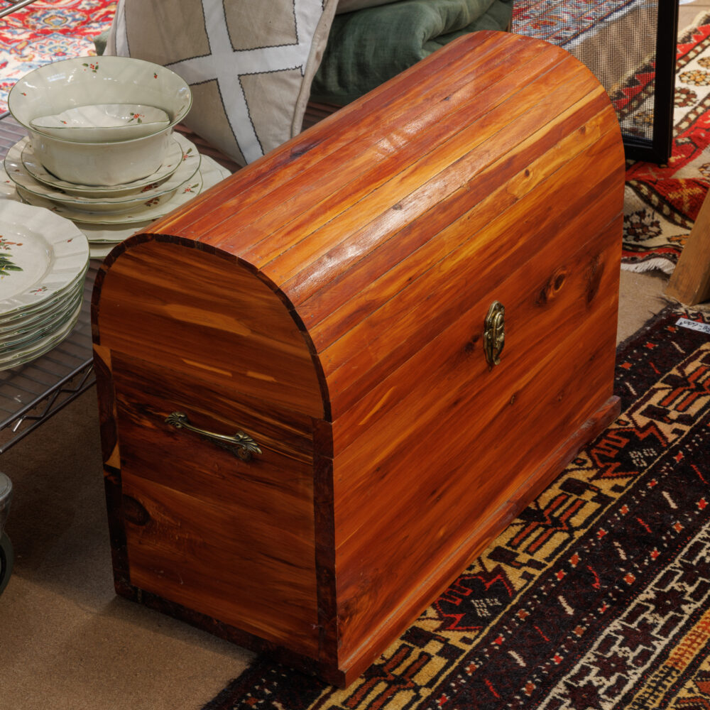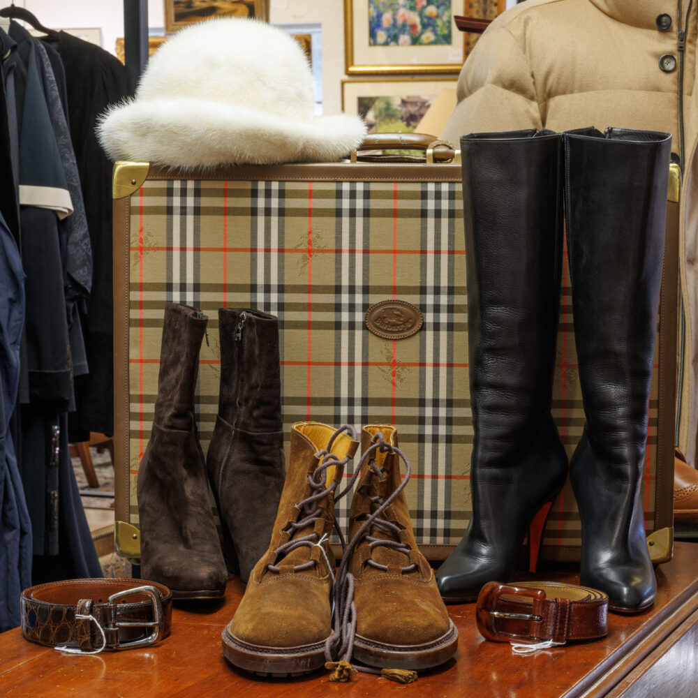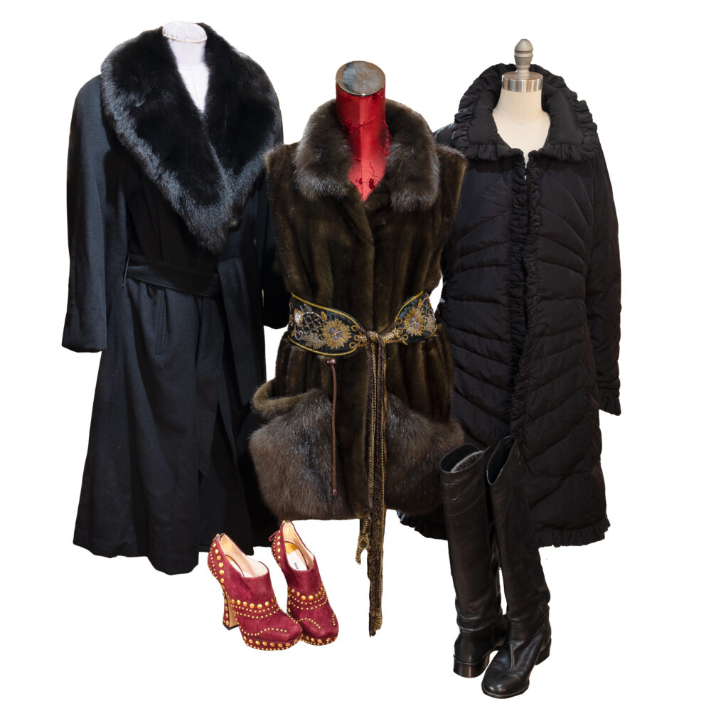 New to this sale is an exciting collection of winter and holiday wardrobe treasures. Featured pieces include a Dennis Basso fur vest with beaded belt, a Moncler puffer coat, and accessories such as a beautiful blue Celine handbag and a Burberry’s suitcase. Men’s coats by Herno and Cardinal are offered alongside luxurious cashmere sweaters by N. Peal, Polo Ralph Lauren, and J Press. A standout collection of vintage YSL jackets and skirts includes a rare red brocade collectible jacket. Also featured are numerous fur coats and jackets and a fun assortment of sparkling vintage fashion.