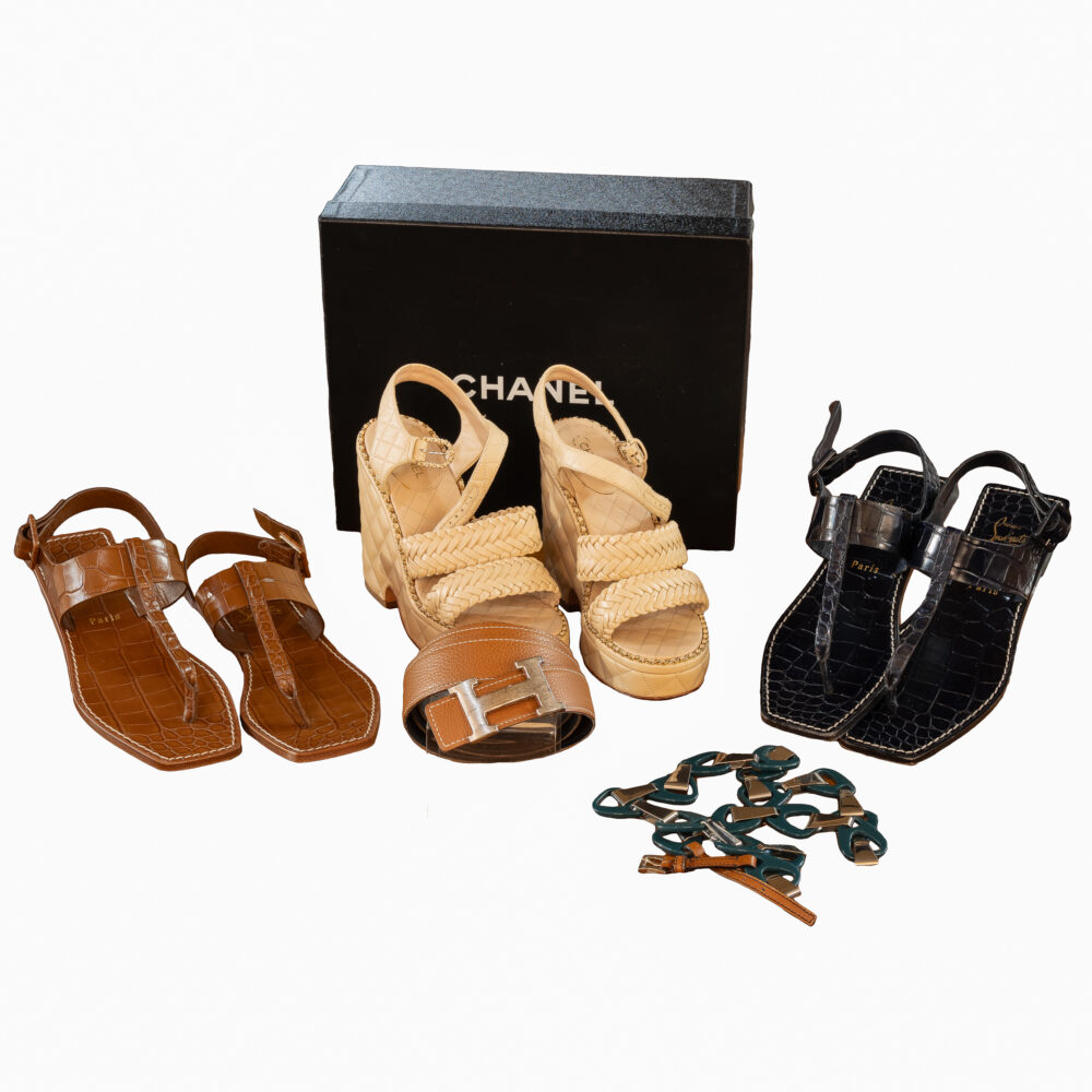 Accessories include knee-high boots by Chanel, Louboutin, YSL, and Prada, along with Louboutin sandals and Prada kitten heels. A large collection of vintage beaded bags, leather tote bags, and much more complete the offering.