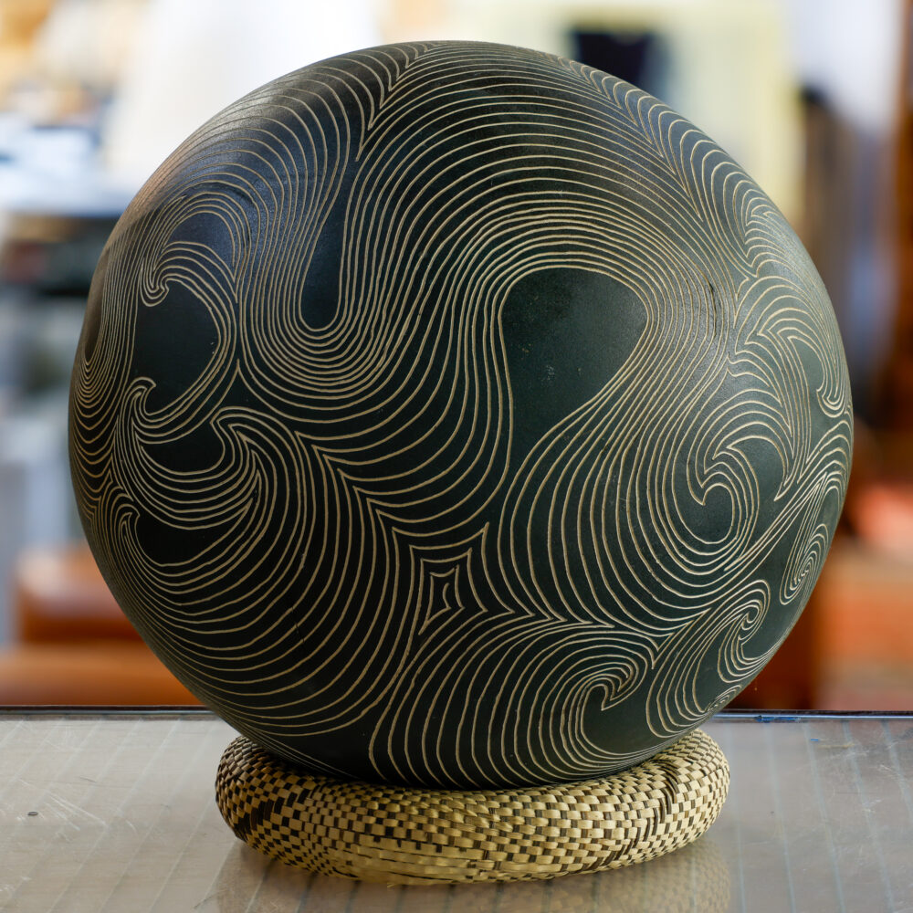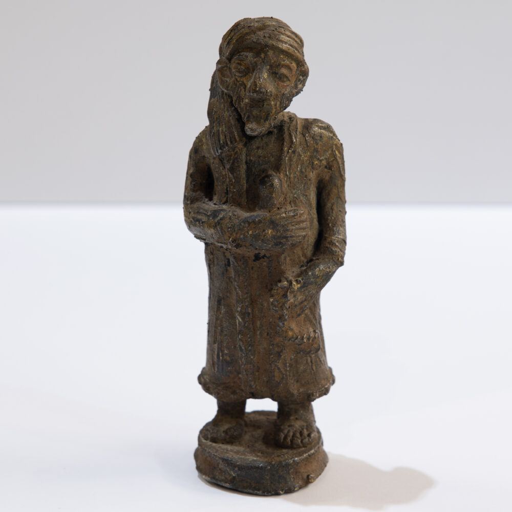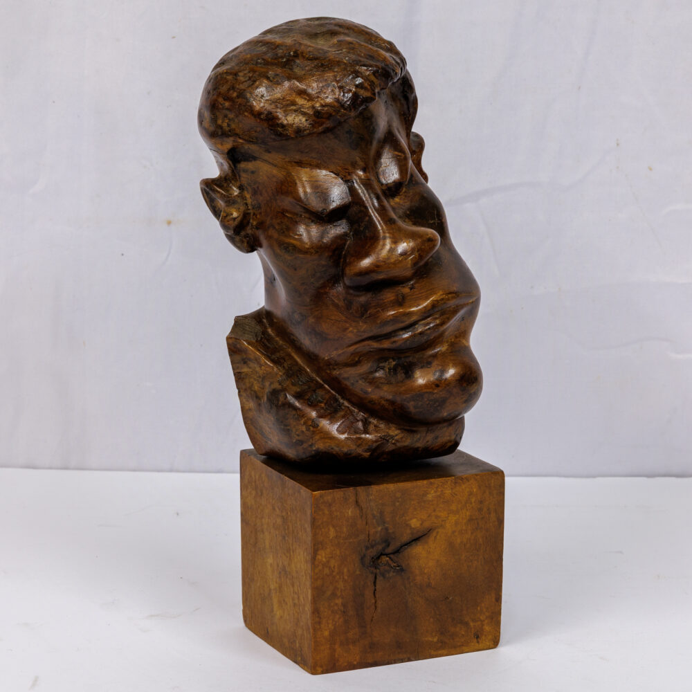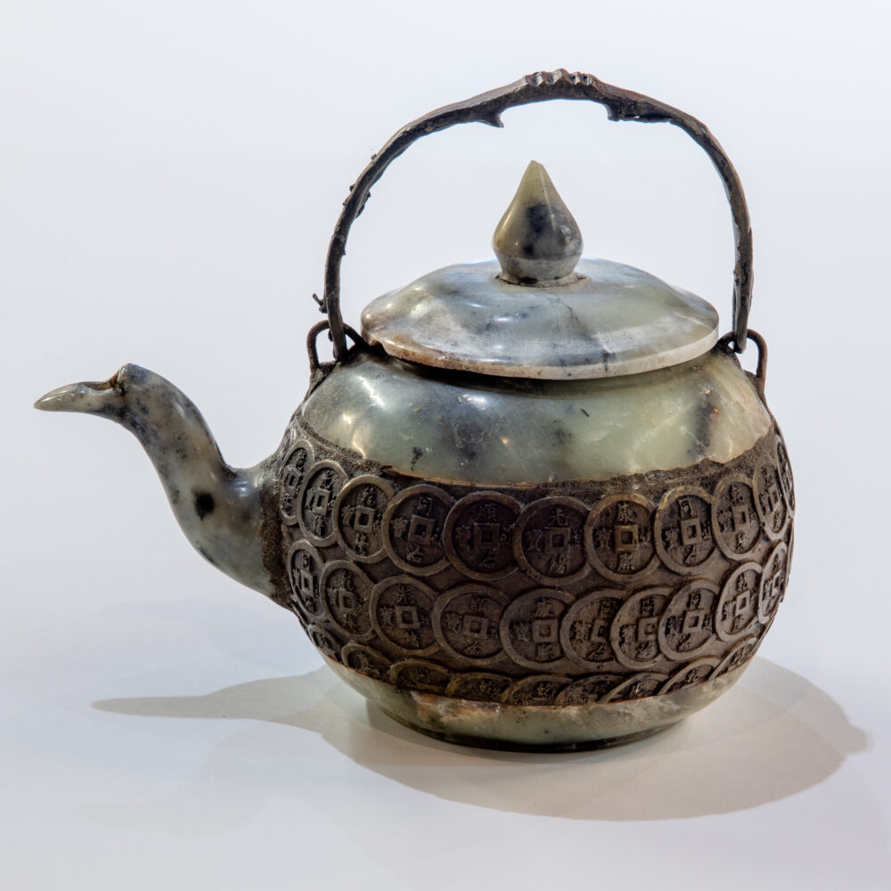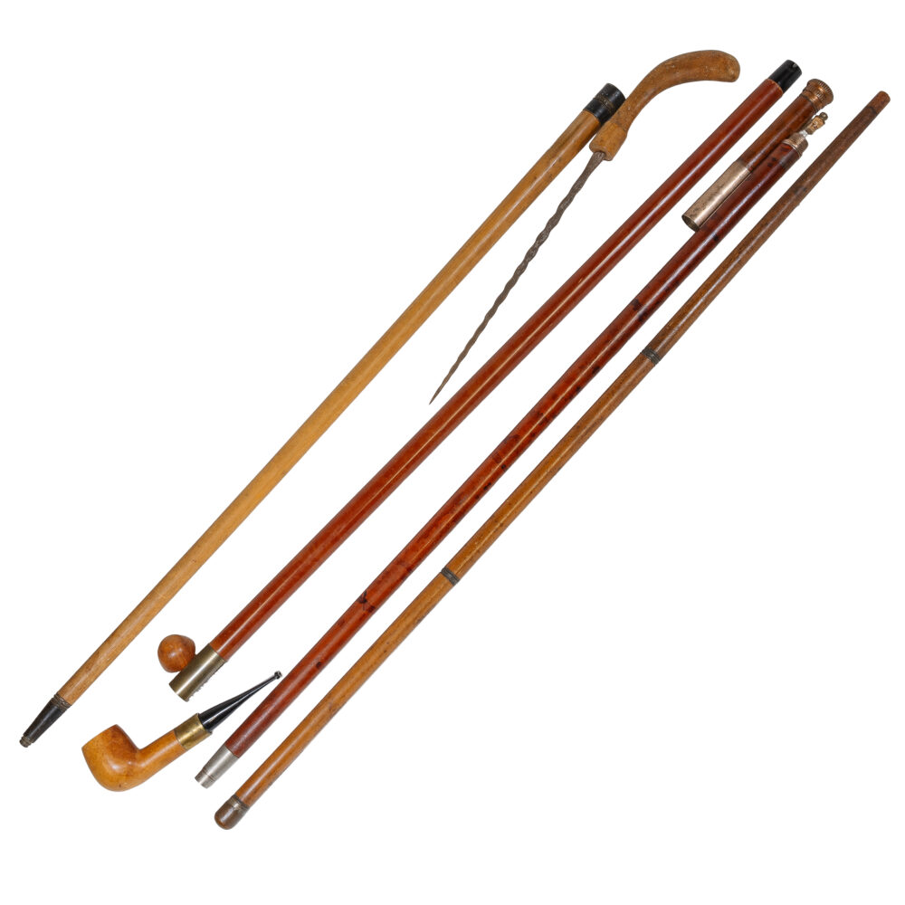 An eclectic and compelling mix featuring books, Lionel toy trains, canes, walking sticks and umbrellas, Indigenous baskets, silver and sterling items (including a large spoon), Asian ceramic crafts, a stone Buddha, a brass/bronze coal box, a quality 8-day travel clock, an antique barometer, an antique wood-carved “Mary & Child,” and a Japanese iron samurai face protector/mask.