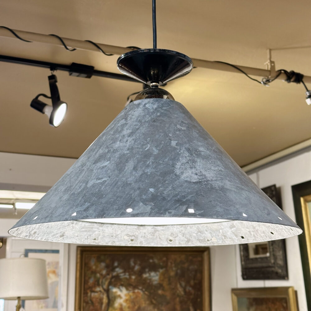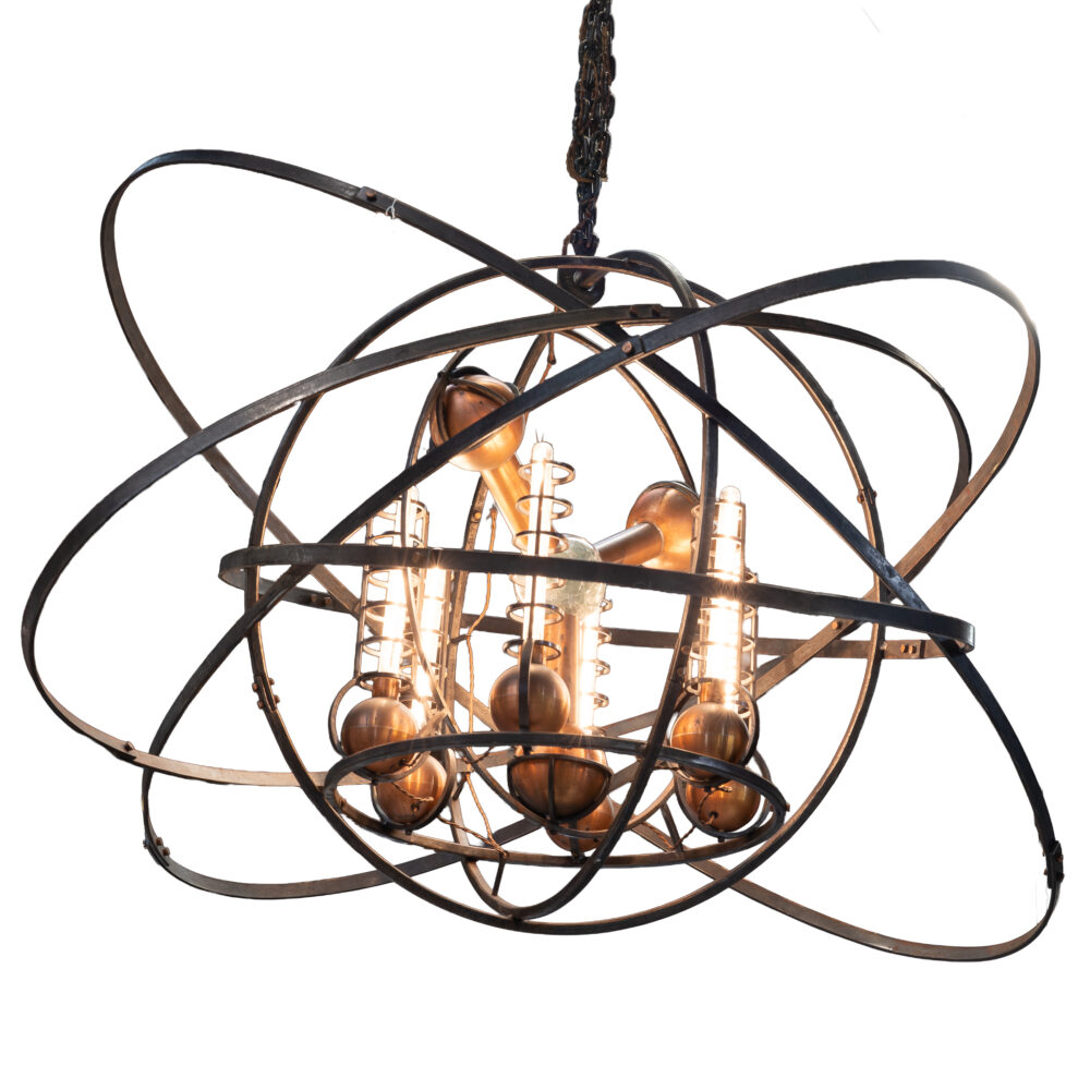 A true showstopper, the Jules Verne collection chandelier by Jefferson Mack features hand-worked steel ellipticals and spy-glass inspired glass discs. Additional highlights include a pair of Cedric Hartman inspired brass floor lamps, Leavitt Weaver tripod floor lamps, a 1970s MCM brass and marble arc floor lamp, an Italian carved alabaster sculpted lamp, and an exceptional variety of floor and table lamps and chandeliers. Also featured is a pair of modernist steel and zinc hanging lamps by Ron Rezek, circa 1980.