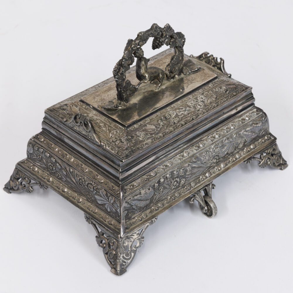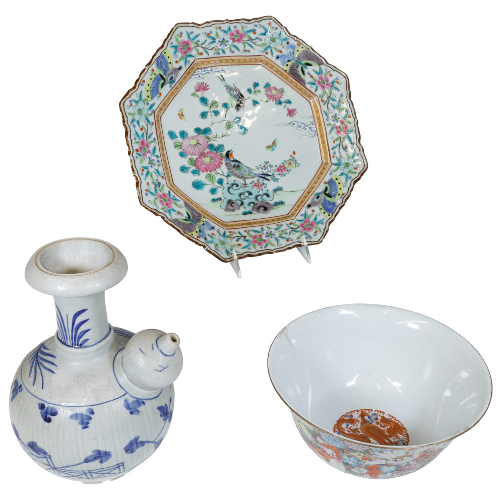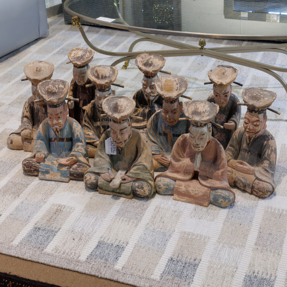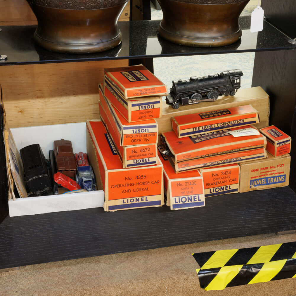 An exceptional assortment of decorative and collectible treasures awaits, including collectible vintage Disney items, a Christofle flatware set, antique Christmas tree stands, Orrefors Maja stemware designed by Eva Englund, a glass terrarium, a gilt lacquered Burmese Mandalay Buddha statue, an antique wine demijohn, a complete sealed set of vintage baseball cards, petrified wood bookends, a Spode “Shima” China set, a set of antique Minton gold-encrusted dinnerware, stemware by Villeroy and Bach and Rosenthal, assorted Roseville pottery pieces, a large antique wood mortar, a McKenzie-Childs Tango hand-painted decanter, an antique Smith Premier typewriter, a Han dynasty style model of a stove, Mikasa Happy Holidays dinnerware, Wallace glass and sterling divided bowls, a collection of antique firkins, an early 1900s antique child’s horse tricycle, an antique child’s three-wheel velocipede, a grand collection of vintage Christopher Radko ornaments, and a pair of Molekule air purifiers.