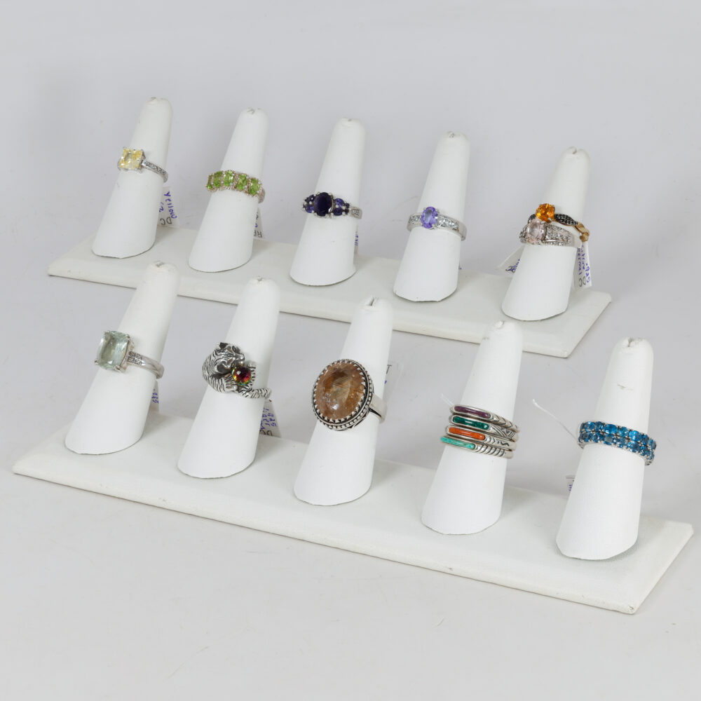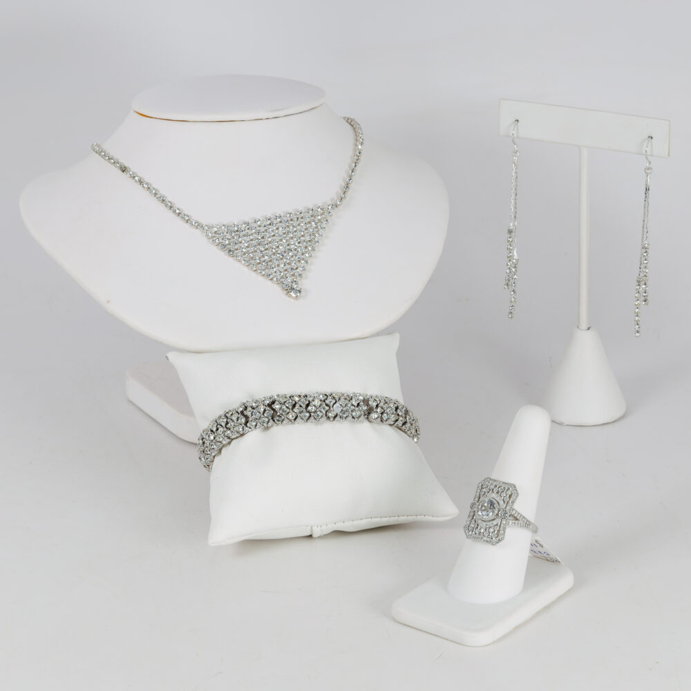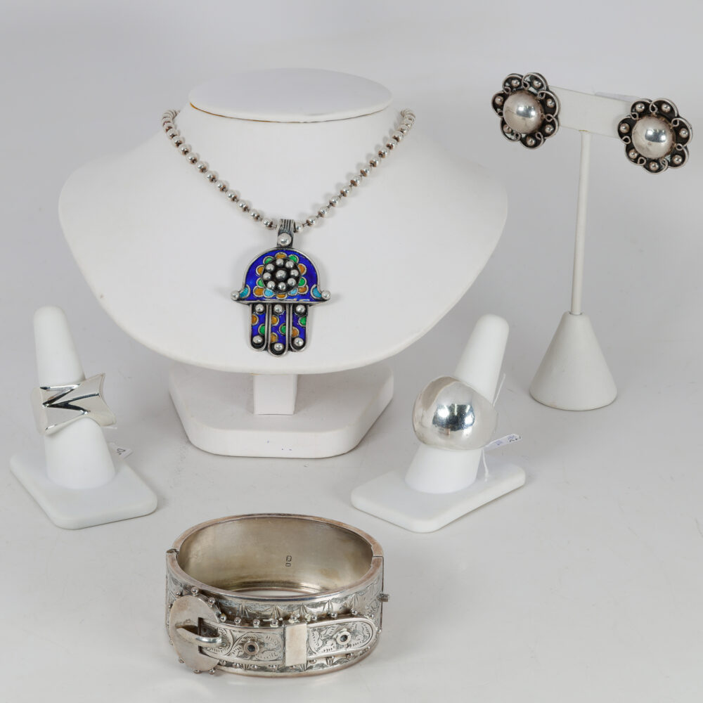 Shimmer and shine with a sterling silver Goshenite tennis style necklace, sterling silver diamond tennis bracelet, diamond rings in sterling silver, a vintage Moroccan enamel hamsa necklace, a chunky sterling silver geometric ring, and a large aurora borealis crystal ring. Discover a sterling silver tanzanite ring paired with a matching pendant, along with a wide variety of gemstone sterling silver rings including a peridot five-stone ring, an iolite ring, London blue topaz band rings, and a vintage tiger crystal wrap ring. In our vintage collection, we offer a signed pair of Thelma Deutsch green crystal earrings, rhinestone necklace and earring sets, a citrine crystal necklace, and a striking assortment of sterling silver inlay stone bracelets and necklaces.