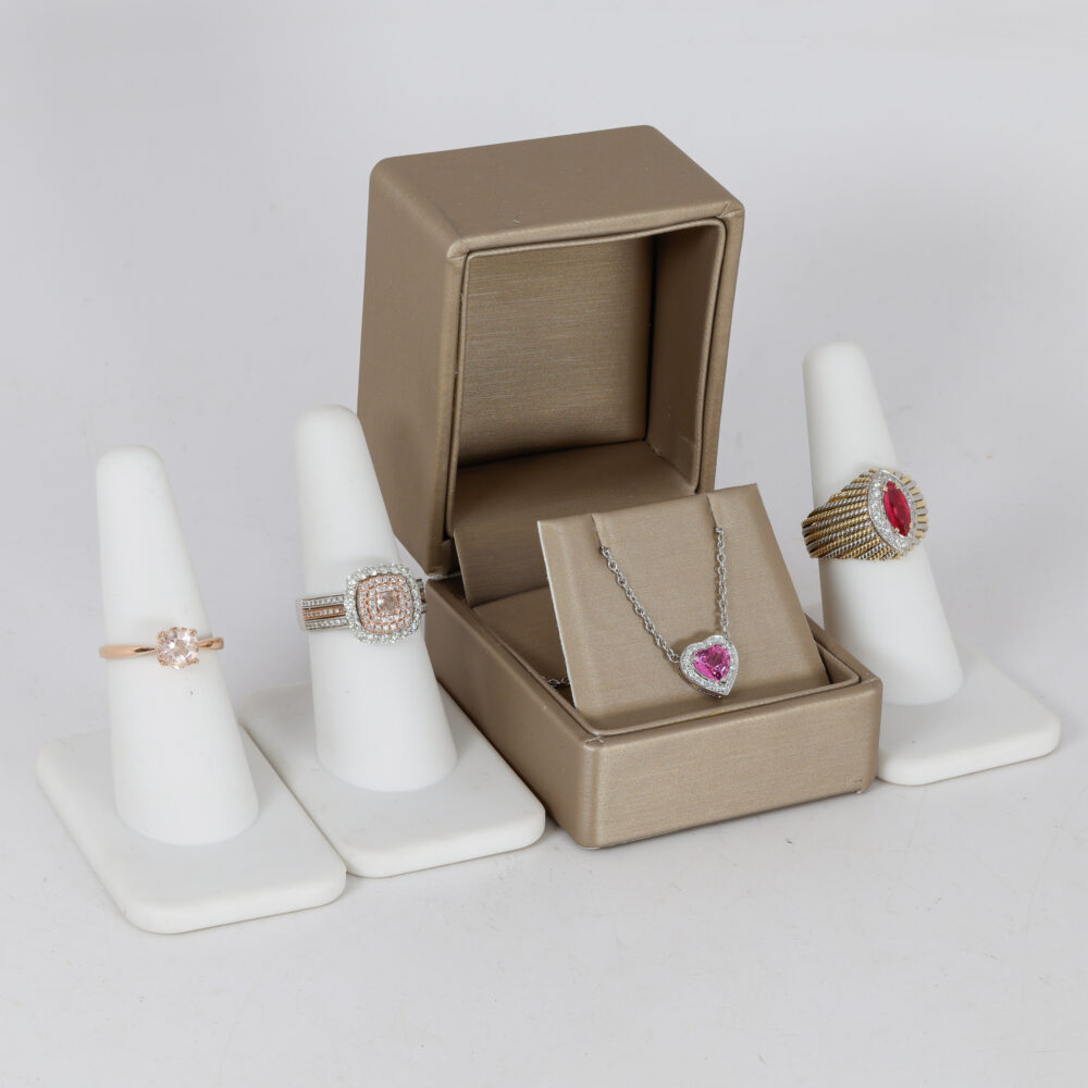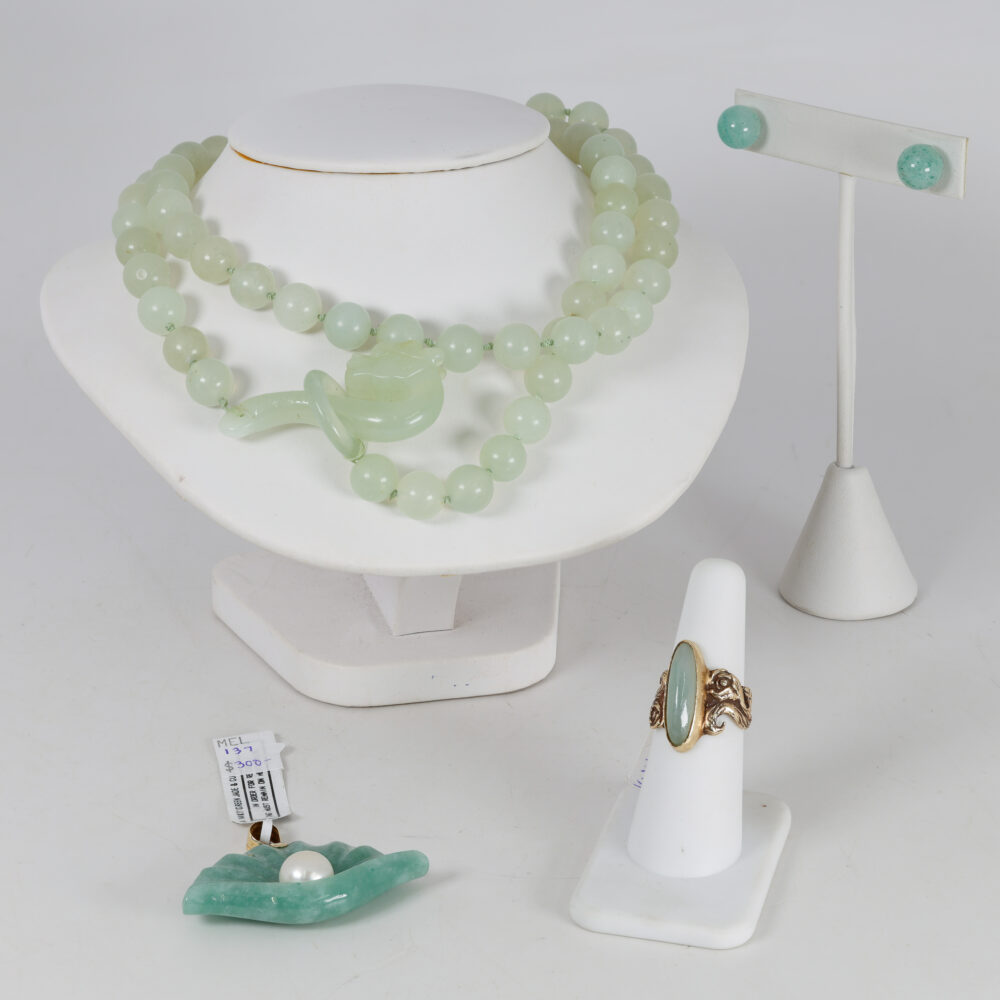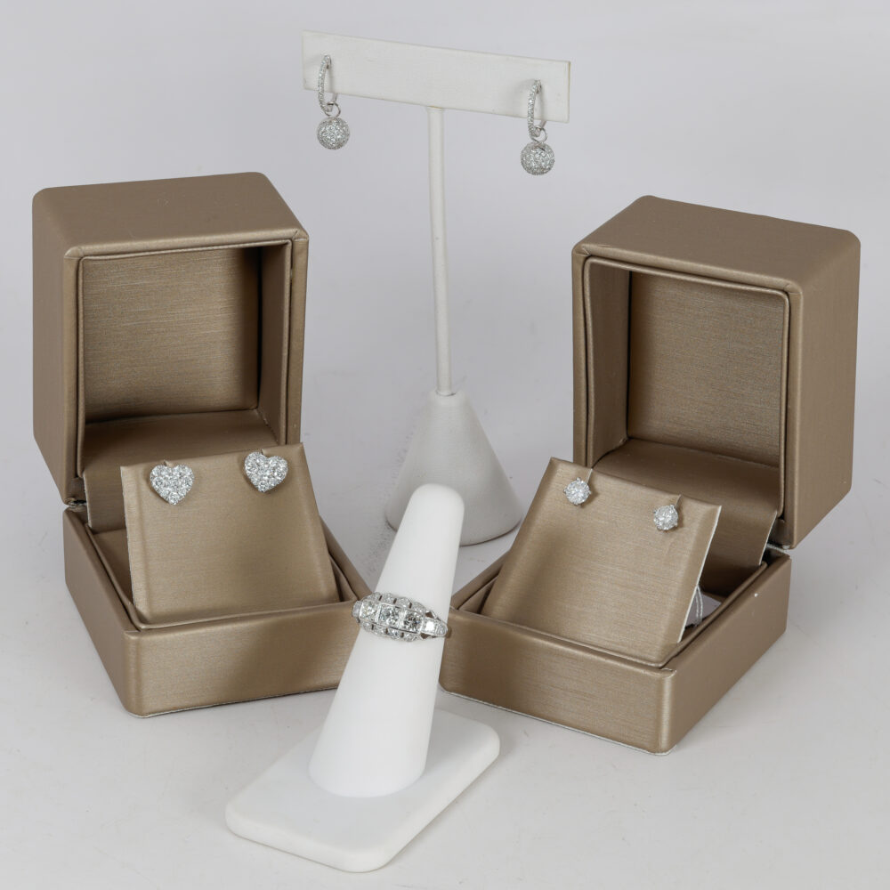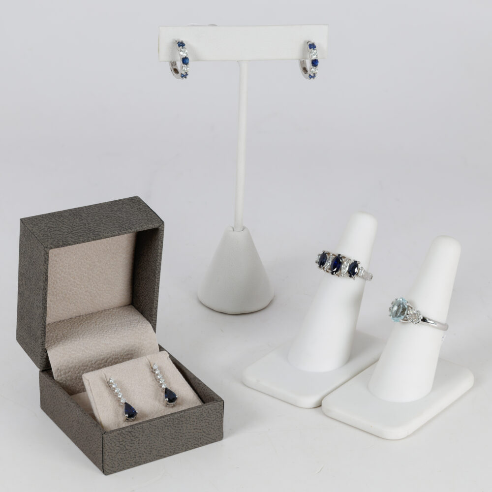 Shimmer and shine with a sterling silver Goshenite tennis style necklace, sterling silver diamond tennis bracelet, diamond rings in sterling silver, a vintage Moroccan enamel hamsa necklace, a chunky sterling silver geometric ring, and a large aurora borealis crystal ring. Discover a sterling silver tanzanite ring paired with a matching pendant, along with a wide variety of gemstone sterling silver rings including a peridot five-stone ring, an iolite ring, London blue topaz band rings, and a vintage tiger crystal wrap ring. In our vintage collection, we offer a signed pair of Thelma Deutsch green crystal earrings, rhinestone necklace and earring sets, a citrine crystal necklace, and a striking assortment of sterling silver inlay stone bracelets and necklaces.