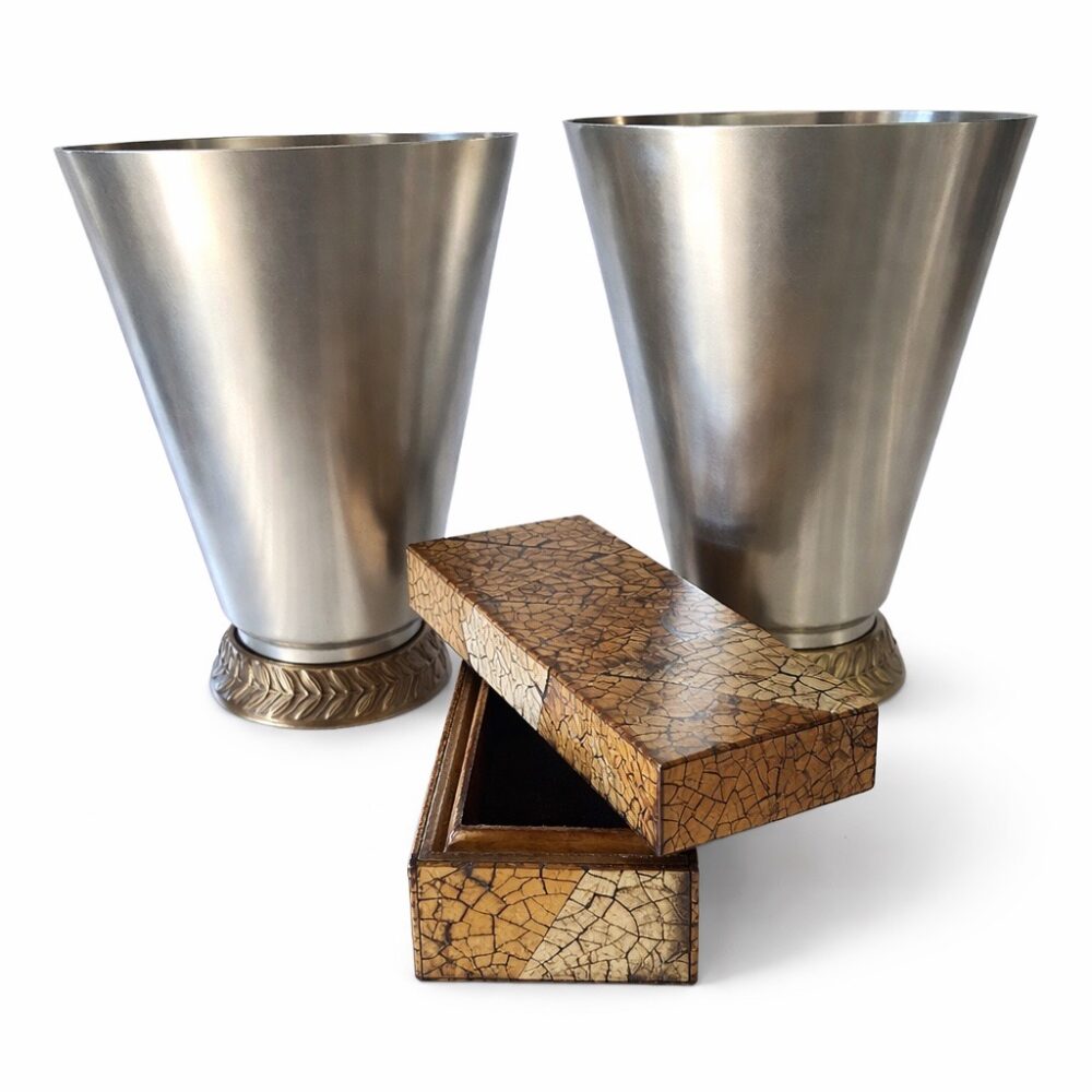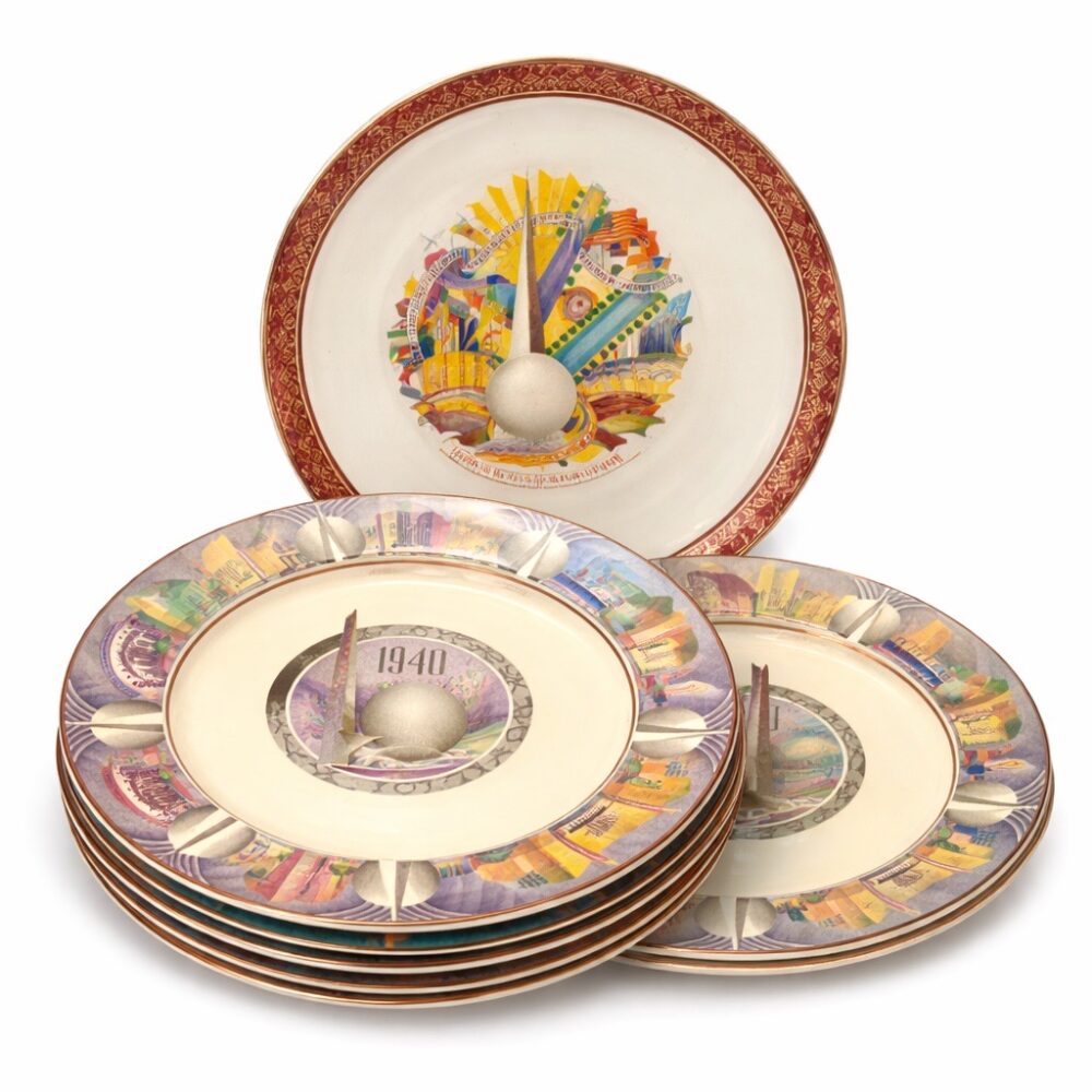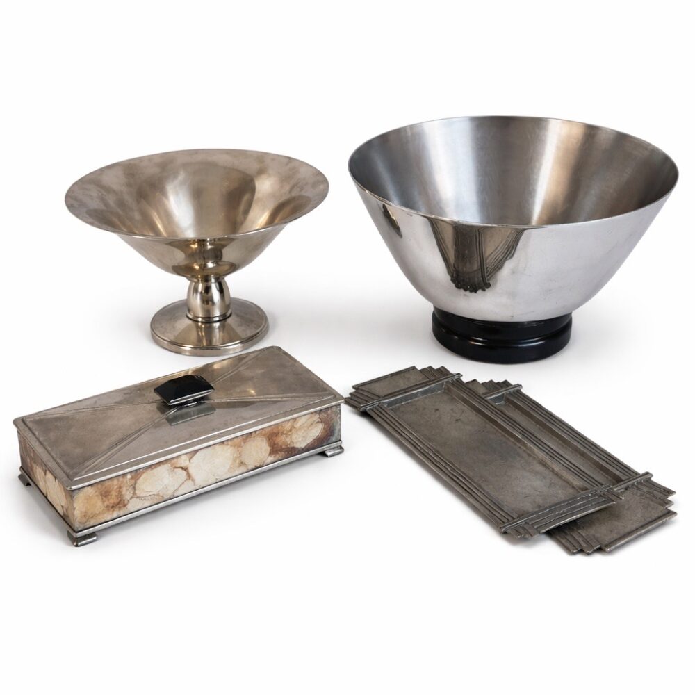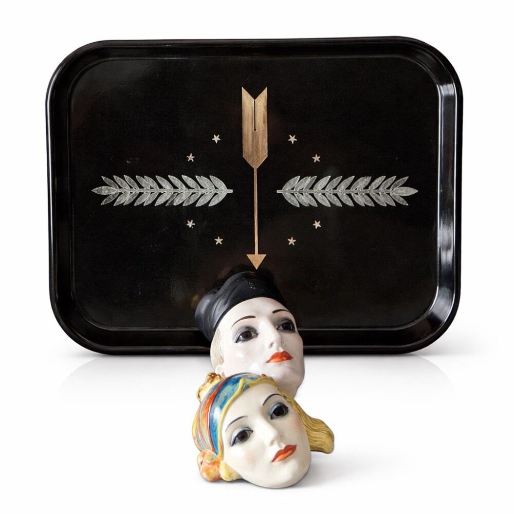 This sale features richly layered household offerings including two large collections of fiesta ware, a chaffing dish design for Chase by Lurelle Guild, a pair of Chinese flora tureens by Zachariah Boyle and Son, dishware by Juliska, a selection of decanters, a Leune Art Deco vase, Spode serving ware in “Stafford flowers”, Heath dinnerware, vintage Homer Laughlin fiesta drinking glasses, a set of Minton porcelain plates for Tiffany, a five piece painted porcelain coffee set by the Thomas China company, a pair of Shelley vases, a Rockwood pinecone vase, an art deco double faced mask by Rudolph Podany for Keramos, an Abercrombie and Fitch desk clock, a Sergio Bustamante papier-mâché parrot, a Burmese carved gilt wood nat spirit sculpture, a Mandalay style standing Buddha statue, a vintage Hamilton Beach juicer, a Meiji earthenware pot, a wicker trunk by M. Wurzi and Sohne, a limited edition signed Paule acrylic amber frog figure, a pair of aluminum art deco Kensington Marlborough vases, Andres de Morgades wastebaskets, and a Gordon Chandler metal kimono.