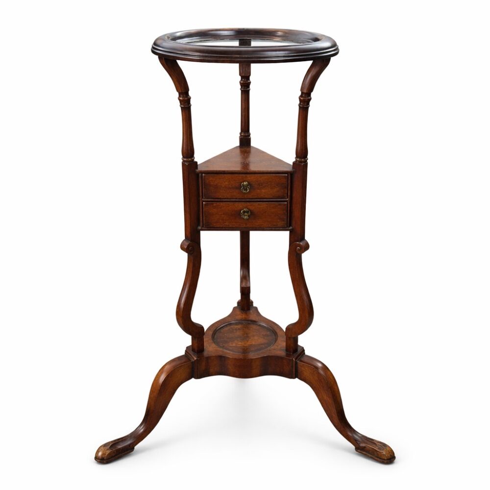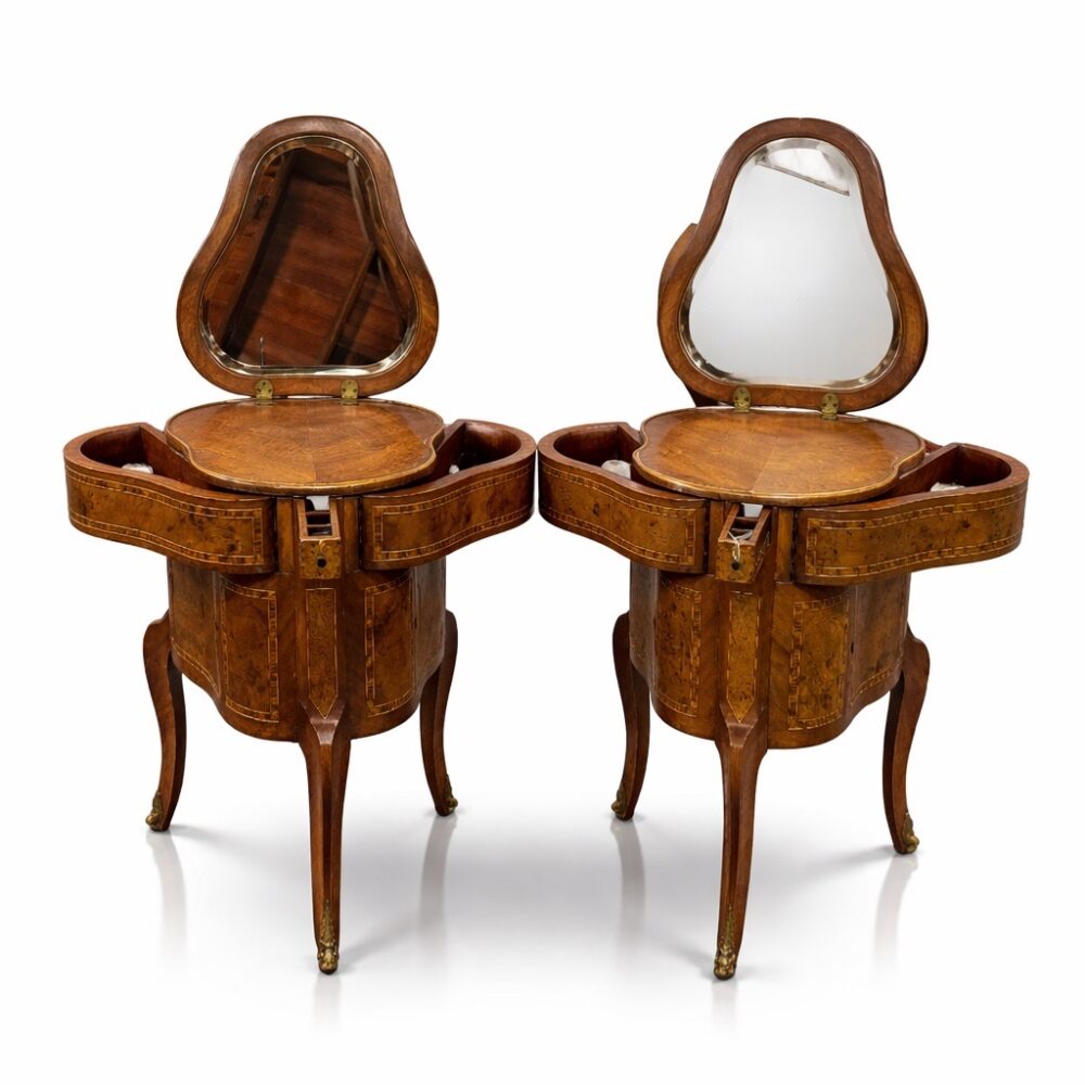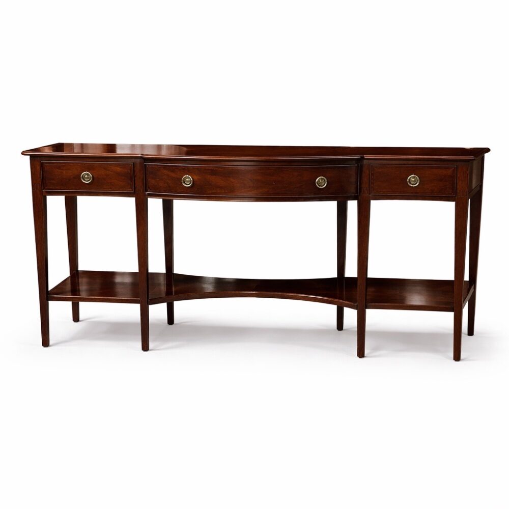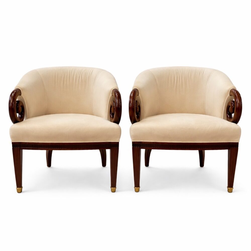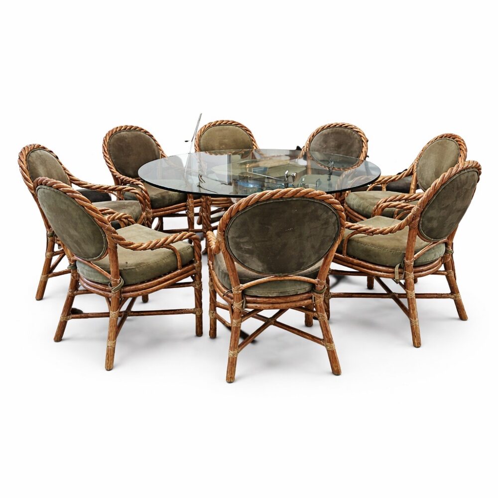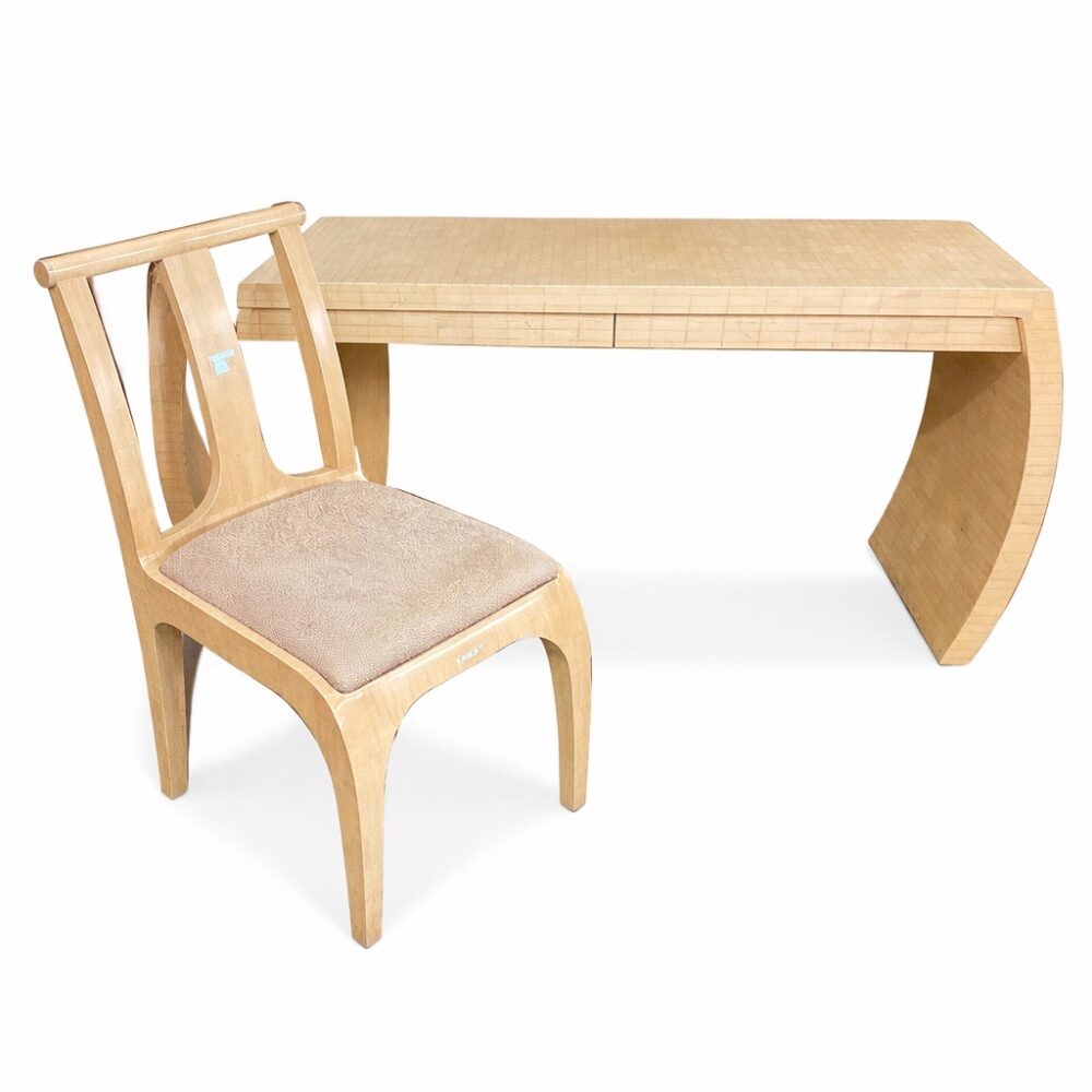 An exceptional furniture offering spans centuries and styles. Highlights include a Lucite cart, Georgian style mahogany wig stand, assorted antique childs chairs, and an Edward Wormley for Dunbar Mid-Century credenza. Discover a set of 8 McGuire cerused twisted rattan lounge chairs, two different size McGuire sheaf of wheat bamboo pedestal and glass top tables, a rosewood and glass top beautifully sculpted table, and a pair Louis XVI style armchairs. Additional standouts include a Brazilian Burlwood mid-century dining table, Lou Hodges style coffee table, set of four lime green barstools with nailhead trim, vintage style French cheesemakers table, set of four Kosuga Japan dining chairs, pair Therien Studios Vitruviam armchairs, green waterfall cocktail table, Enrique Garcel Tesserae desk and chair for Jimeco, vintage Rose Tarlow tiered table, arts and crafts Morris style chair, mission style console table and chair, arts and crafts cabinet and rocking chair, arts and crafts desk, Stickley style Tabouret table, vintage Asian Howdah elephant chair, Japanese nesting tables, custom-made Manheim sideboard, Ralph Lauren seagrass chair, and a pair of Louis XV style table de toilette enforme de coeur.