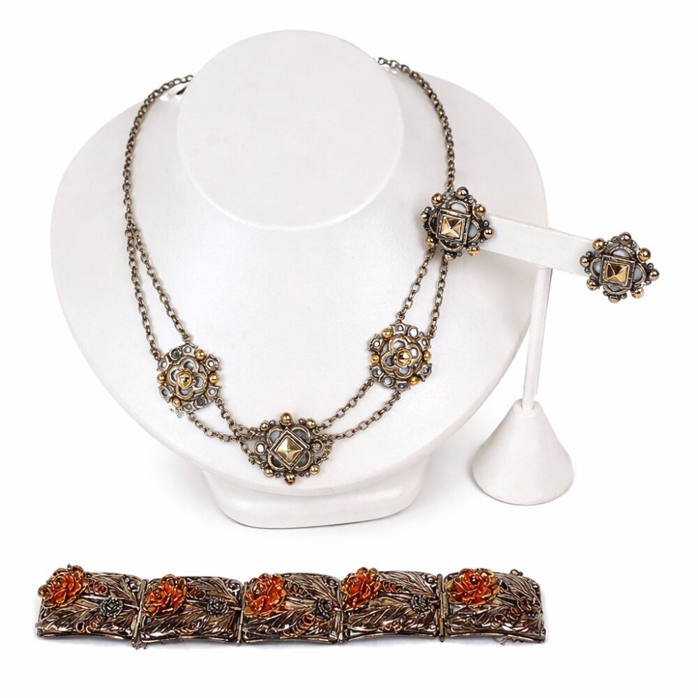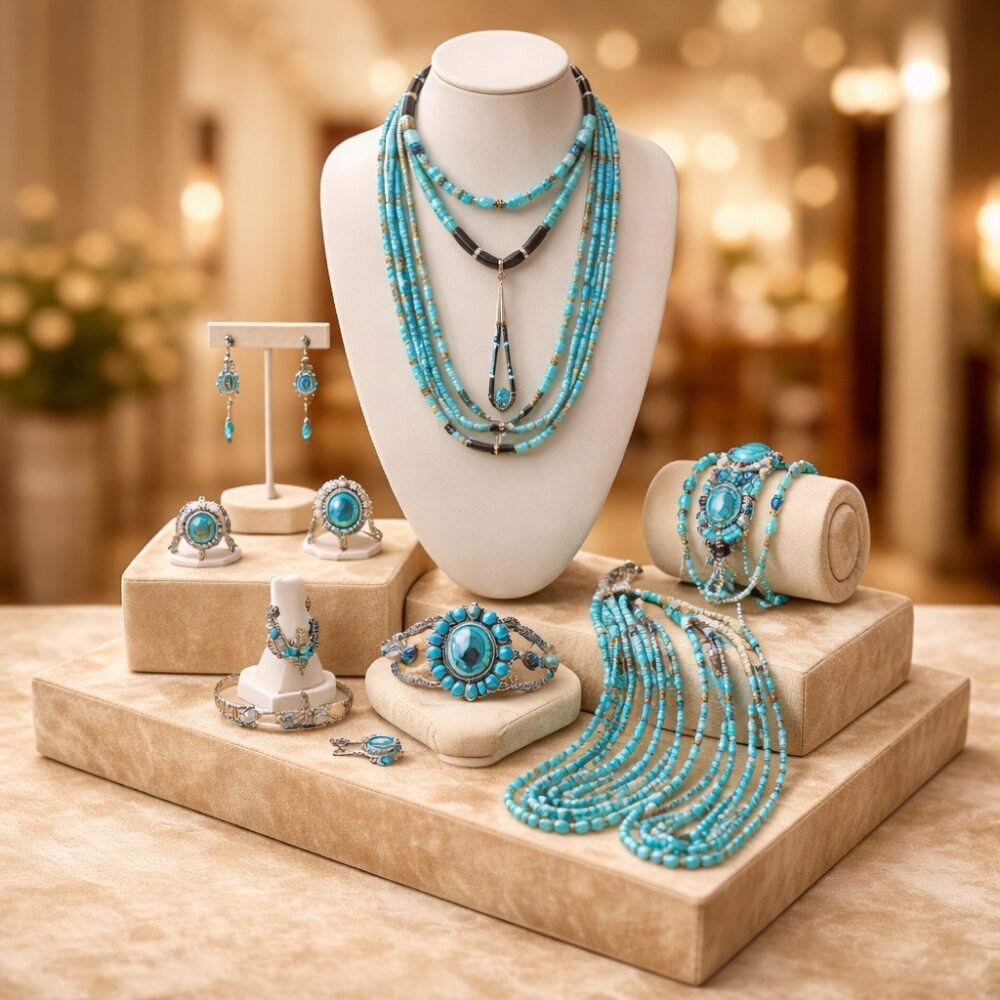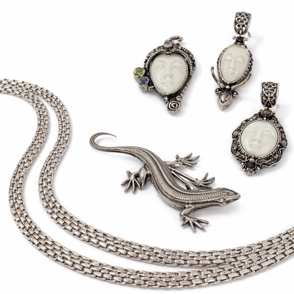 Sterling Silver & Designer Jewelry: Make a statement with vibrant color and iconic design. Sparkle in pink with a designer Michael Dawkins lab created pink sapphire ring, a dazzling pink crystal chandelier necklace, a Judith Ripka mop pink & green cz heart pendant, and a Nolan Miller simulant tanzanite bracelet. The collection continues with vintage crystal tanzanite color earrings, Givenchy ribbed basket vintage earrings, a Tiffany & Co. Atlas band ring, and a sterling silver modernist choker link necklace. Discover character-rich accents including a lizard brooch signed Mexico, a selection of gemstone carved face gemstone pendants, and a remarkable assortment of vintage Navajo beaded necklaces crafted with fine turquoise rondelle and jacla beads, alongside other noteworthy Navajo jewelry pieces such as a sterling silver coral cuff bracelet matched with a Navajo 3-stone coral ring.