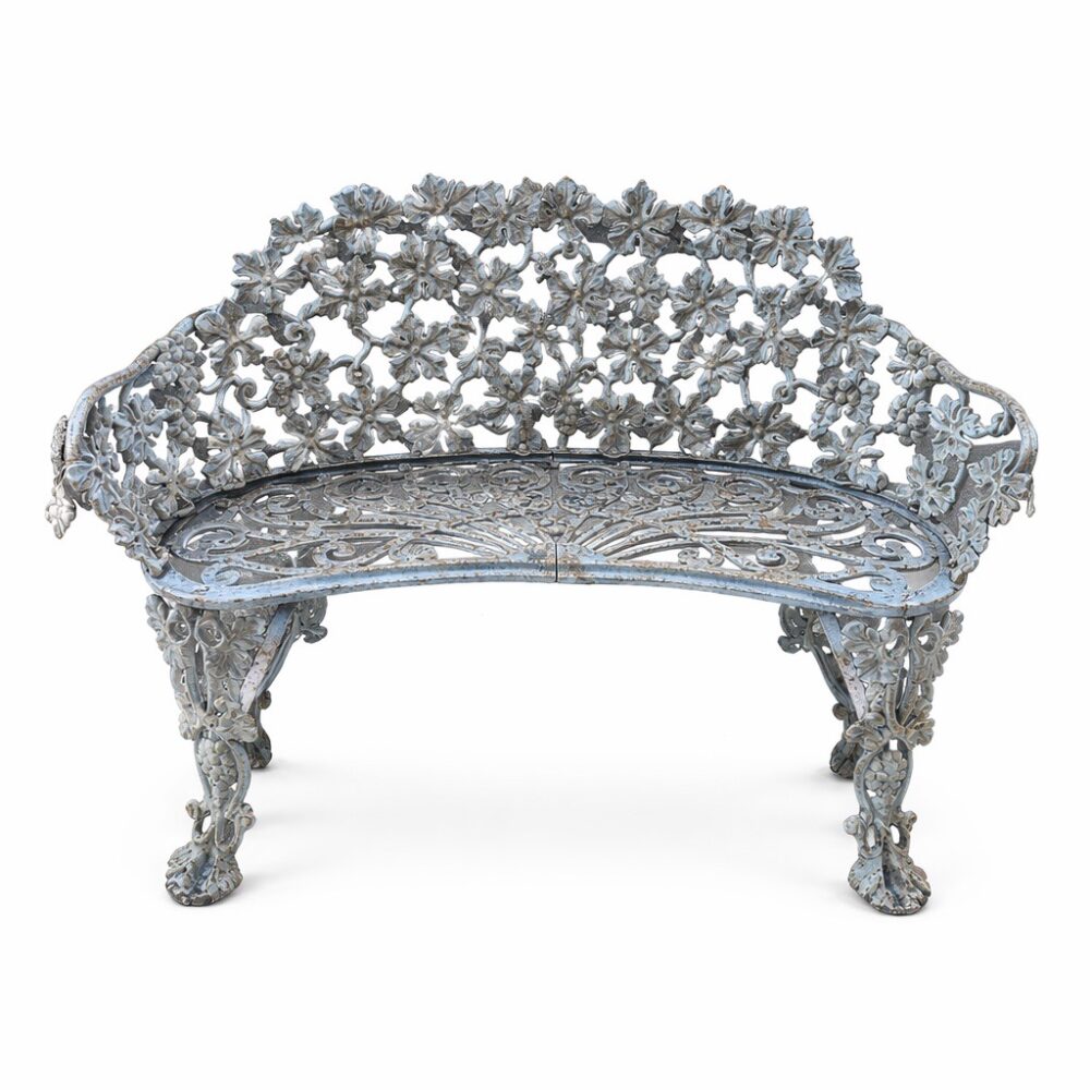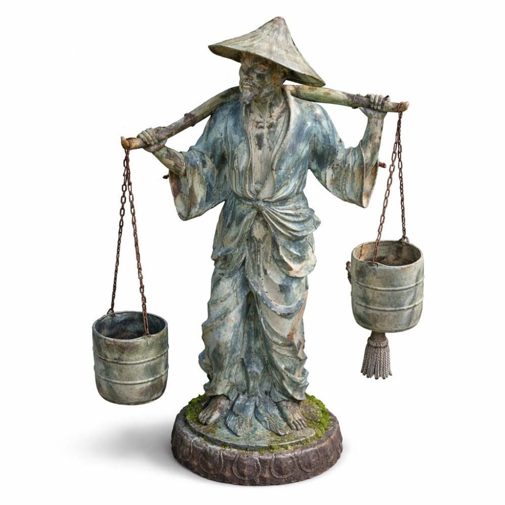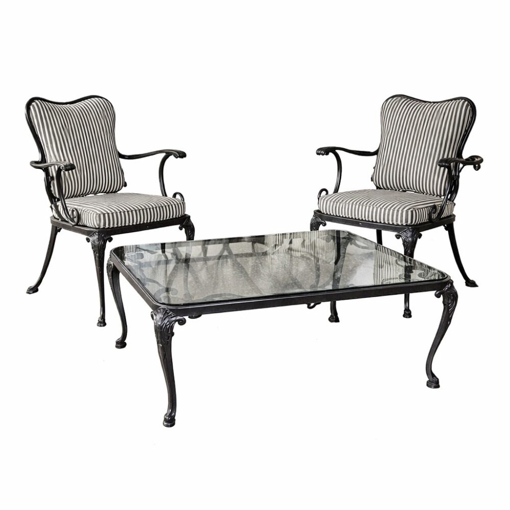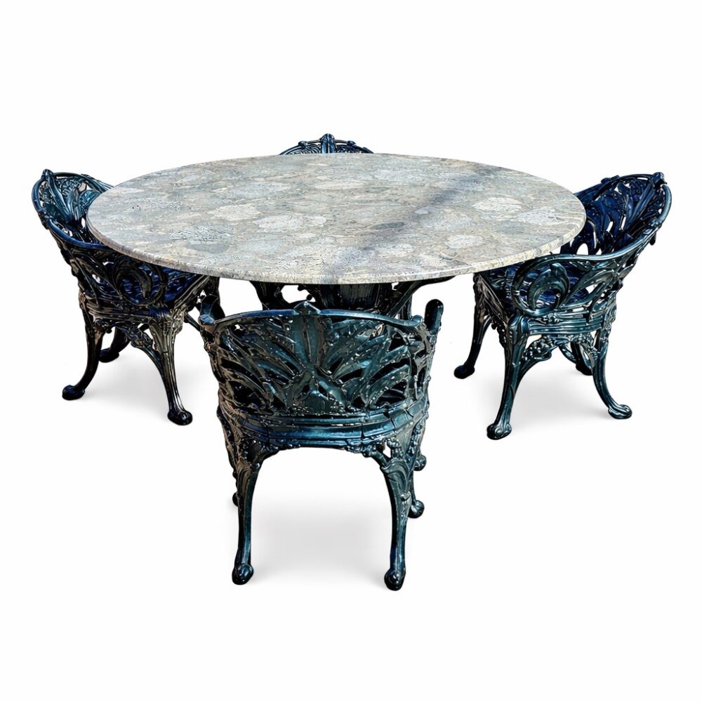 Create an outdoor retreat with a Coalbrookdale table and chairs with marble top, an iron and upholstered seating arrangement, a Chinese water carrier statue, a Brown Jordan glass top patio table and chairs set in “Elegance”, a painted iron garden bench, a spring motif garden plaque, oversized glaze garden pots, and more.