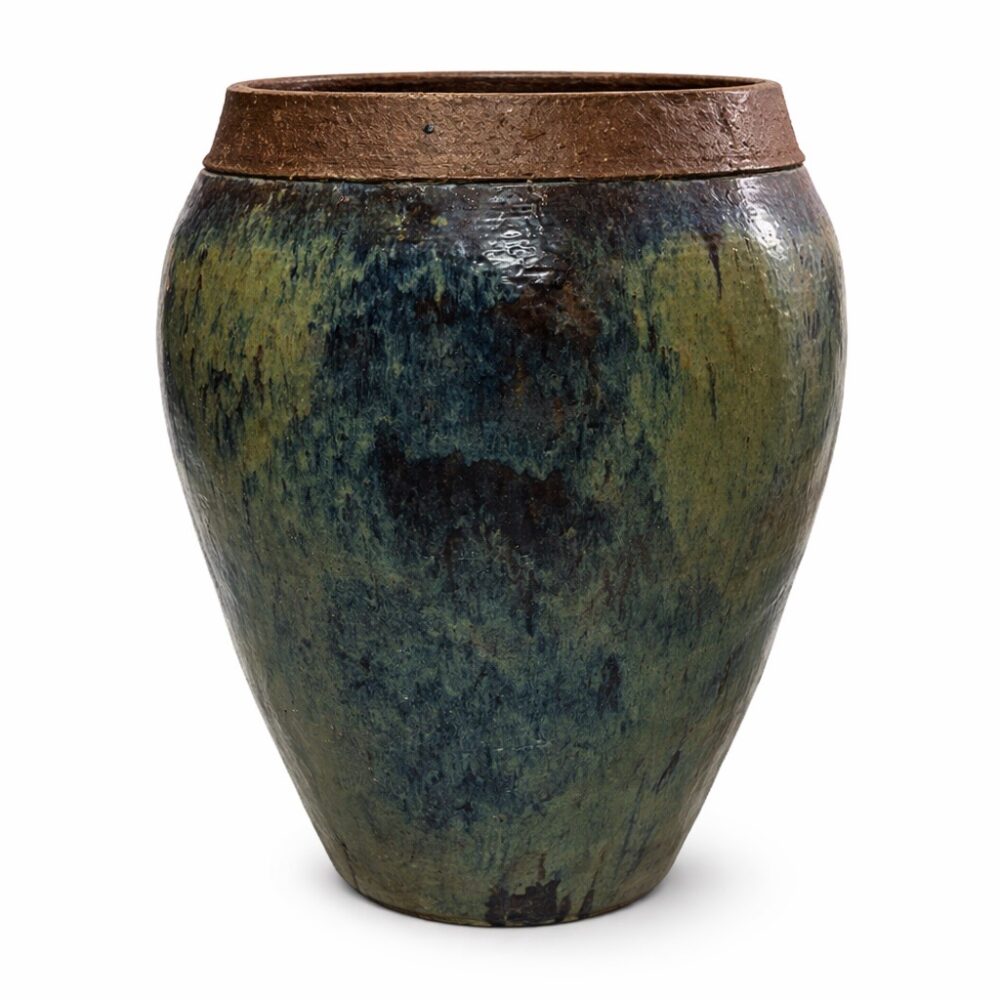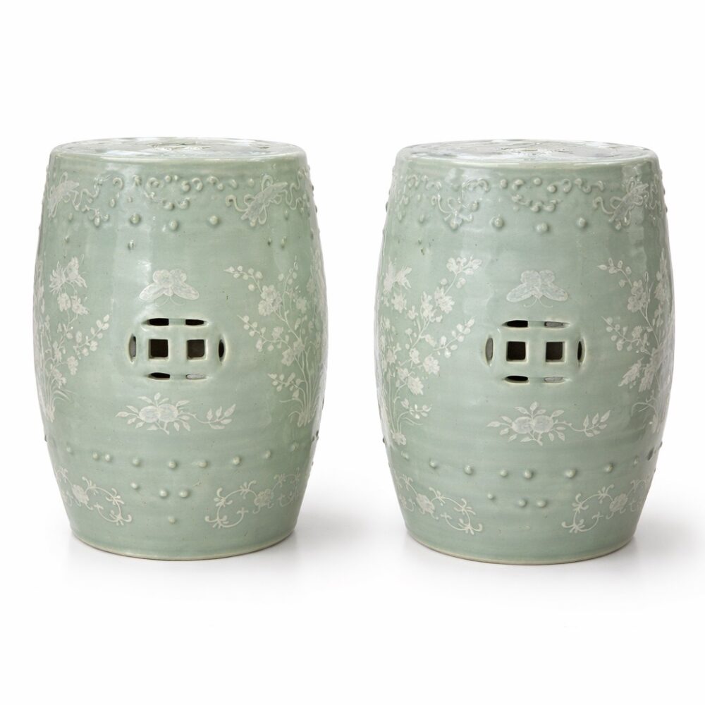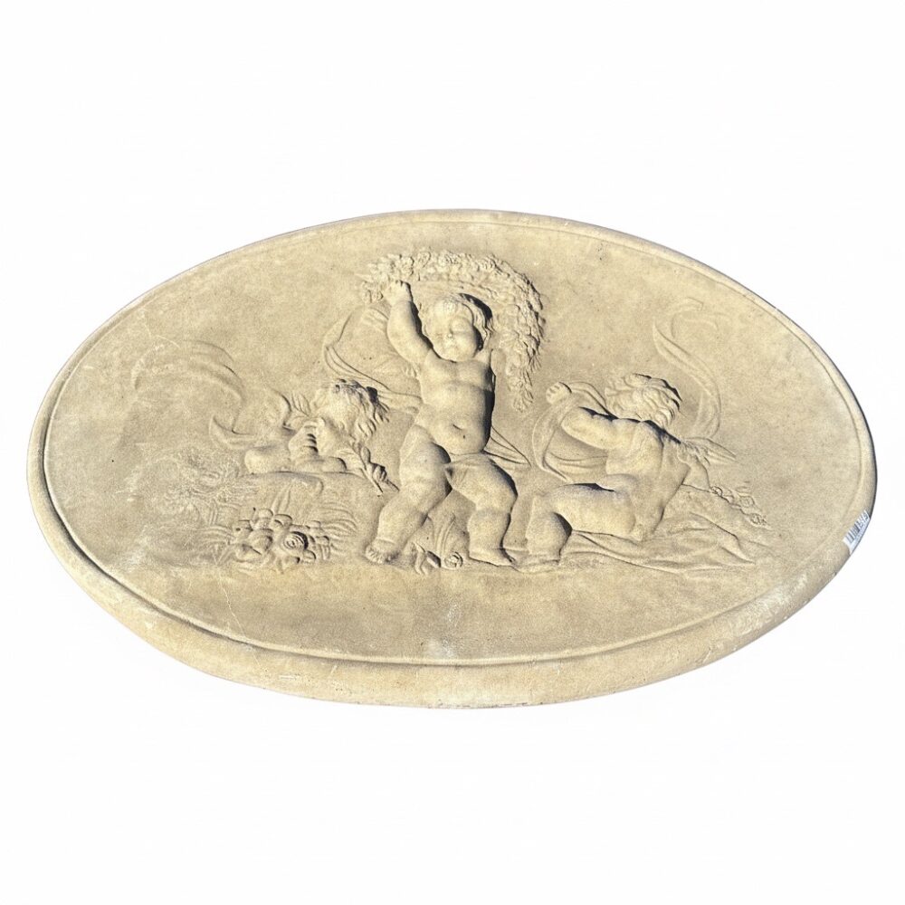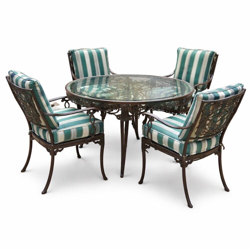 Create an outdoor retreat with a Coalbrookdale table and chairs with marble top, an iron and upholstered seating arrangement, a Chinese water carrier statue, a Brown Jordan glass top patio table and chairs set in “Elegance”, a painted iron garden bench, a spring motif garden plaque, oversized glaze garden pots, and more.