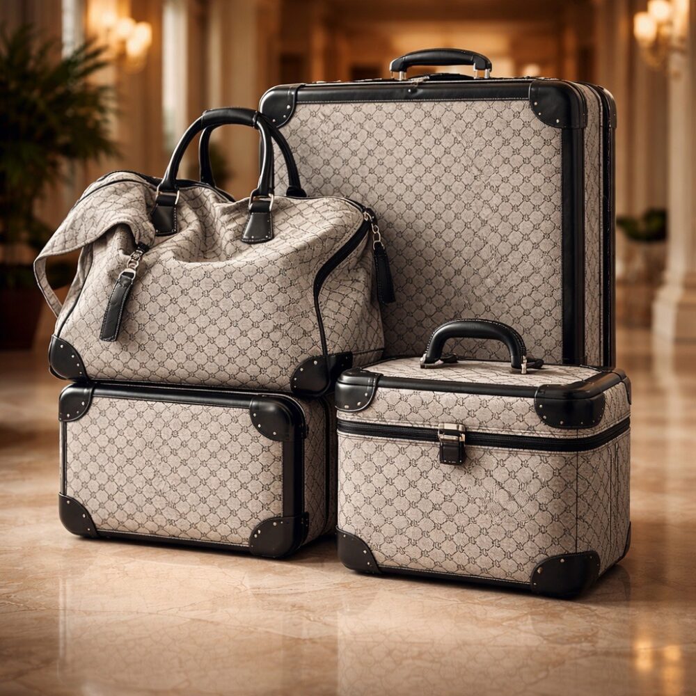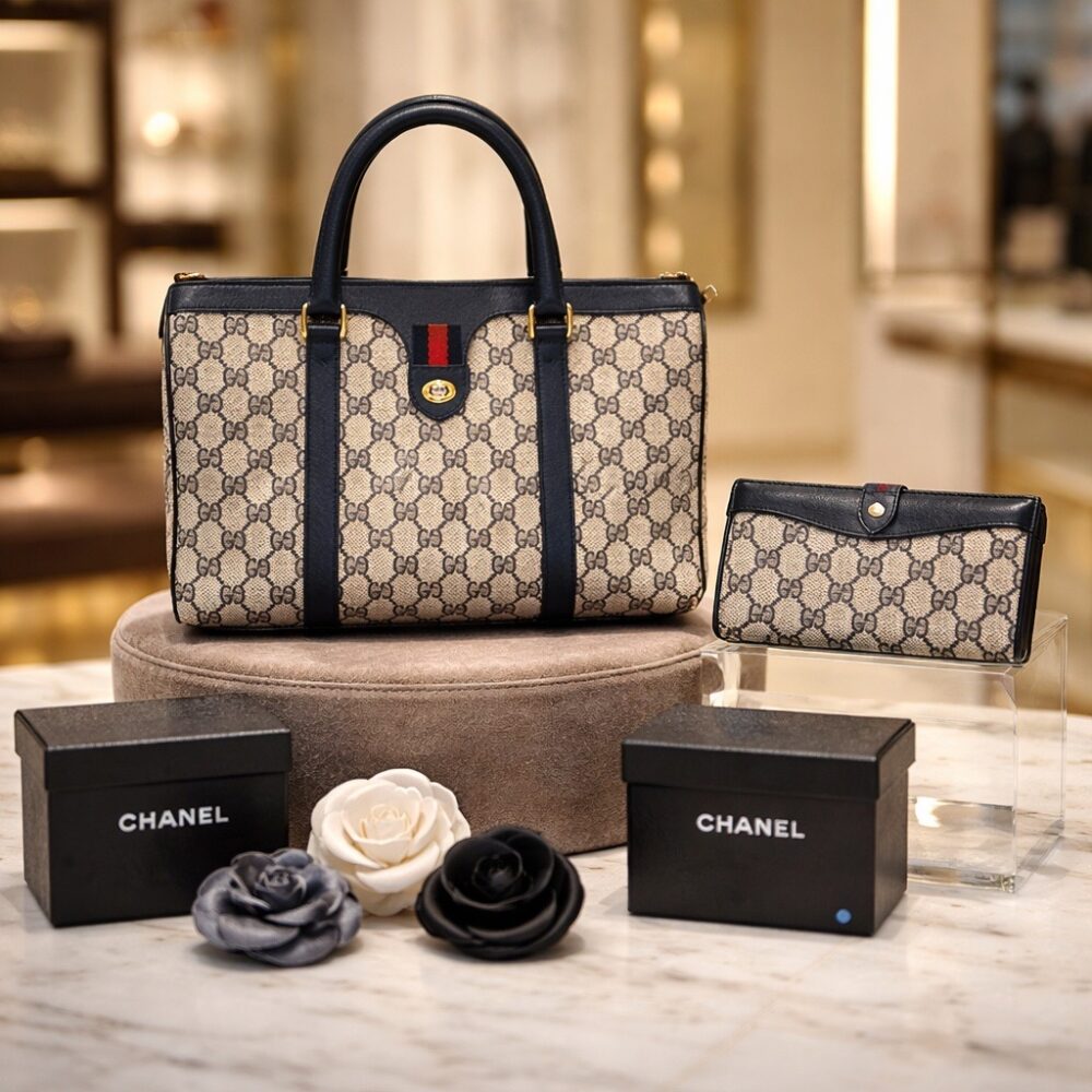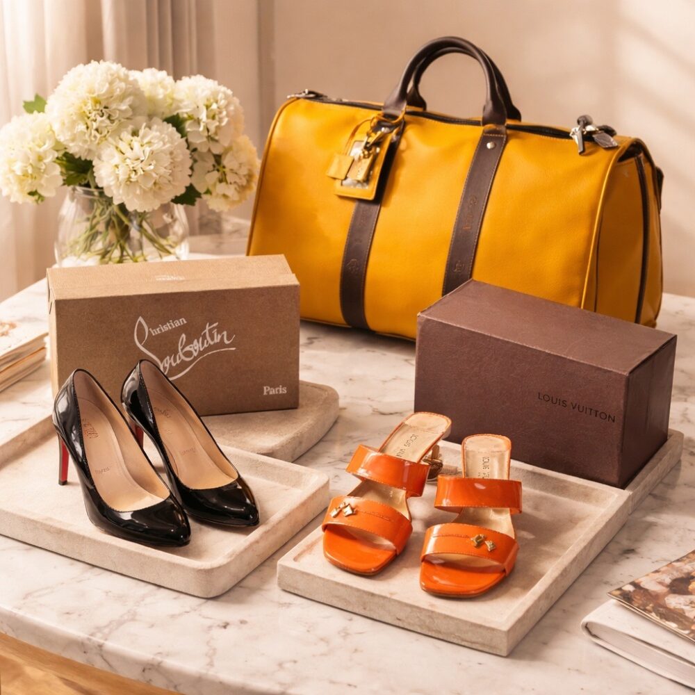 Women’s fashion features a collection of Levi jackets new with tags, cashmere sweaters, a Lucia Rossi black leather jacket with fur collar, a vintage mink stole, and much more. Accessories shine with a full set of luggage by Ralph Lauren, a large Veuve Clicquot tote bag, a vintage blue Gucci handbag and wallet, Louboutin black classic heels, Louis Vuitton orange sandals, and Chanel flower brooches with original boxes.
